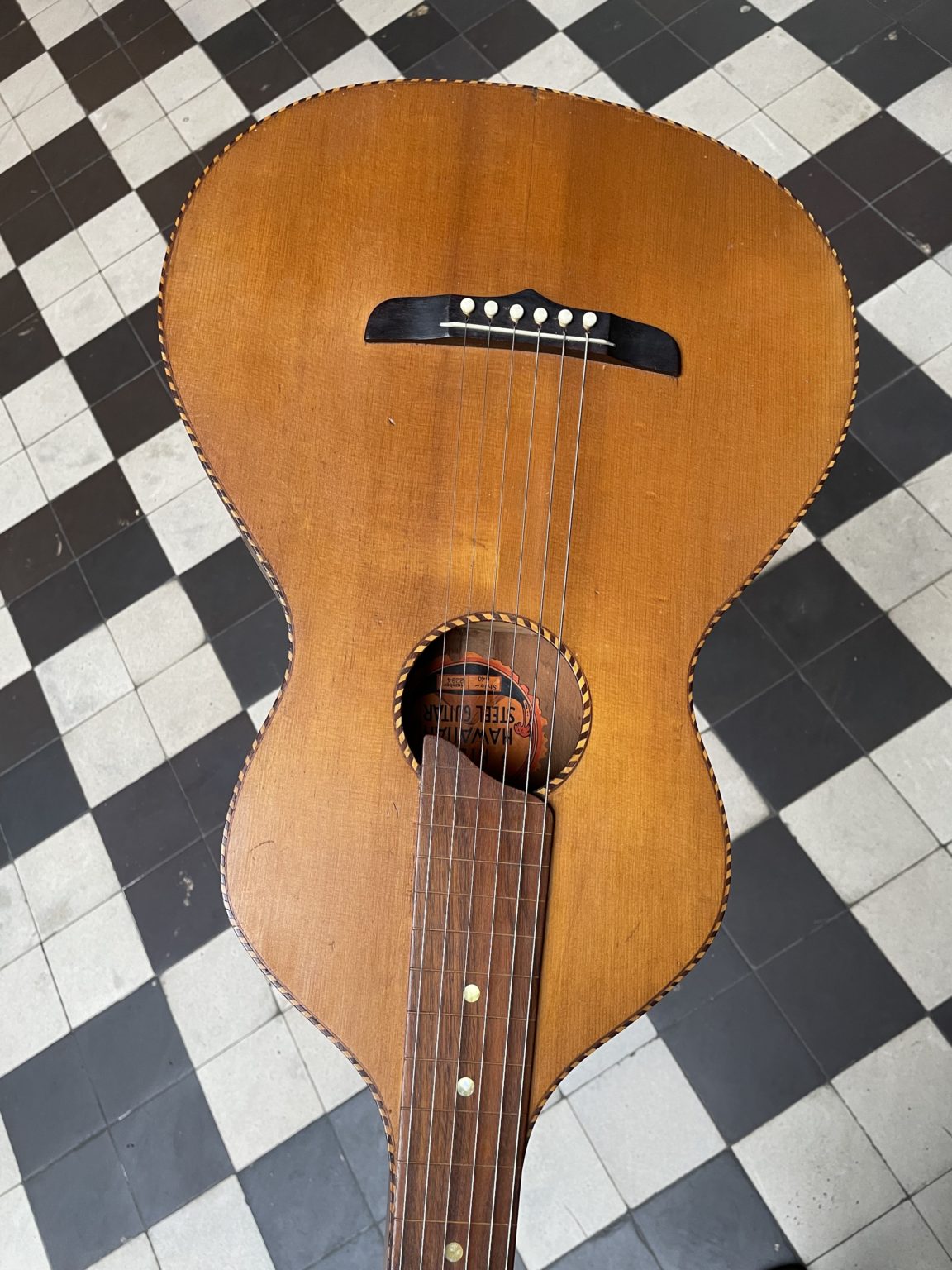 Following the 1915 Pan Pacific International Exposition, held in San Francisco, America was hit with full force by the Hawaiian music craze – and suddenly, everyone wanted instruments to get their fill of Old Hawaii! Thus was born the Hawaiian steel guitar, from the work of luthiers such as Chris Knutsen and Hermann Weissenborn. These guitars were intended to be played flat on the musician’s lap using a slide, and a unique feature was that they had square, hollow necks which were intended to amplify their resonance. Meanwhile, far from the sunny coasts of Oregon and California where the aforementioned instruments were built, another builder was hard at work: in the city of Boston, the Oscar Schmidt Company produced a wide variety of instruments under various brands – guitars, mandolins, banjos, ukuleles, and the infamous Hawaiian guitars! All of these instruments were mainly sold door-to-door by travelling salesmen, in remote corners of the USA which often did not have any music stores at the time. Under the Hilo Hawaiian Steel Guitar brand, several models were produced in varying degrees of elaboration and woods used.
