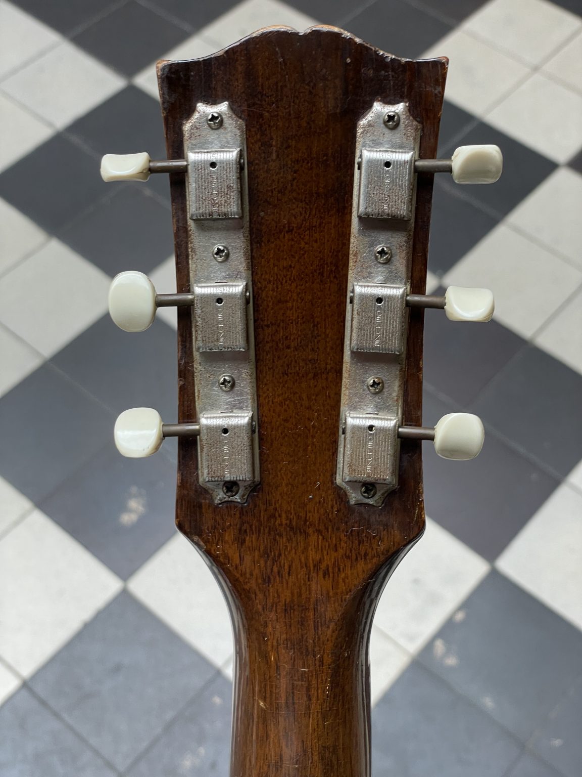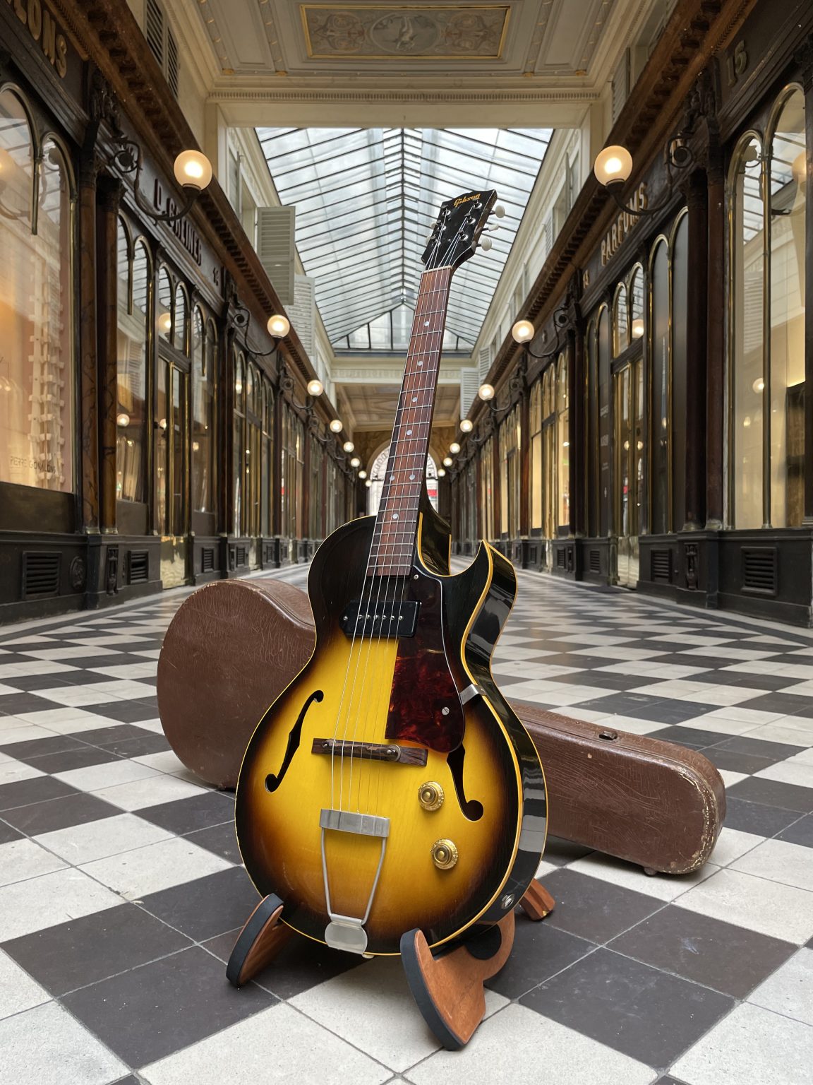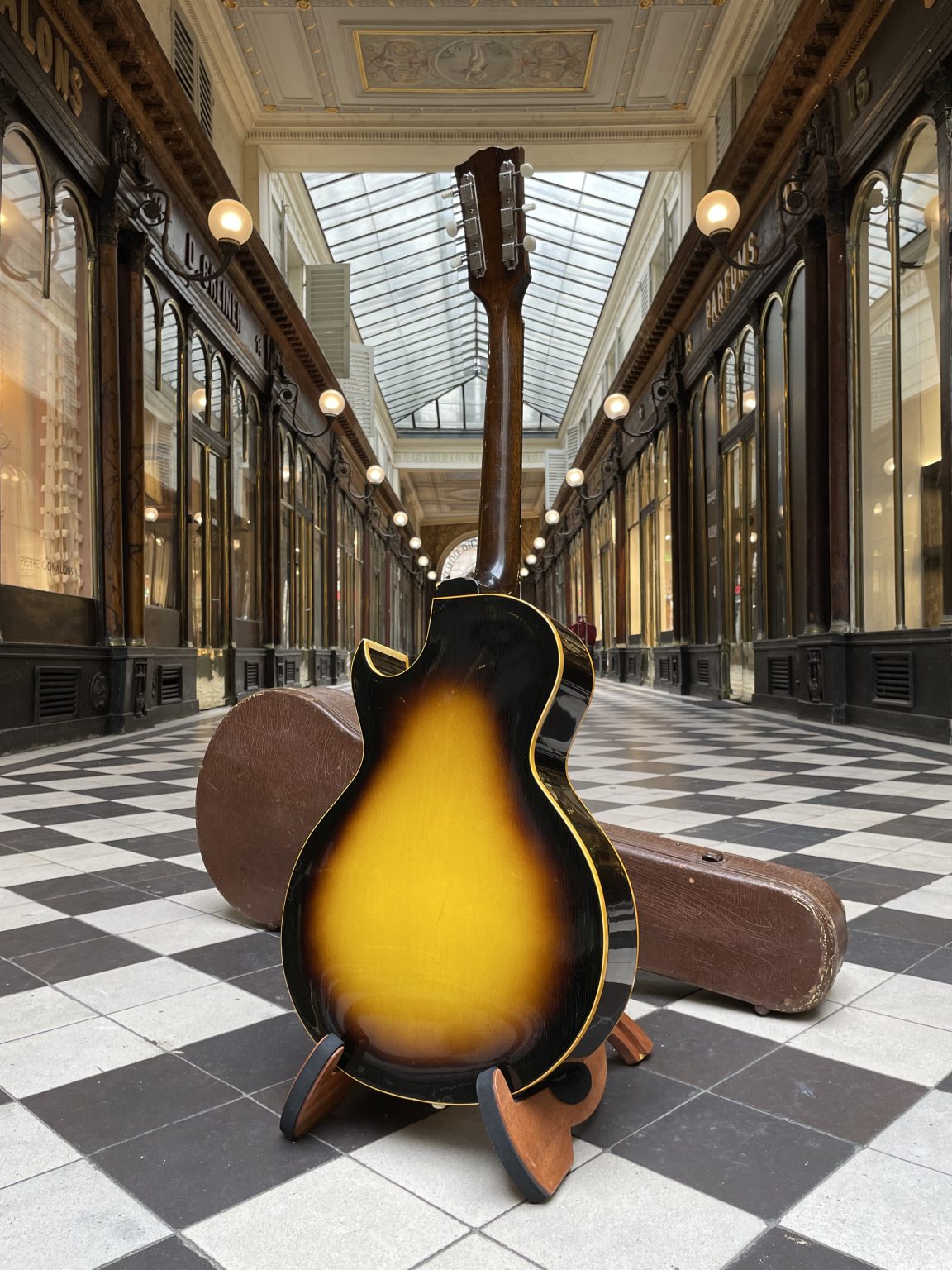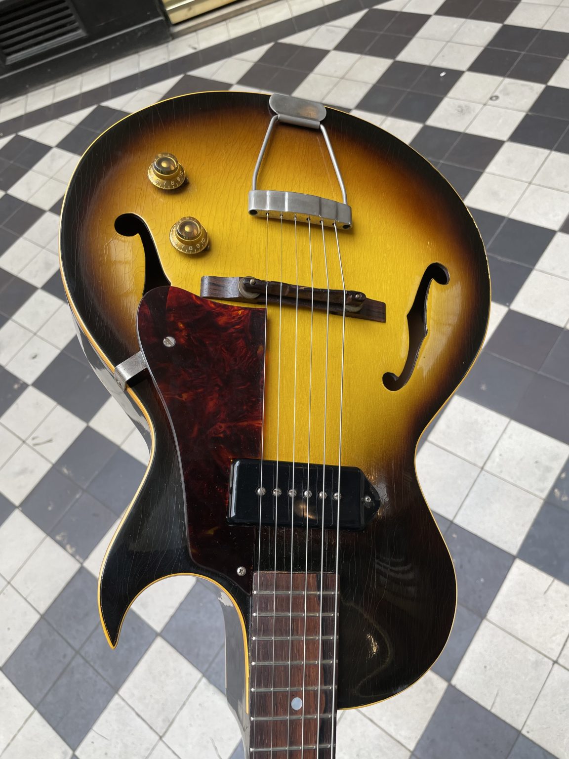 The ES-140 is one of the most eccentric creations offered by Gibson during the 1950s – the first 3/4-size hollowbody electric model built in Kalamazoo, described in the catalog as being perfect for younger players, or for adults with small fingers. The ES-140 was introduced in 1950 and followed directly on the heels of the ES-175 model, launched the previous year as a mid-range guitar aimed at professionals but with less flash than high-end models like the ES-350 or ES-5. CMI, Gibson’s parent company, presents the instrument as an exact replica, three-quarters the size of the ES-175. It would be wrong to underestimate this small guitar, which indeed boasts all the attributes of a fully professional-quality instrument: a maple body in a beautiful sunburst finish; a one-piece mahogany neck with a Brazilian rosewood fingerboard; a single P-90 pickup, typical of Gibson’s post-war years and which, especially for models from the 1950s, delivers an unmistakable, warm, and immediate tone. This is combined with the instrument’s original wiring, which includes a volume and tone control; it also features the original hardware, including the tailpiece, the adjustable rosewood bridge, and the Kluson Deluxe tuners.
