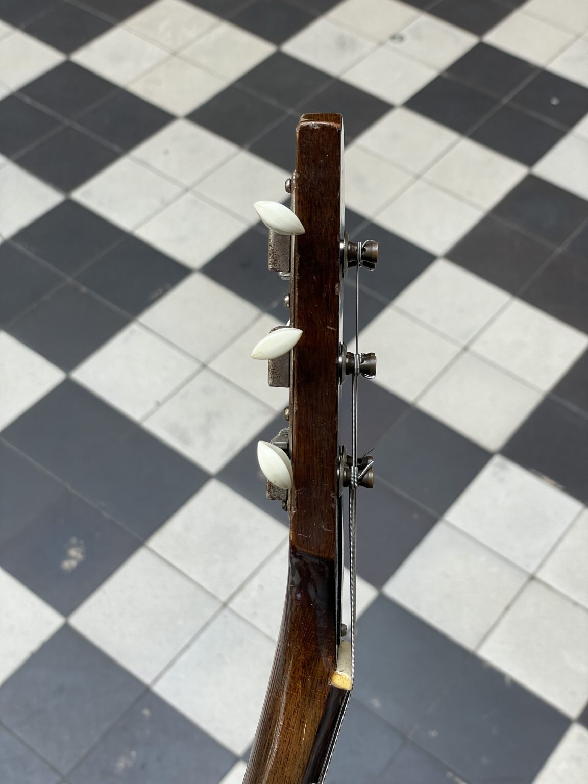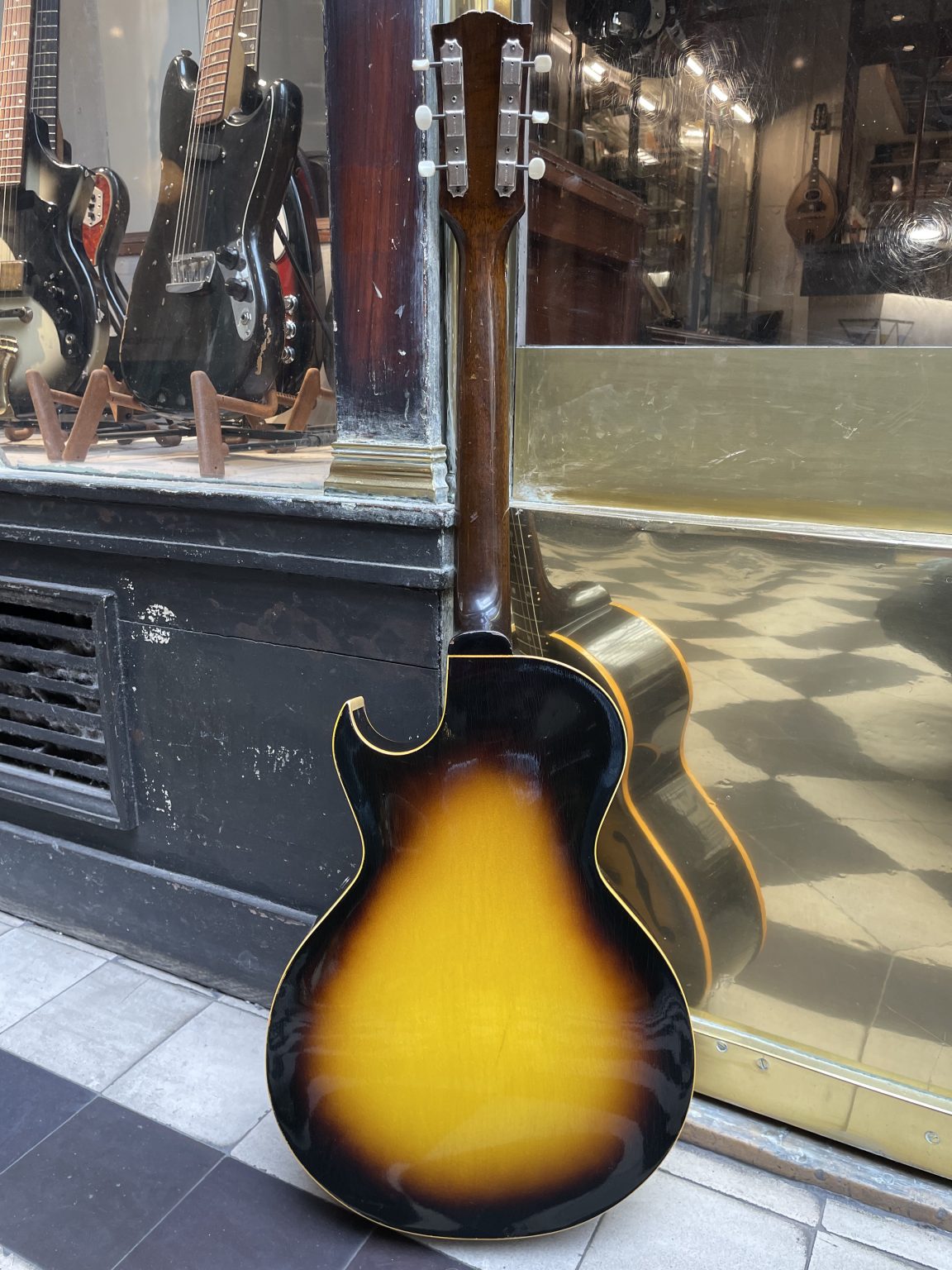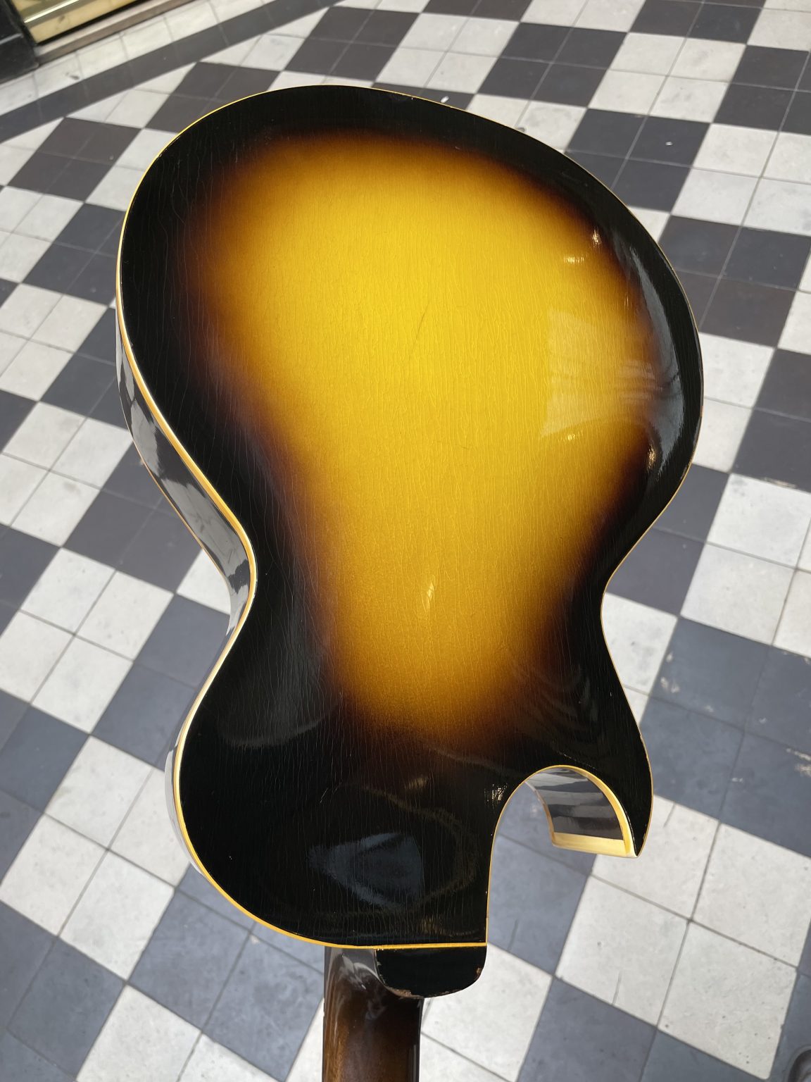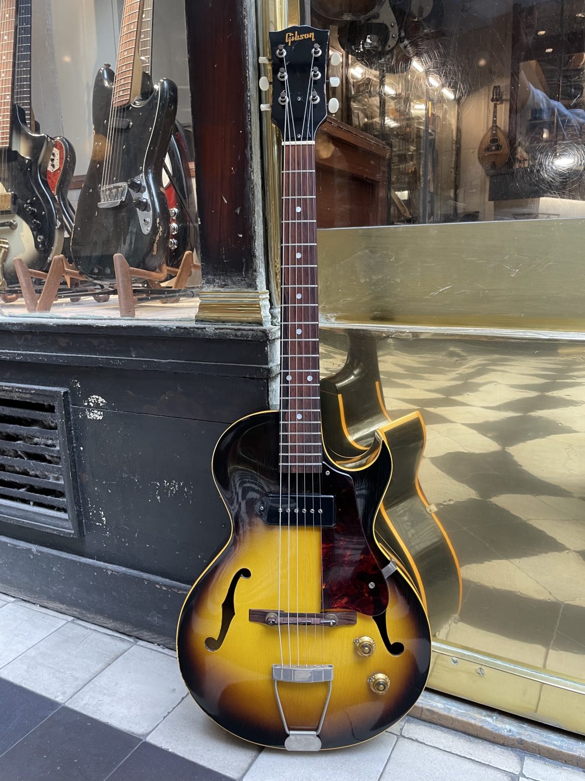 The ES-140 is one of the most eccentric creations offered by Gibson during the 1950s – the first 3/4-size hollowbody electric model built in Kalamazoo, described in the catalog as being perfect for younger players, or for adults with small fingers. The ES-140 was introduced in 1950 and followed directly on the heels of the ES-175 model, launched the previous year as a mid-range guitar aimed at professionals but with less flash than high-end models like the ES-350 or ES-5. CMI, Gibson’s parent company, presents the instrument as an exact replica, three-quarters the size of the ES-175. It would be wrong to underestimate this small guitar, which indeed boasts all the attributes of a fully professional-quality instrument: a maple body in a beautiful sunburst finish; a one-piece mahogany neck with a Brazilian rosewood fingerboard; a single P-90 pickup, typical of Gibson’s post-war years and which, especially for models from the 1950s, delivers an unmistakable, warm, and immediate tone. This is combined with the instrument’s original wiring, which includes a volume and tone control; it also features the original hardware, including the tailpiece, the adjustable rosewood bridge, and the Kluson Deluxe tuners.