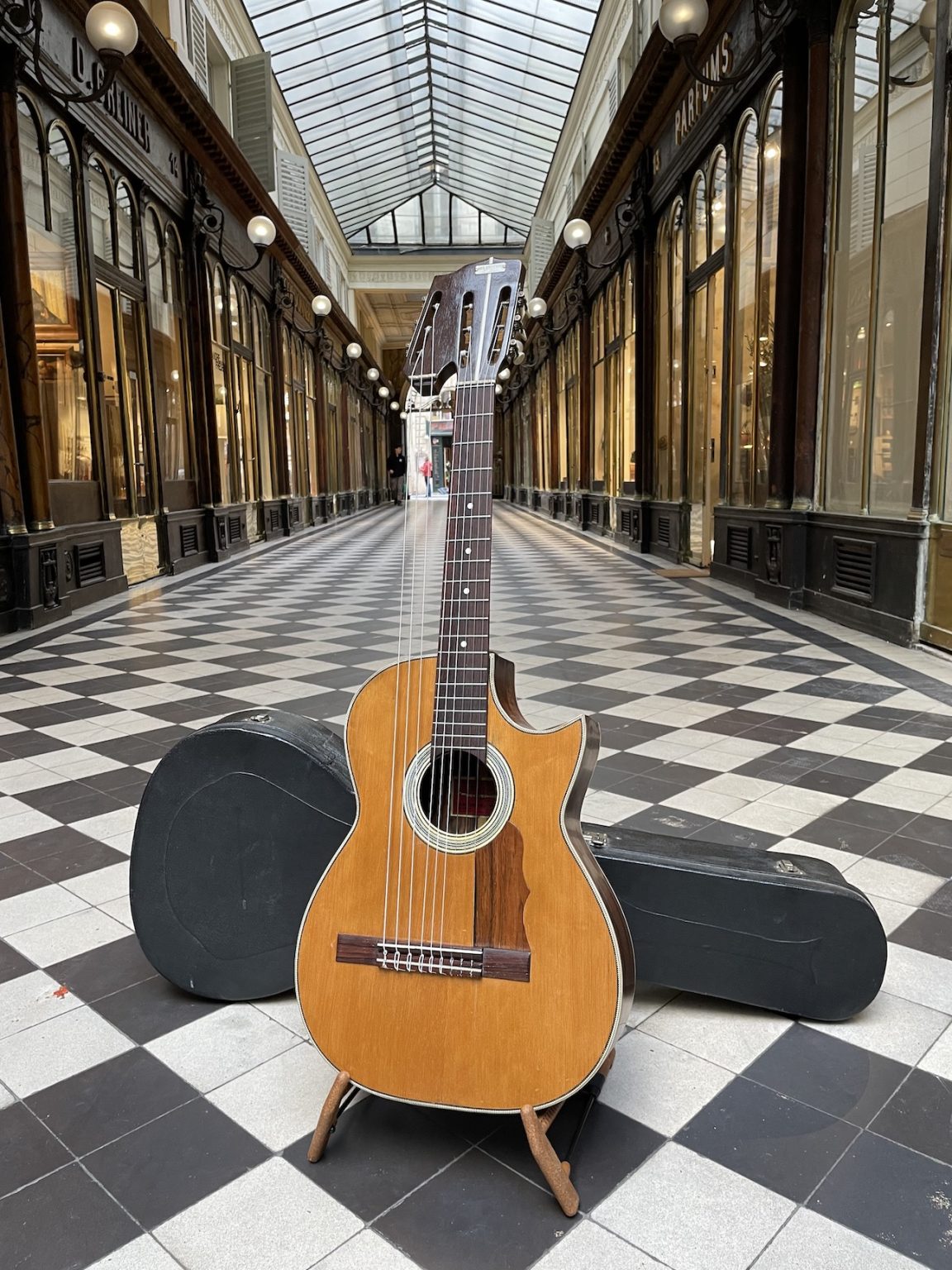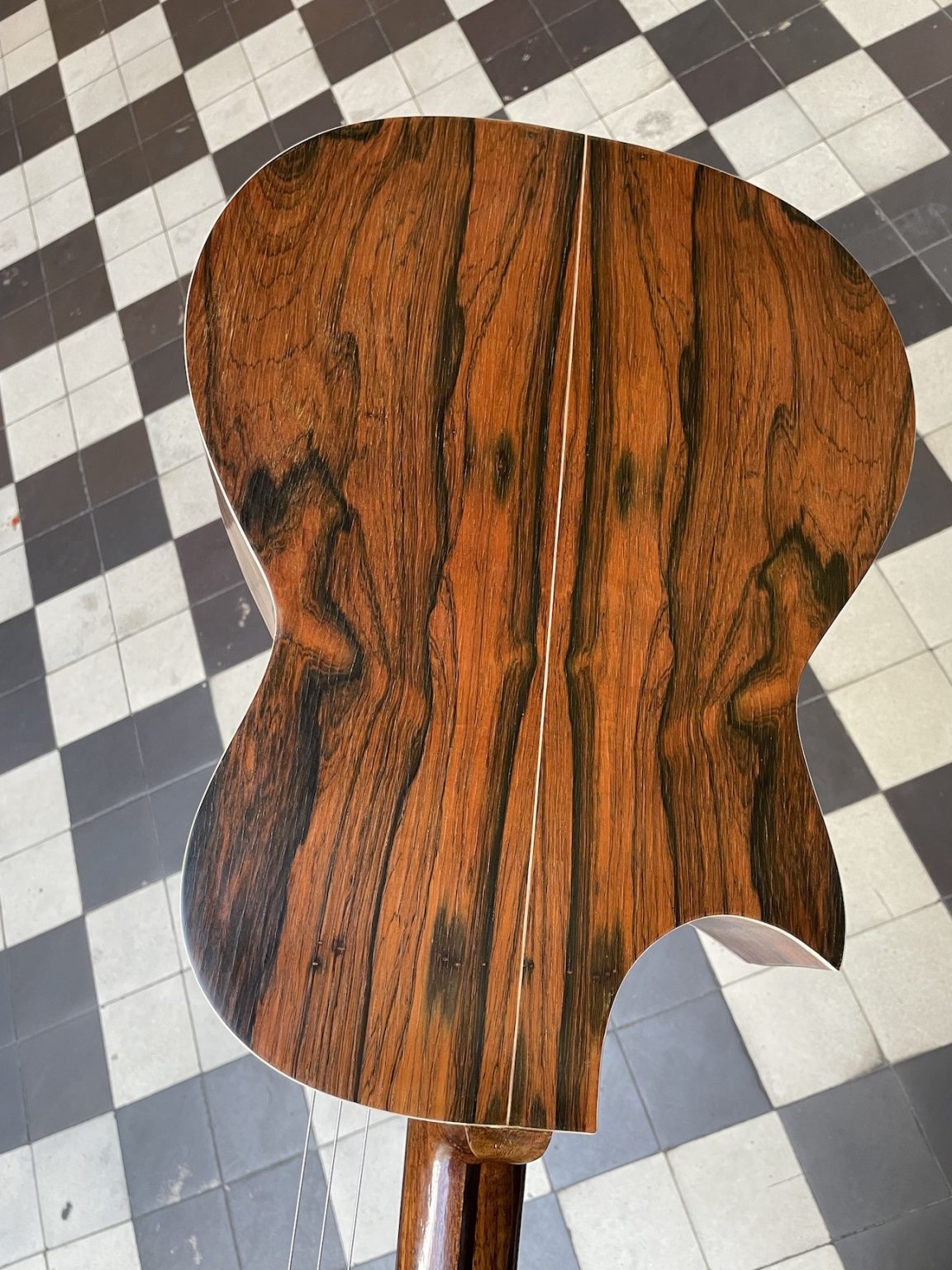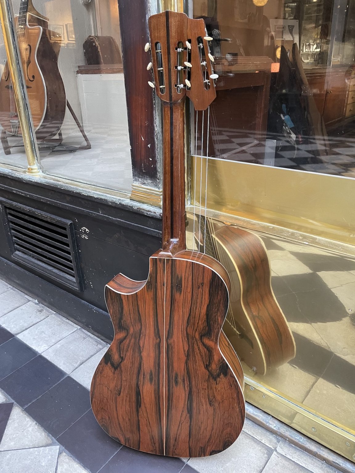 The present instrument is very peculiar: built around a guitar body made from beautiful wood – spruce top and figured rosewood sides and back -, it has an extension on the side of the headstock allowing for three floating bass strings on the side of the fretboard .