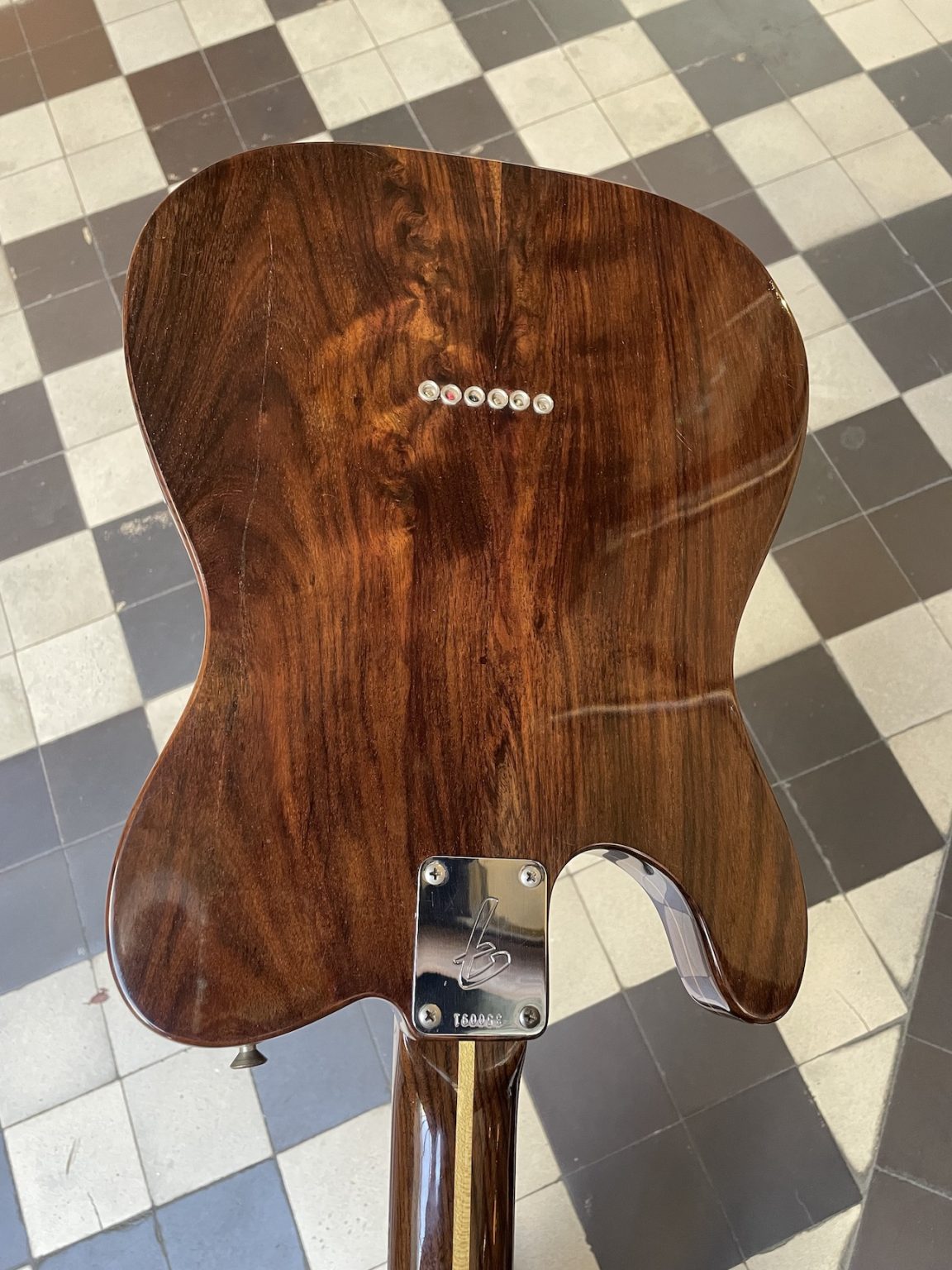 Upon realizing the potential of the Rosewood Tele, Fender decided to launch a short production run of the model which lasted from ’69 to ’72. The body was initially made of two slabs of rosewood with a sheet of maple sandwiched between them – although due to the weight of the guitar the bodies were later chambered (as is the case on the present guitar). The neck is made from a single piece of rosewood, routed in the back to install the truss rod and covered with a distinctive maple skunk stripe.