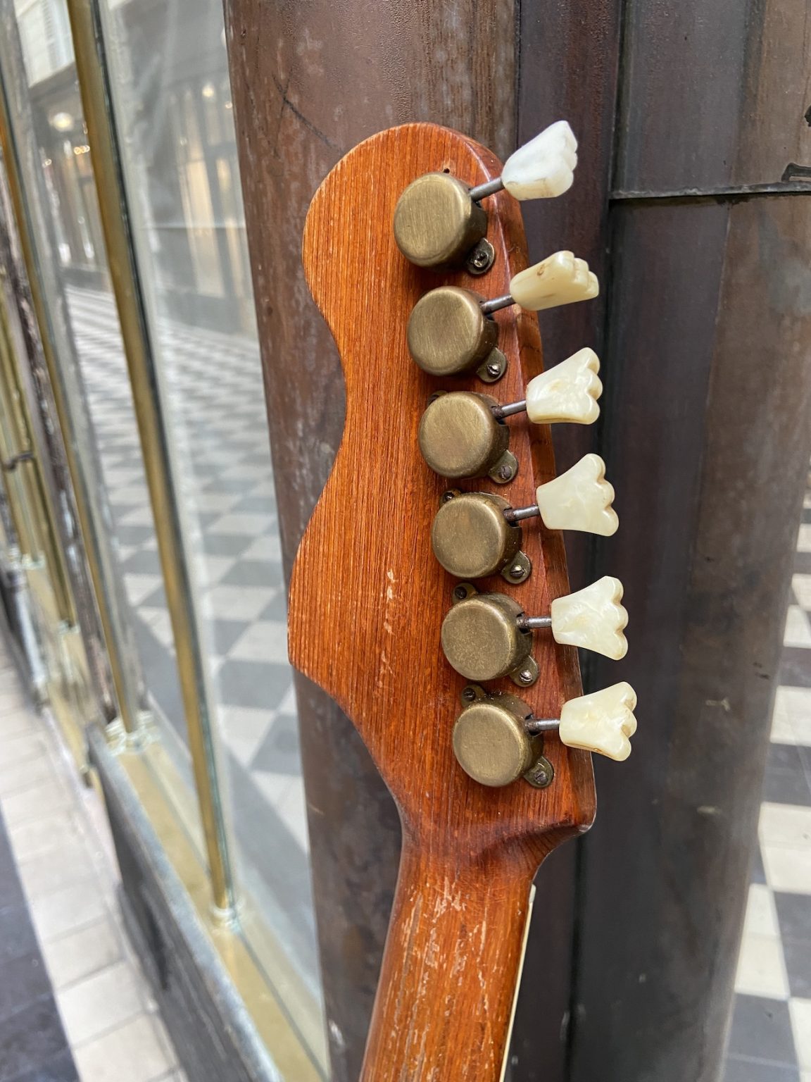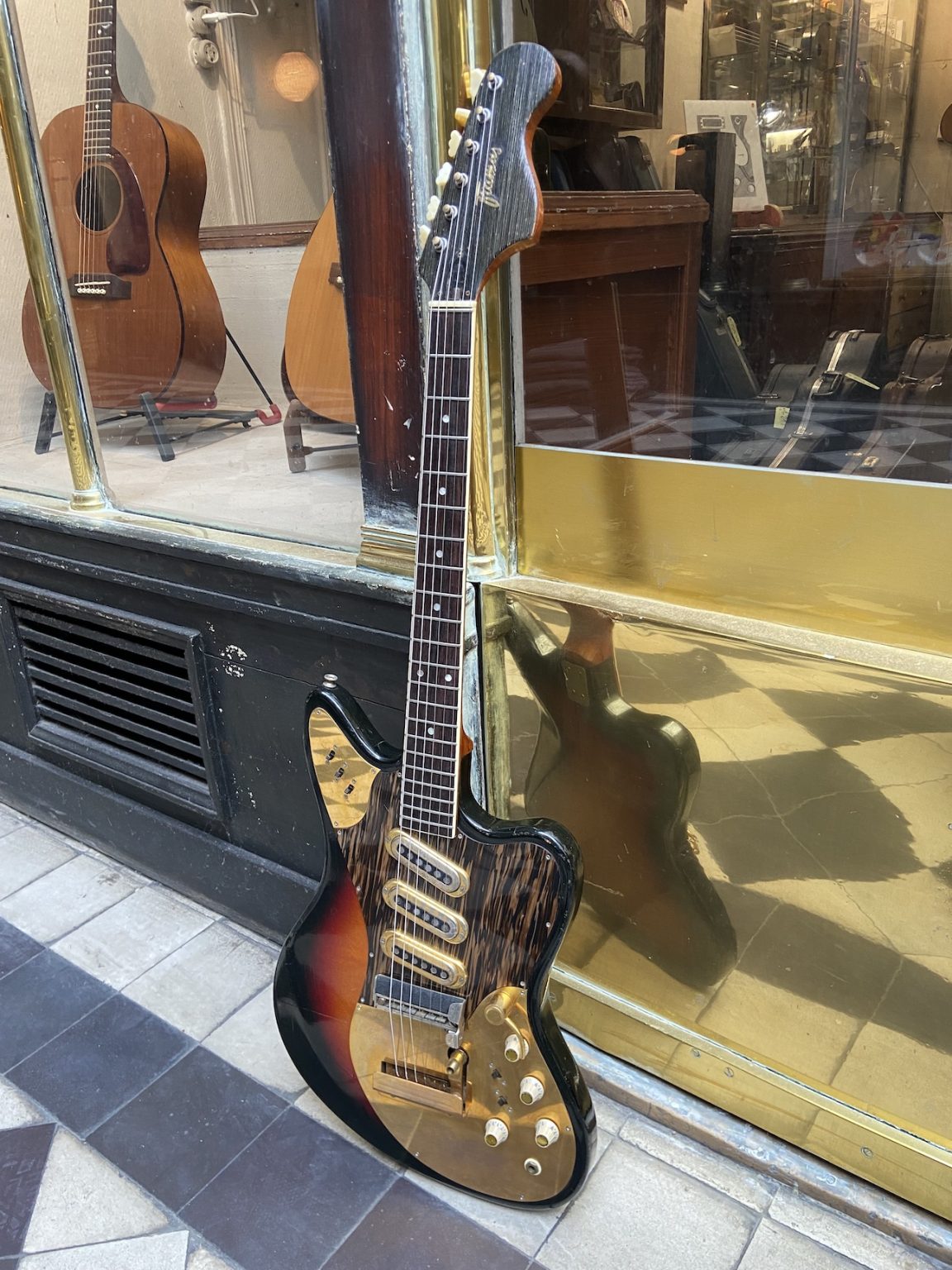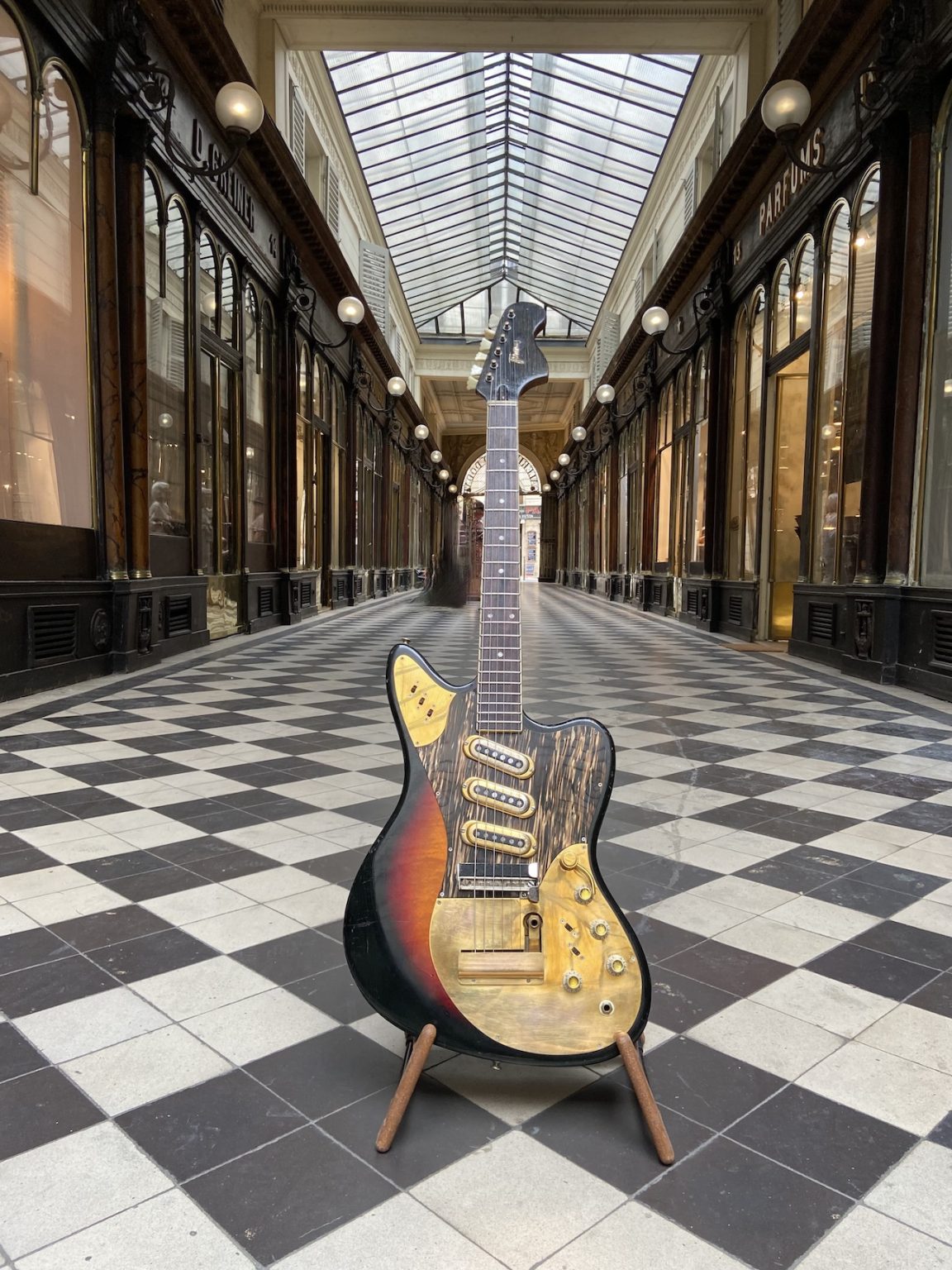 The present guitar comes in a beautiful Sunburst and gold-plated hardware, three single coil pickups each with its tone control and On/Off selector switch, a master volume control, tone capacitor selector switches for the bridge and neck pickups and a volume control mounted on a spring allowing for a “swell” effect on the middle pickup.