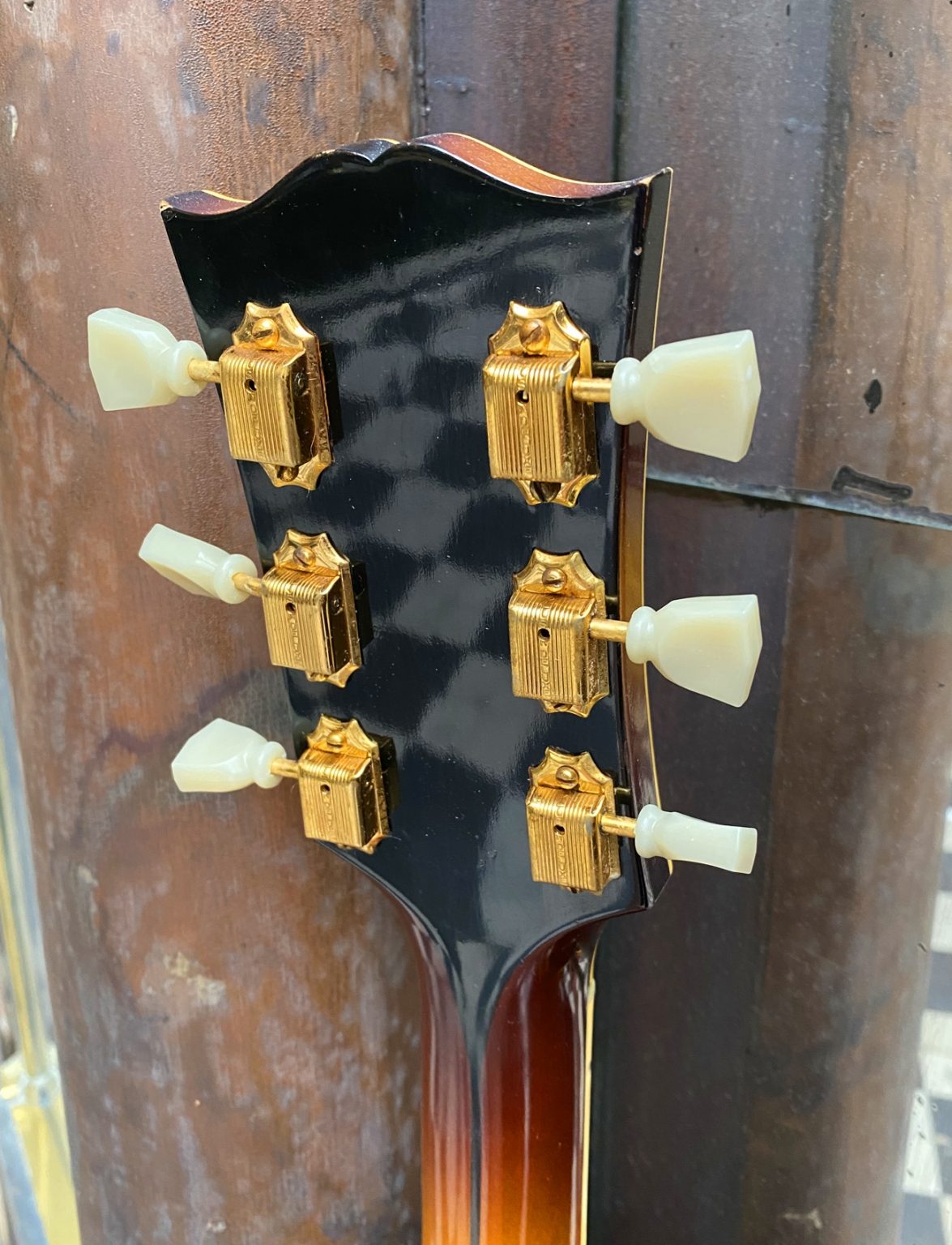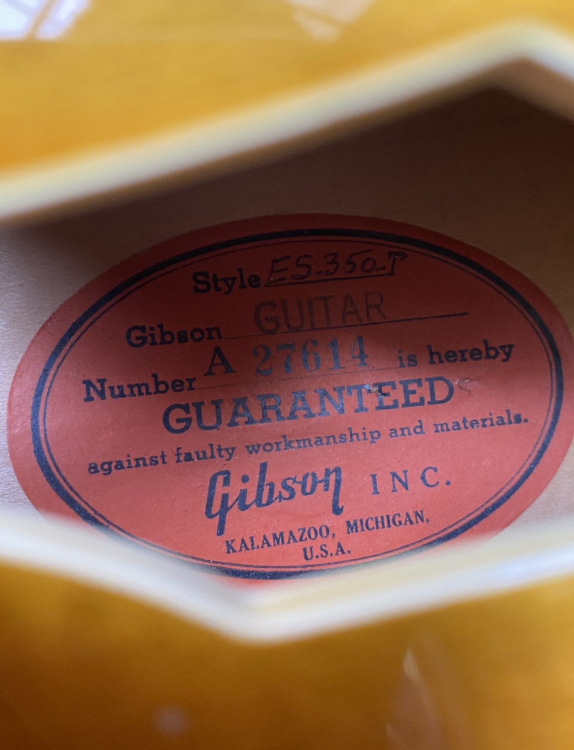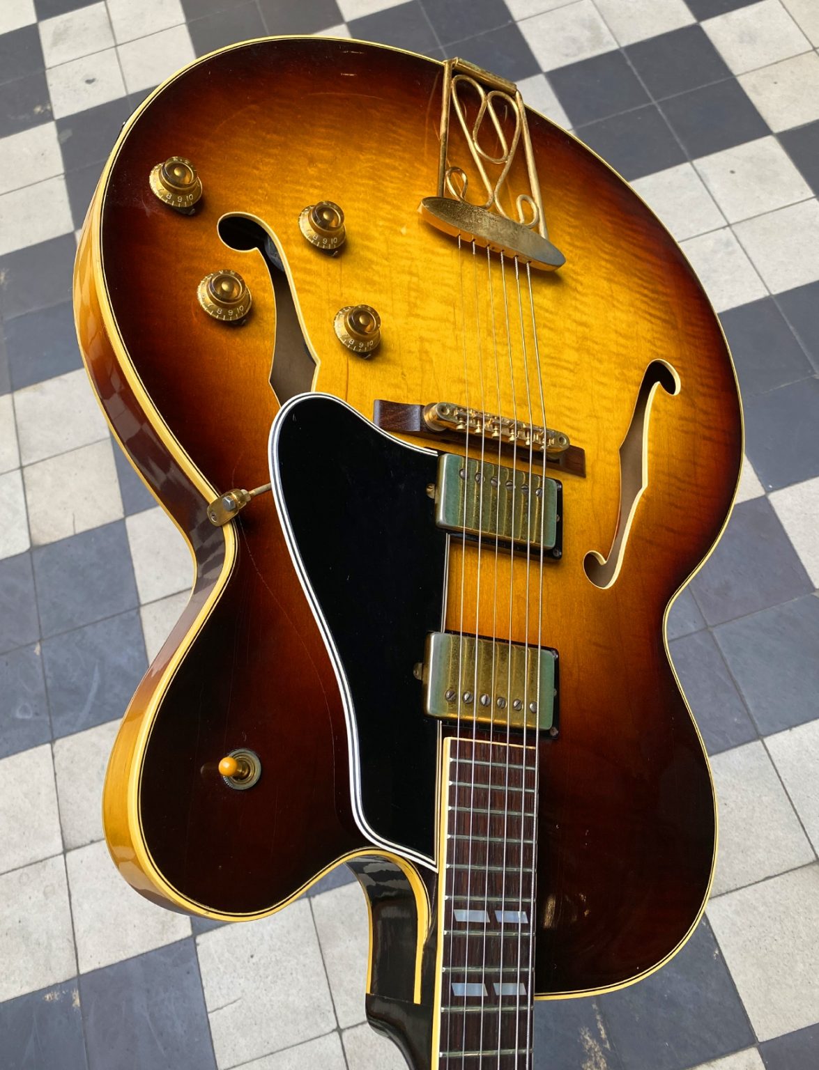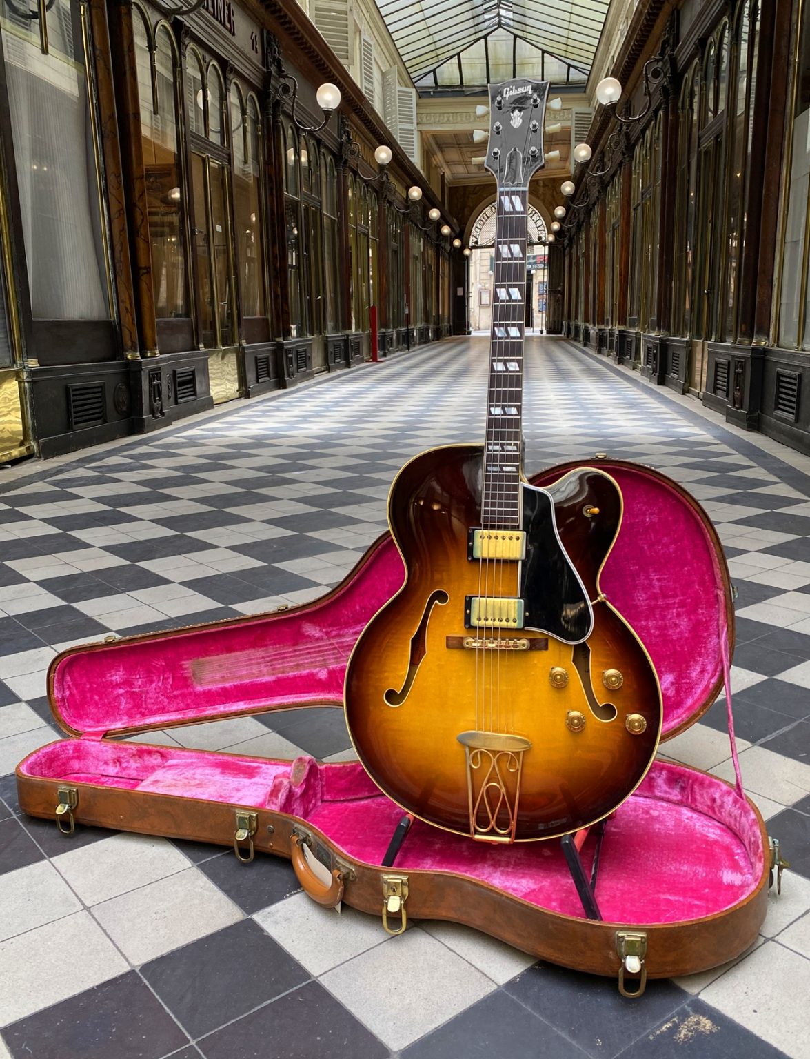 La version “Thin Line” du modèle 350 fut introduite courant 1955 au catalogue Gibson, simultanément à l’iconique Byrdland. Equipées à l’origine de micros P-90, comme sur celle jouée par Chuck Berry, ces derniers furent remplacés progressivement après 1957 par les humbuckers “Patent Applied For”.