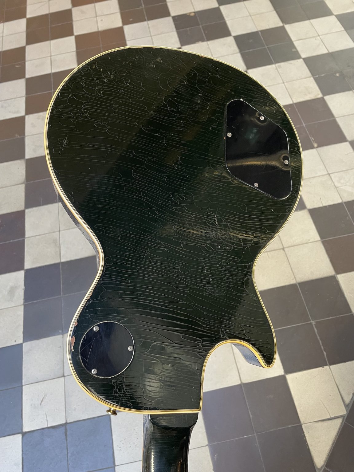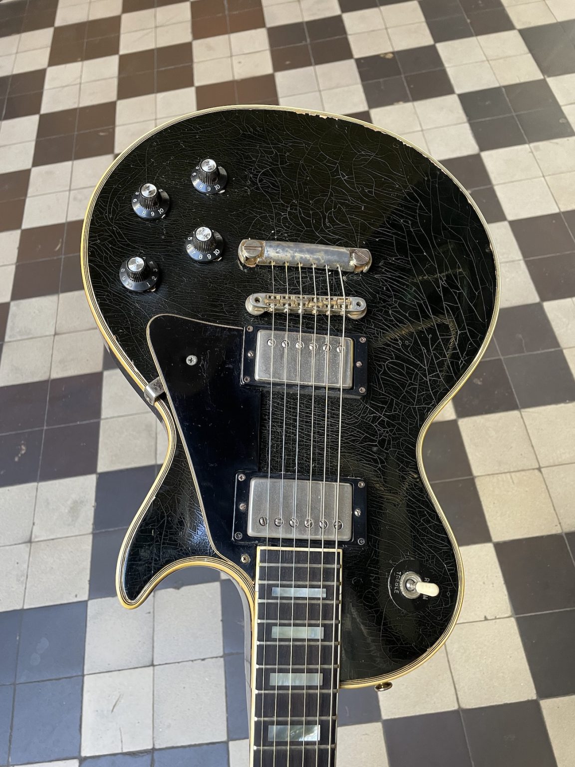 This Black Beauty comes straight from the second period of Les Paul production, which started again in 1968 after a 7-year hiatus. True to its lineage, this instrument sports the Gibson logo with the 5-piece split-diamond inlay on the headstock, the block inlays on the ebony fretboard, its two “Patent No.” humbucking pickups with a truly wild tone, and of course the eponymous Ebony finish with a stunning checking pattern.