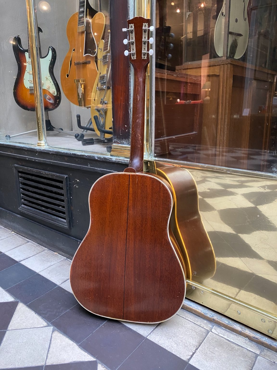 Guitare Gibson des années 50 à la sonorité très ample, en parfait état de jeu. Etat “player”, nombreuses réparations anciennes.