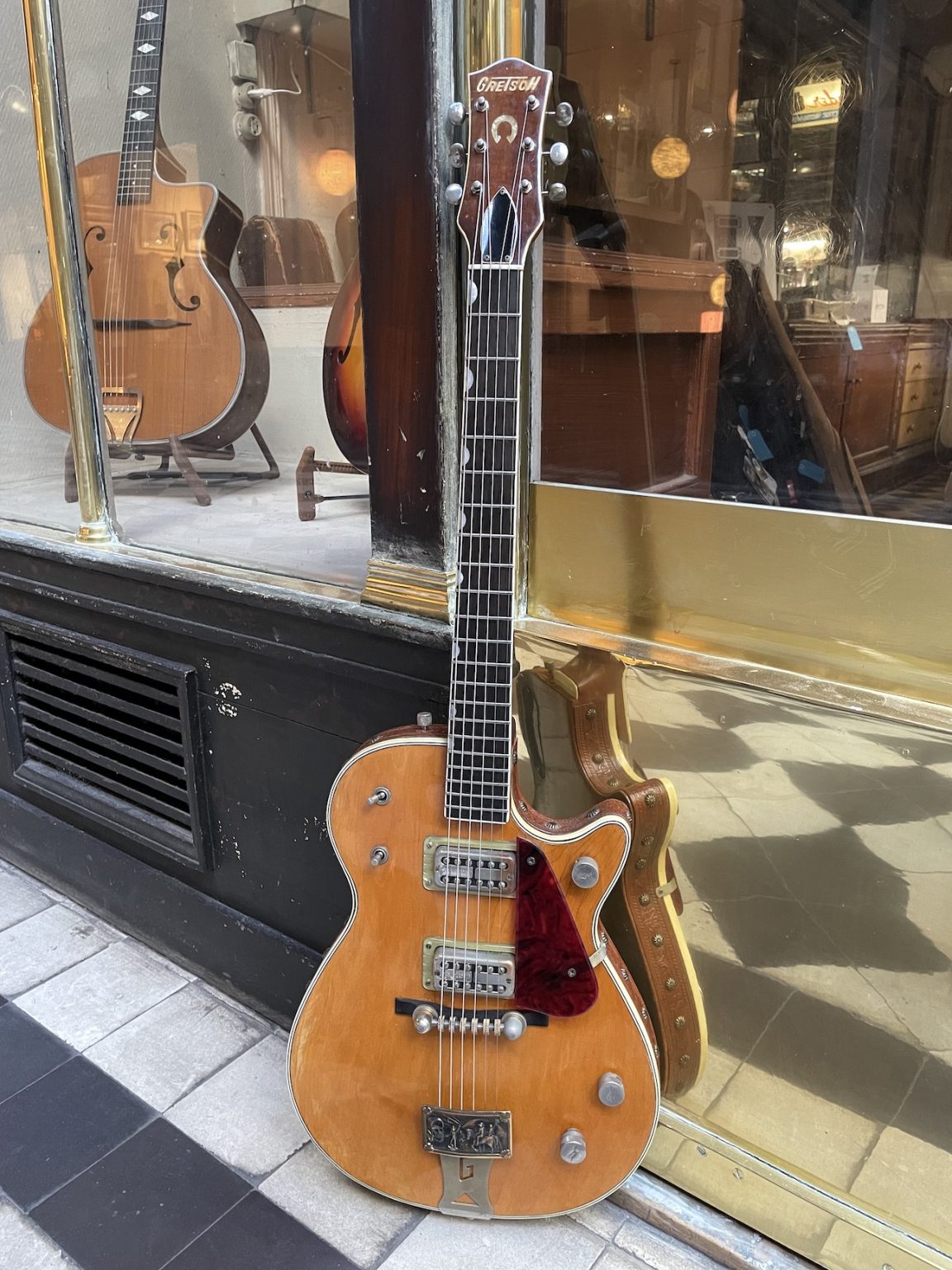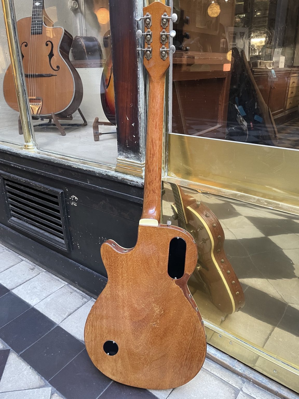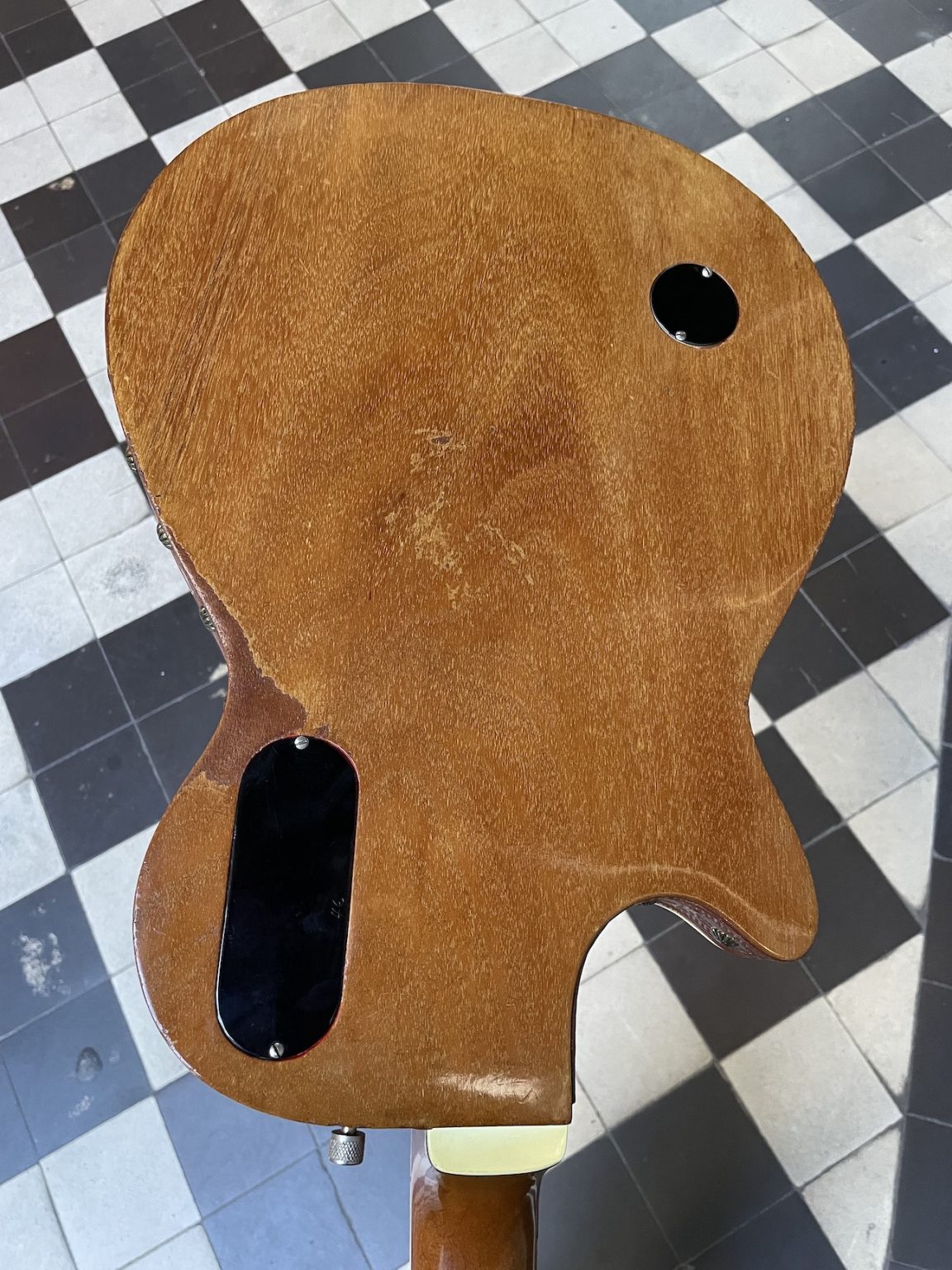 The original cellulose pickguard having suffered degradation, it was removed to prevent further damage both to it and to the metal parts which can be affected by oxydation. A new pickguard was made as an exact reproduction of the original. Complete professional setup done at our workshop, in perfect playing condition.