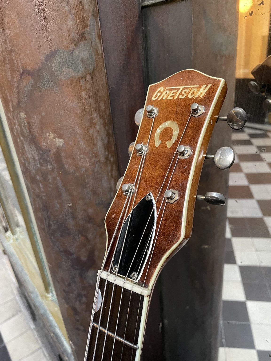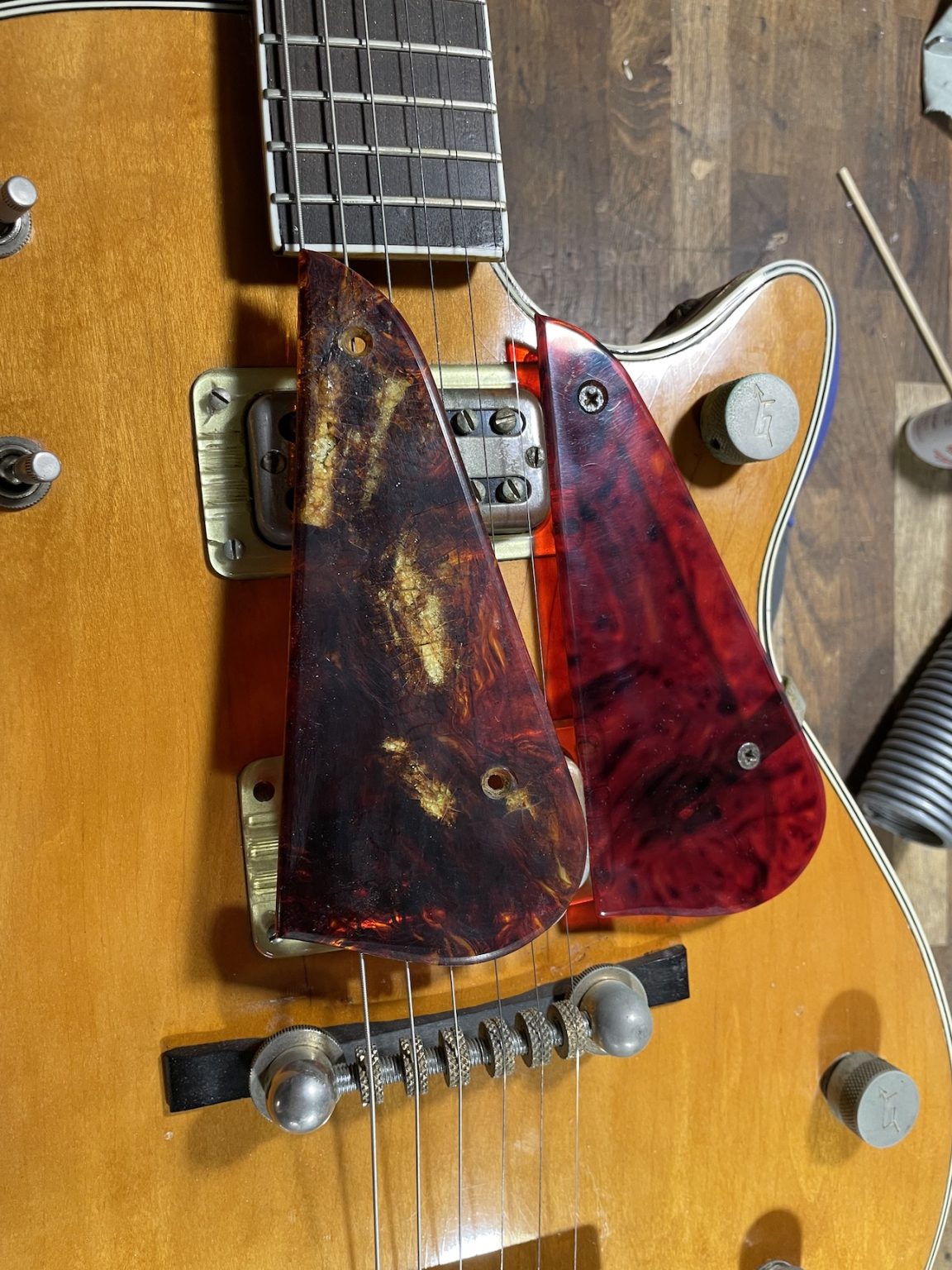 The guitar is equipped with two Filterton humbucking pickups engraved with “Patent Applied For” – the late 1950s marks the appearance of this new style of pickup, developed on one hand by Ray Butts for Gretsch and Seth Lover for Gibson on the other, launching an all out race to obtain the first patent for the device. It is rather uncommon to find a 6130 model equipped with Filtertrons, as they for the most part got the older DeArmond single coil pickup. This adds to the overall appeal of the present instrument. Furthermore, these specific pickups have an incredible sound with very tight compression on the attack, unlike anything we’d ever heard before. Each pickup has its separate volume control, then both run through a master tone switch and a master volume control.