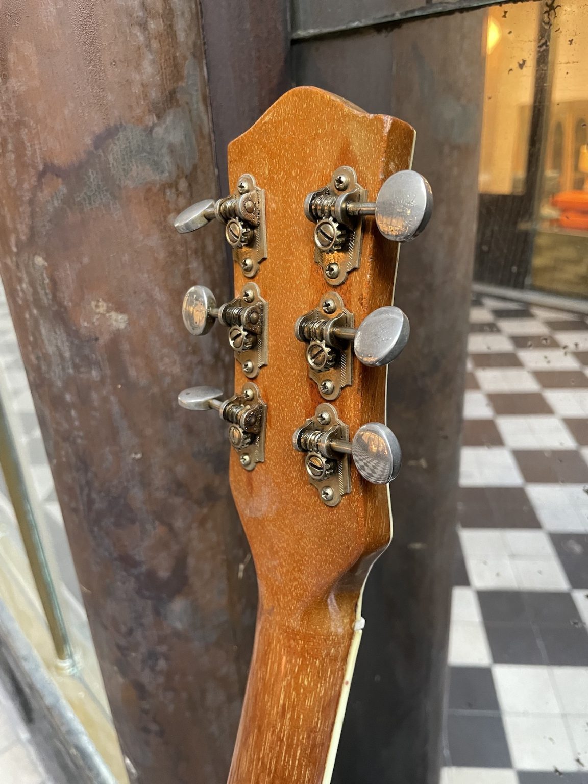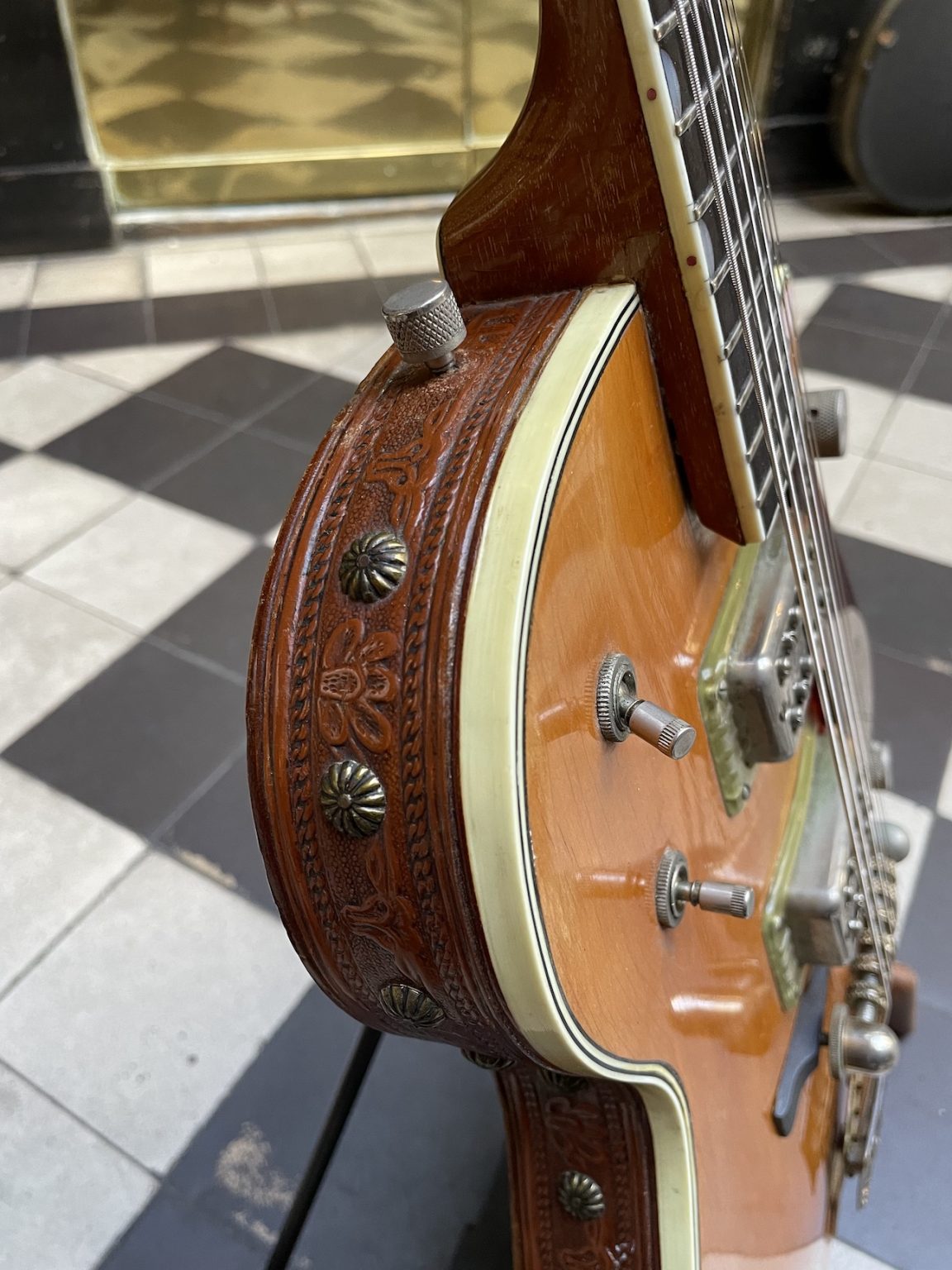 A true cowboy’s guitar that has a lot more to it than what first meets the eye. First of all regarding the aspect of the guitar, one could say it would be perfectly suiting in the hands of a rodeo halftime show perfomer: the nicely aged Orange lacquer finish, the bridge saddles reminiscent of the shape of spurs, the belt buckle adorning the tailpiece depicting a scene of riders returning to camp at sunset, the leather strap engraved with western motifs encircling the edge of the guitar, the horseshoe-shaped headstock inlay… certainly no expense spared here!