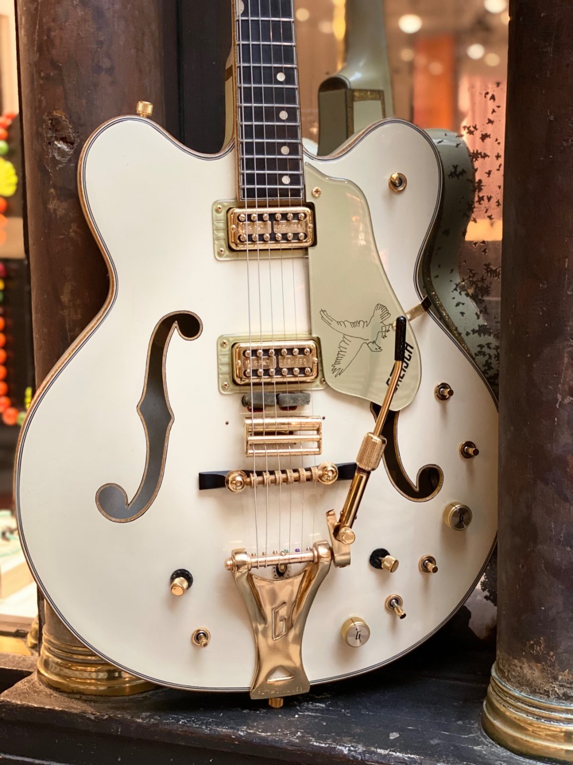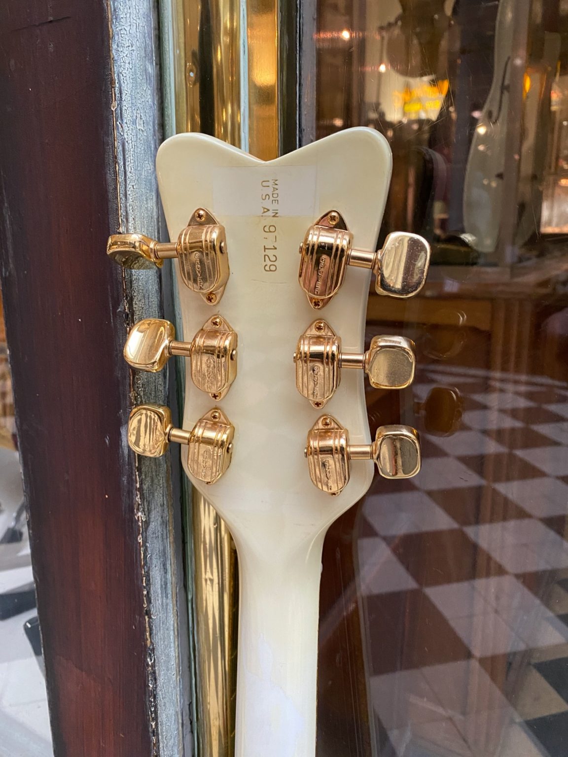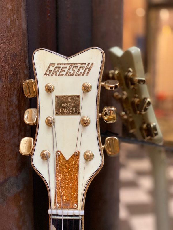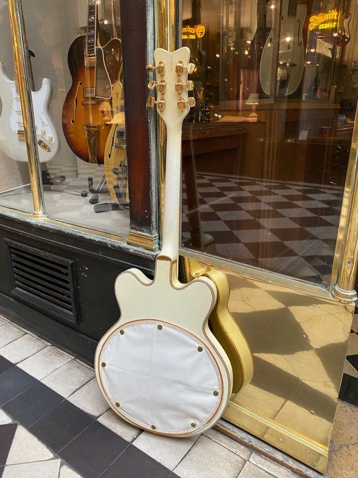 Superbe White Falcon de septembre 1967 dans un état exceptionnel, modèle stéréo permettant de jouer deux amplis simultanément, en séparant les cordes graves des cordes aigües. Une véritable “under the bed”, accompagnée de tous ses gadgets, tags et plastiques d’emballages siglés, dans sa case d’origine.