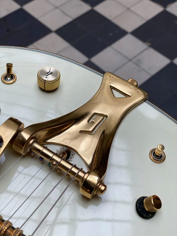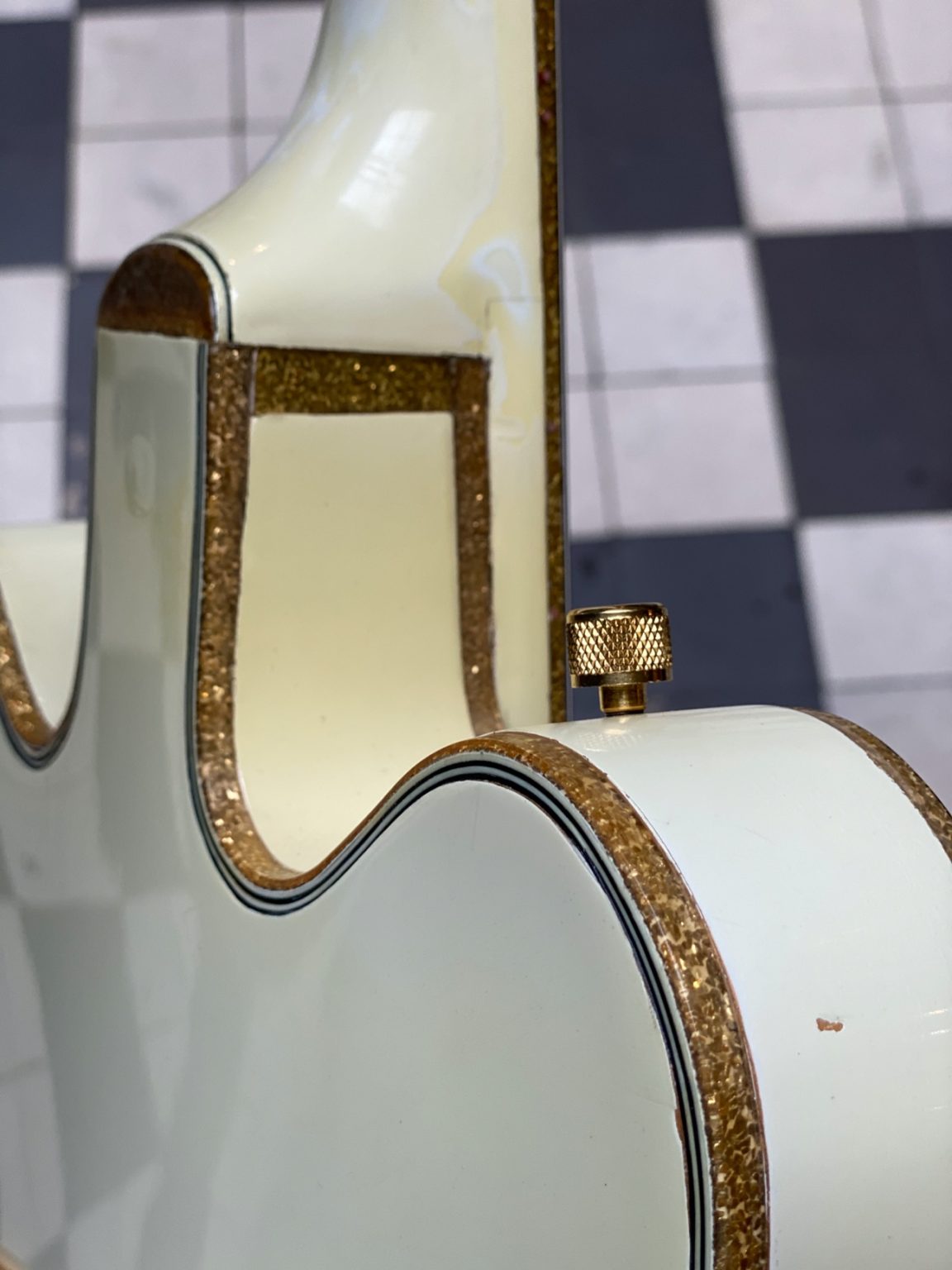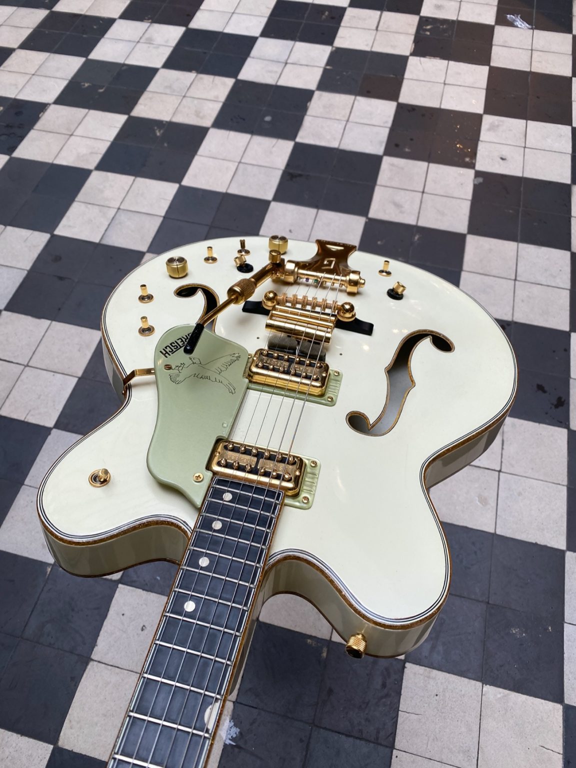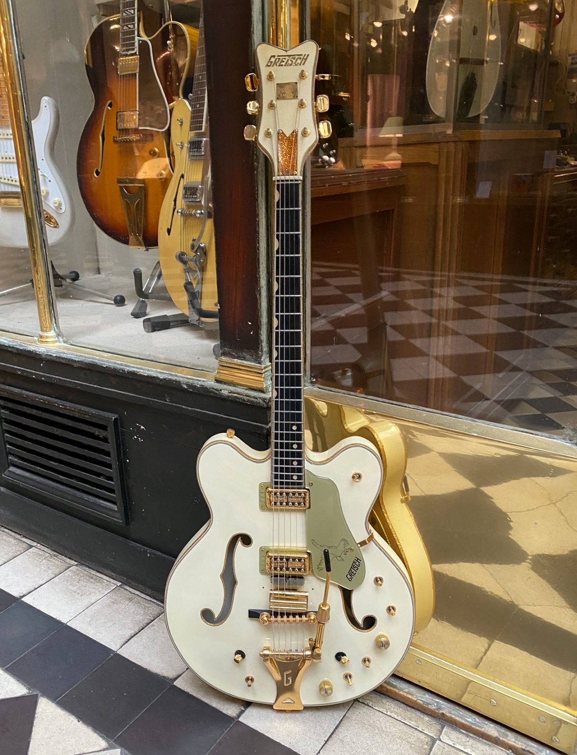 Superbe White Falcon de septembre 1967 dans un état exceptionnel, modèle stéréo permettant de jouer deux amplis simultanément, en séparant les cordes graves des cordes aigües. Une véritable “under the bed”, accompagnée de tous ses gadgets, tags et plastiques d’emballages siglés, dans sa case d’origine.
