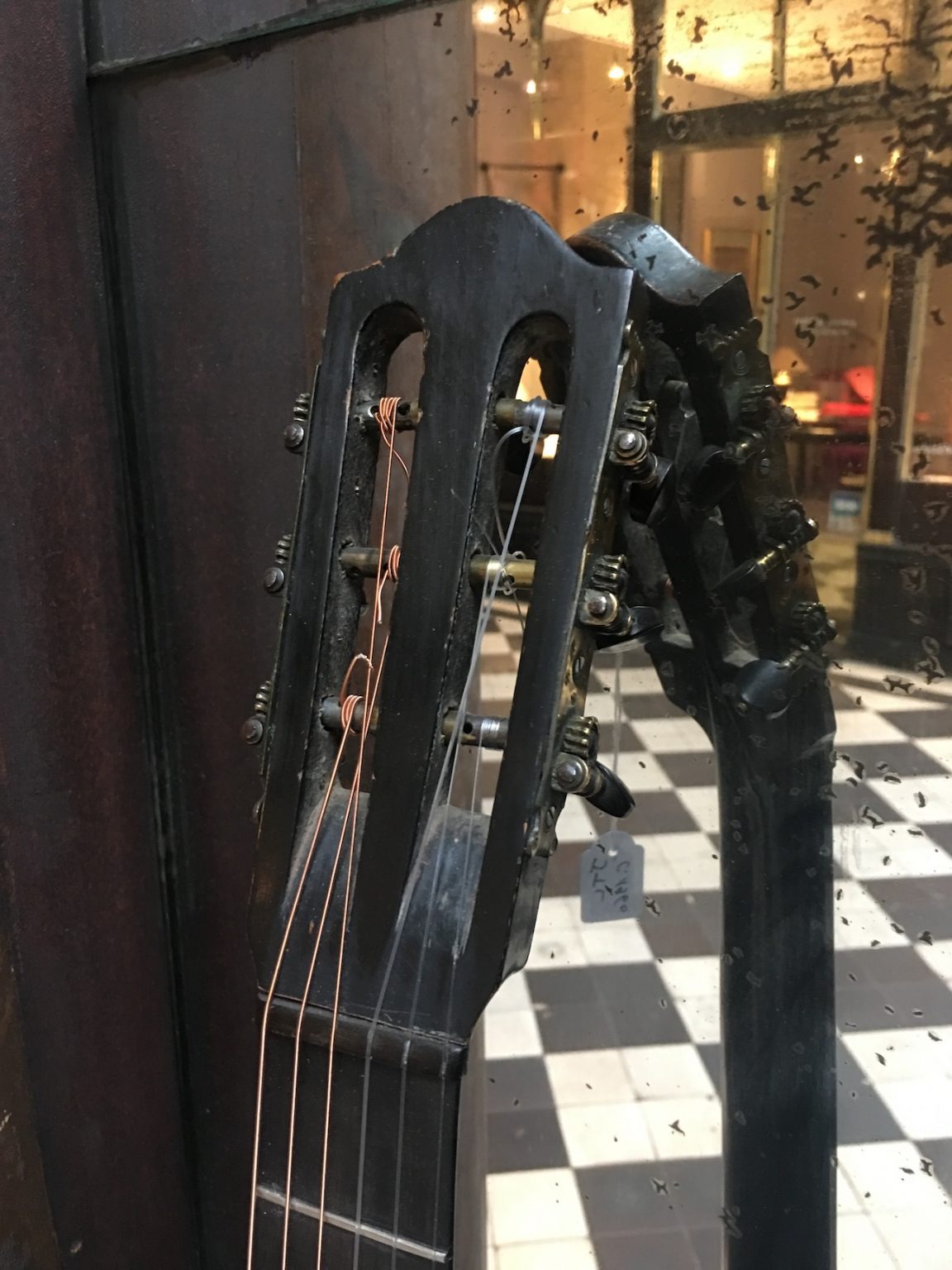 Cette guitare JTL est magnifiquement décorée, de motifs en nacre, et équipée de mécaniques.