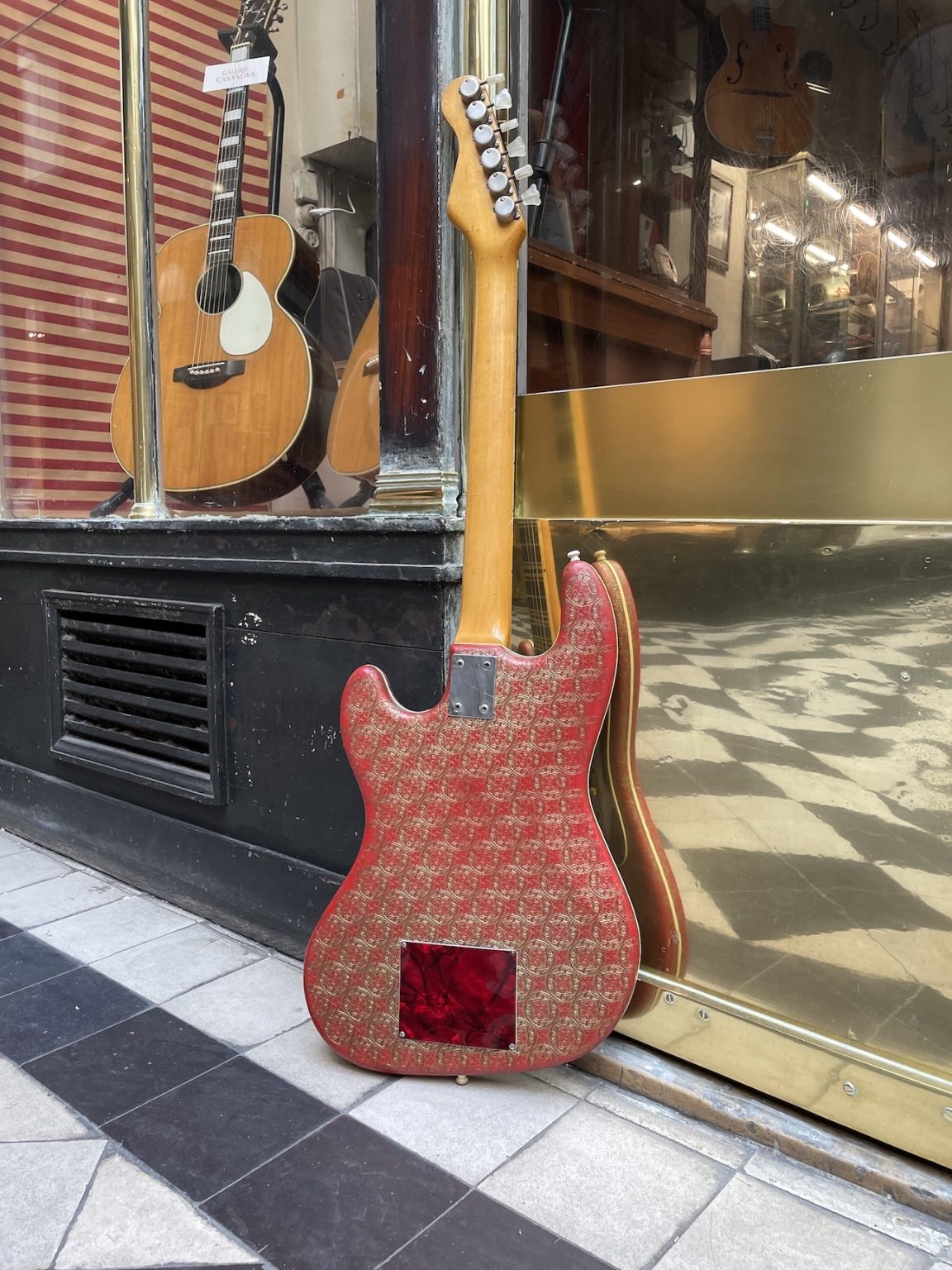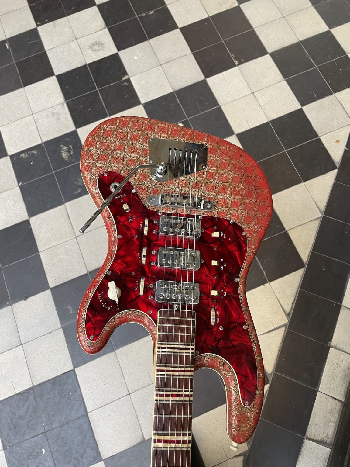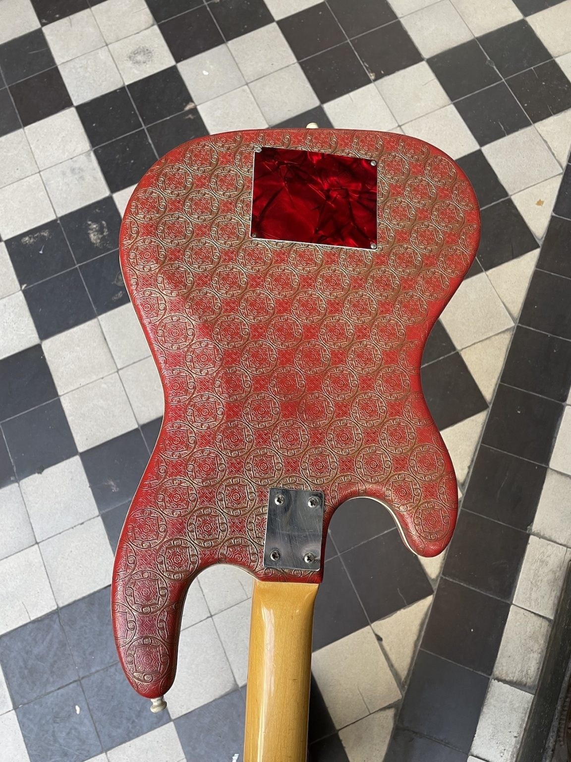 Covered in an unusual red and gold “Brokat” motif vinyl. All parts are original, this guitar has been set up professionally at our workshop and is ready to be played.
