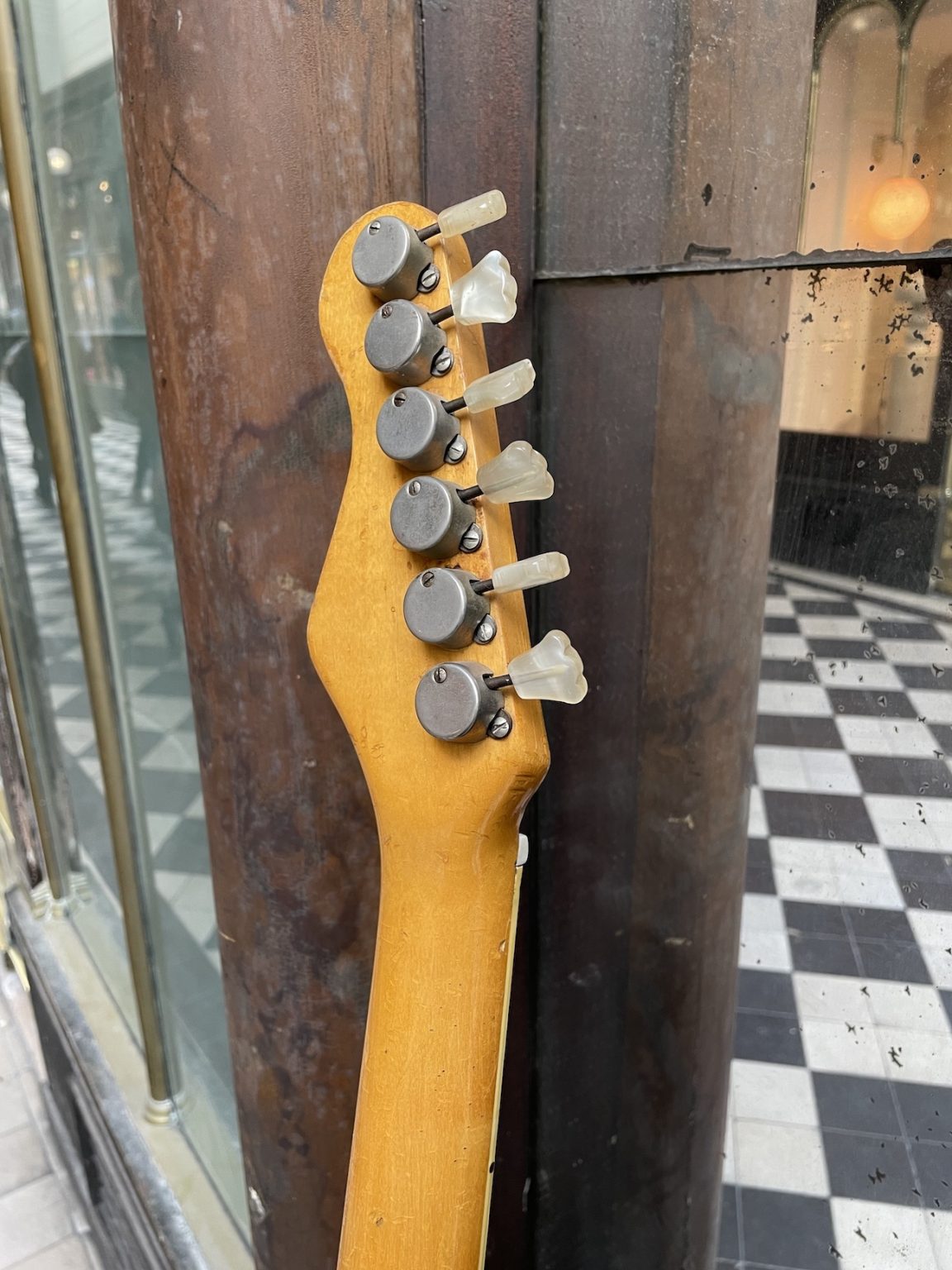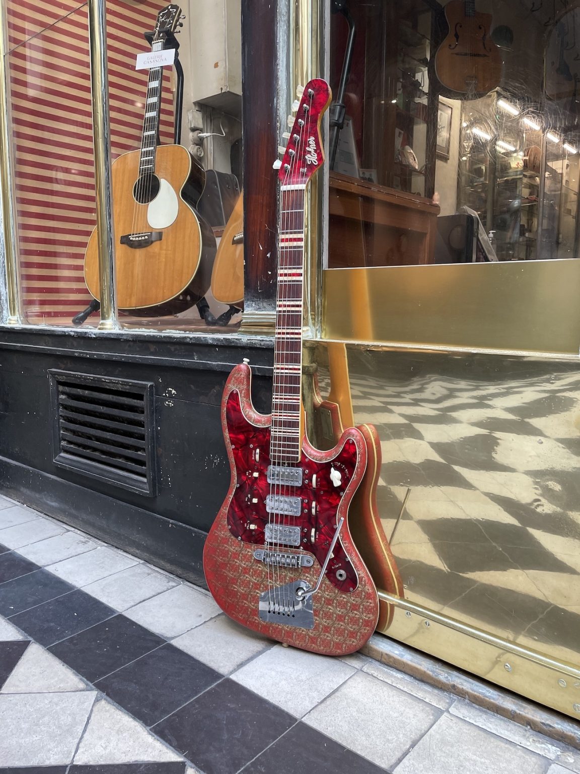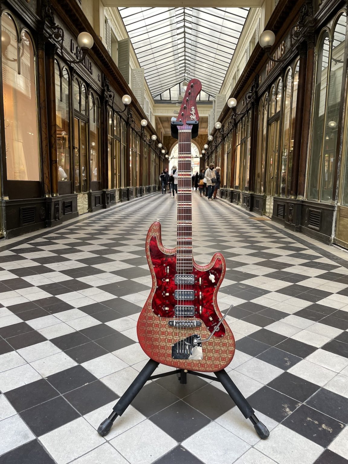 Covered in an unusual red and gold “Brokat” motif vinyl. All parts are original, this guitar has been set up professionally at our workshop and is ready to be played.