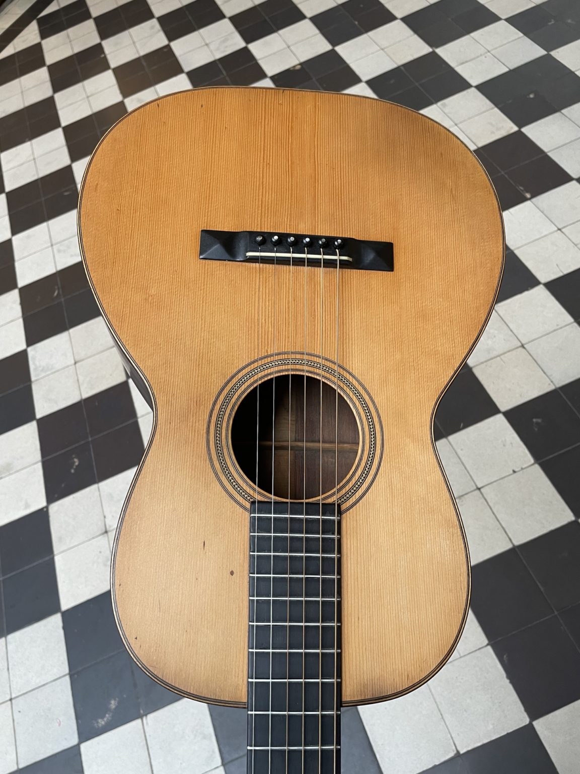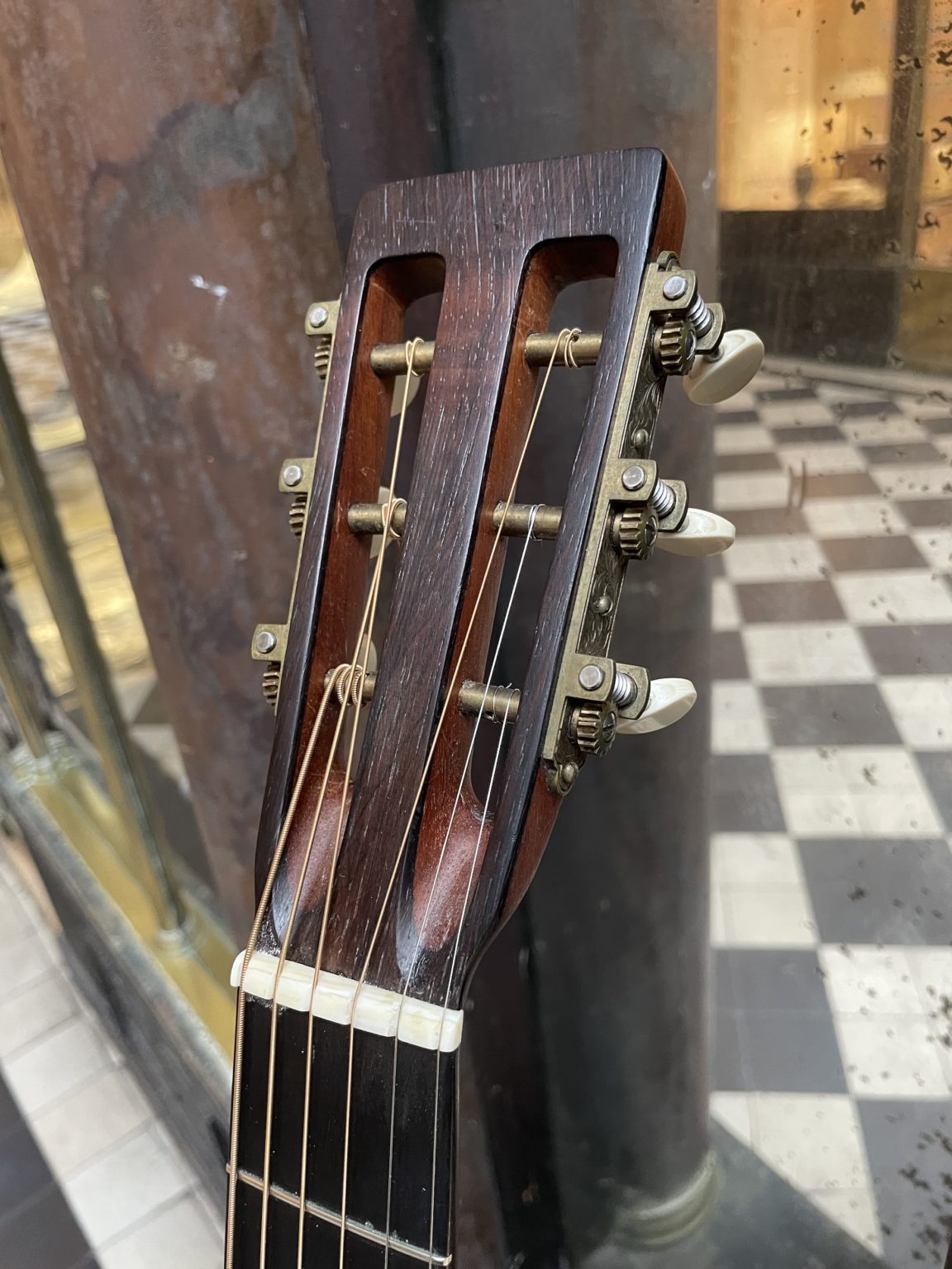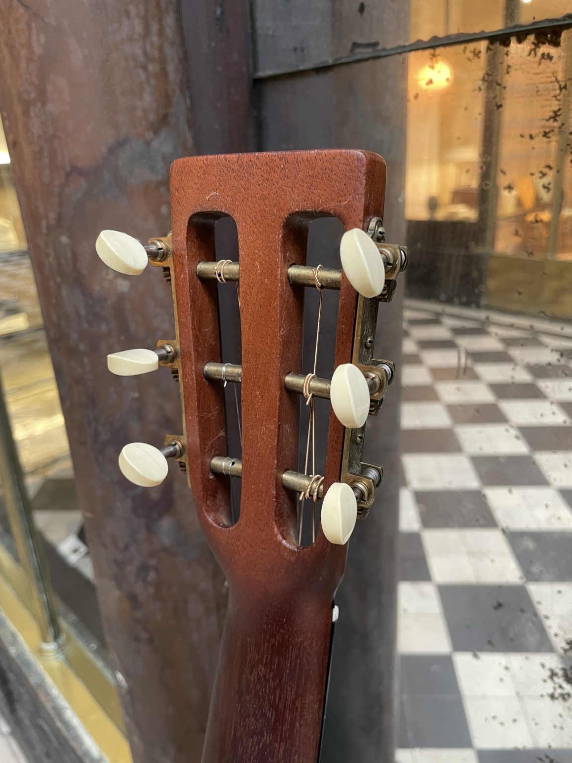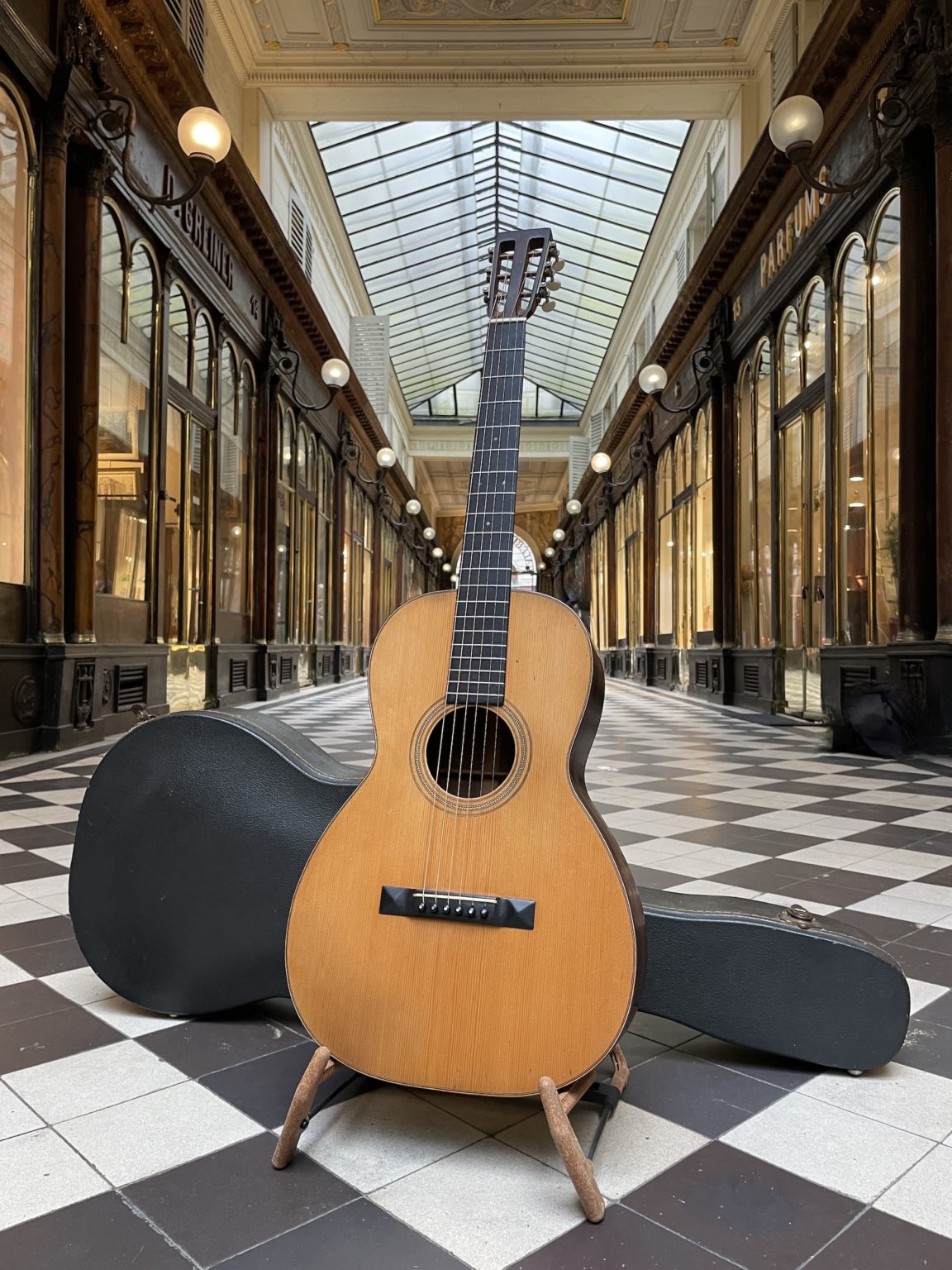 Dans l’ensemble, cette Martin quasiment centenaire est un instrument exceptionnellement plaisant à jouer, très légère et étonnamment sonore malgré son petit gabarit – la finesse du barrage qui était de mise à l’époque de sa construction permet la pleine vibration de la table d’harmonie. Nous relevons que la mortaise de tête de la guitare a été modifiée par le passé, cette opération est ancienne. Préparée et réglée par nos soins, en parfait état de jeu.