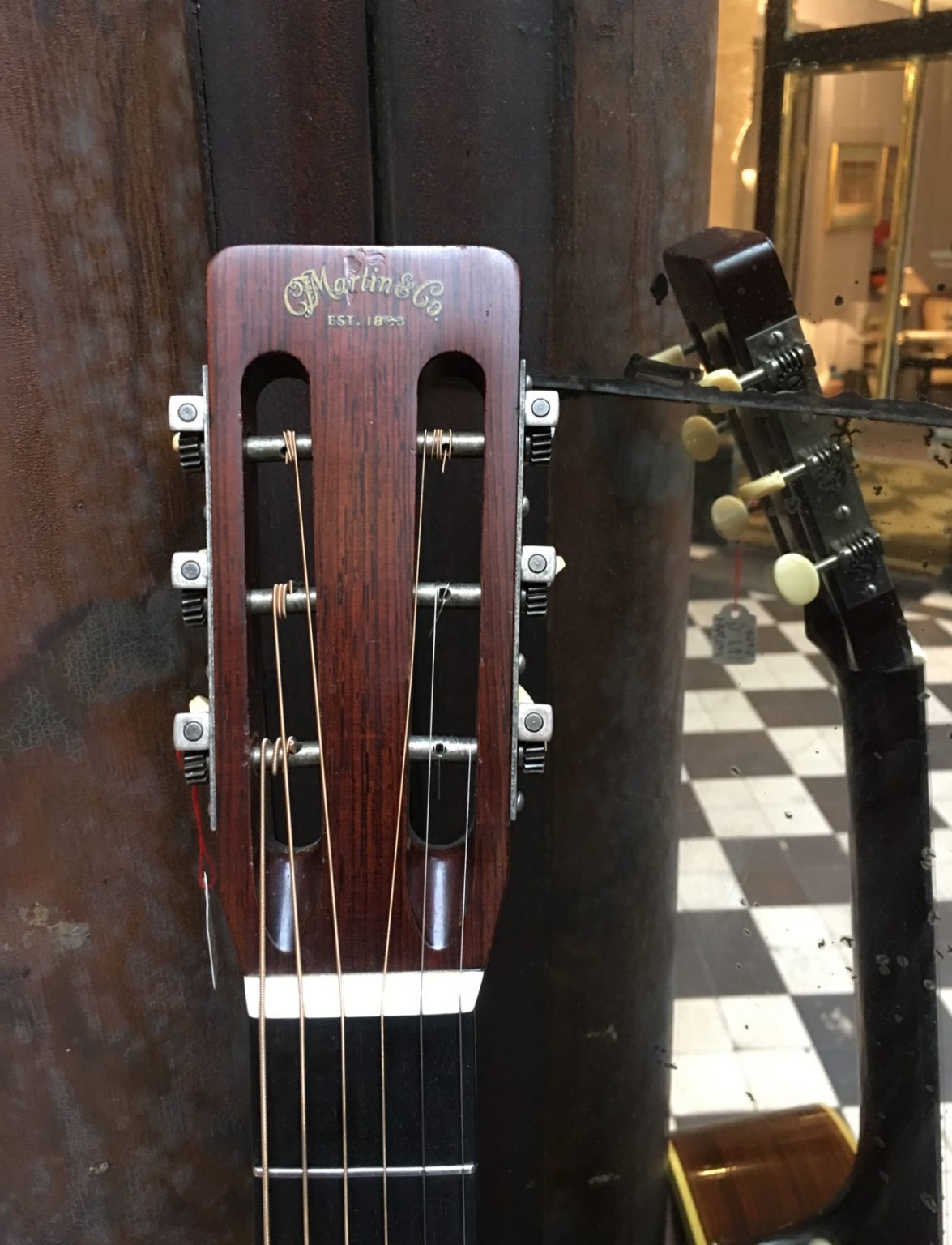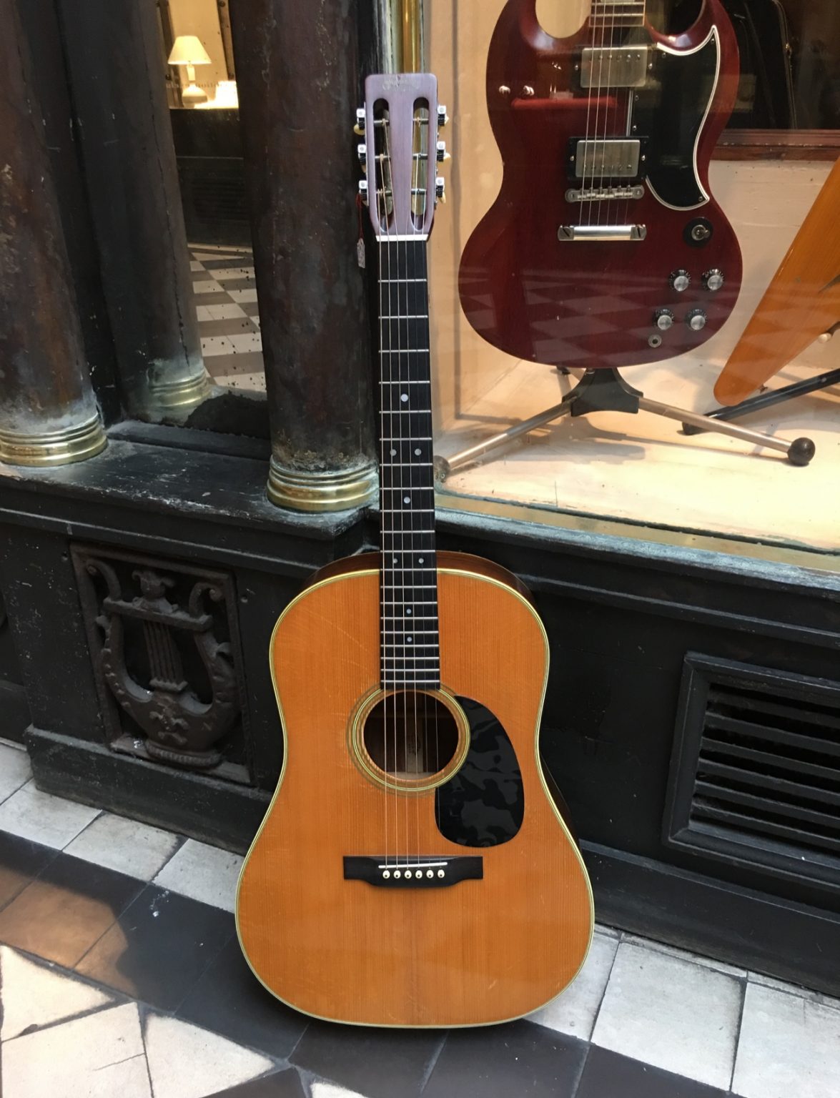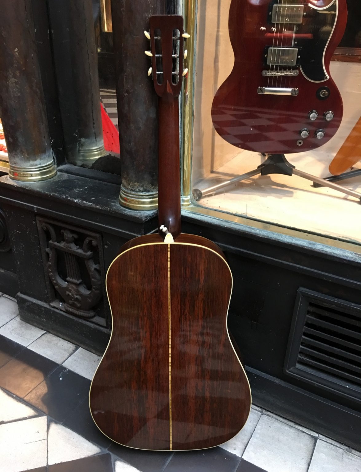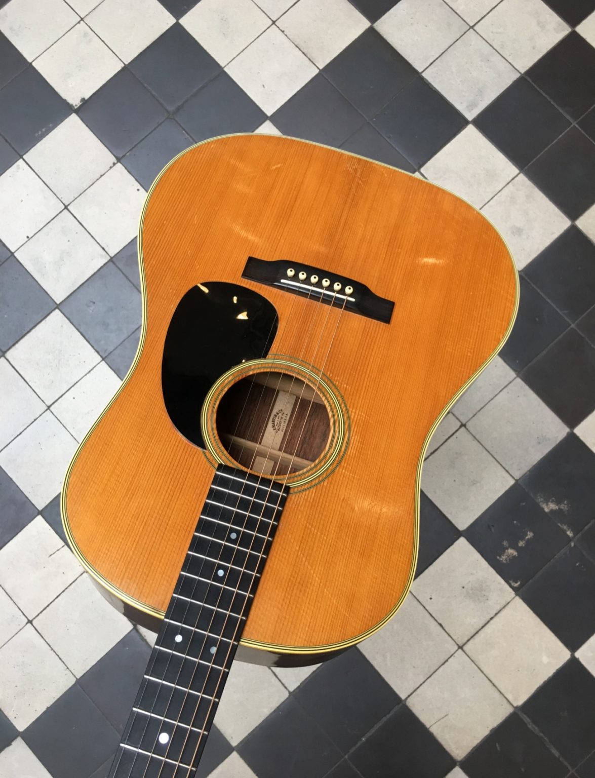 Guitare fabriquée à Nazareth à la fin des années 60. Le fond et les éclisses sont en palissandre de Rio, son vernis faïencé lui donne une belle patine. Le modèle D-28 S est apparu au catalogue Martin en 1968, offrant une jonction corps-manche à la 12ème frette comme sur les dreadnoughts produites par la firme jusqu’à la fin des années 30.