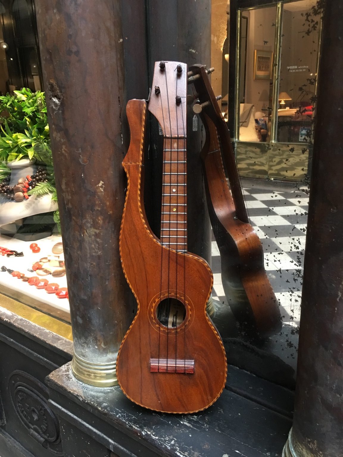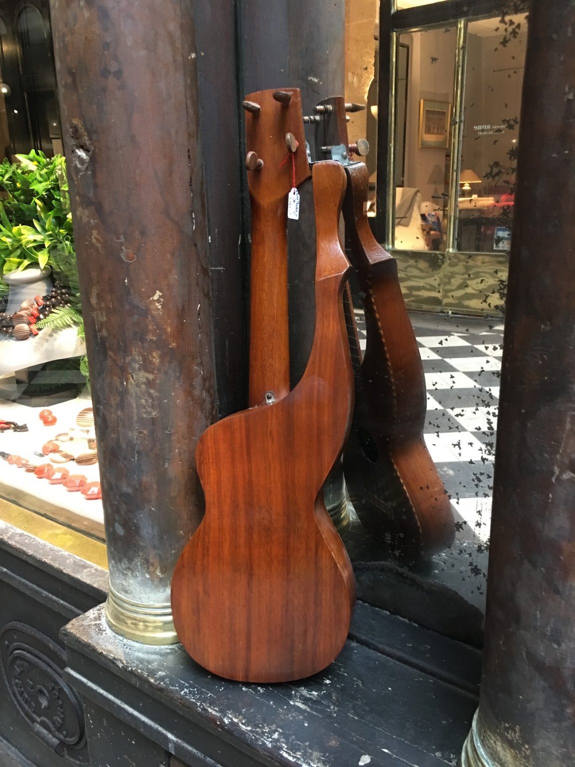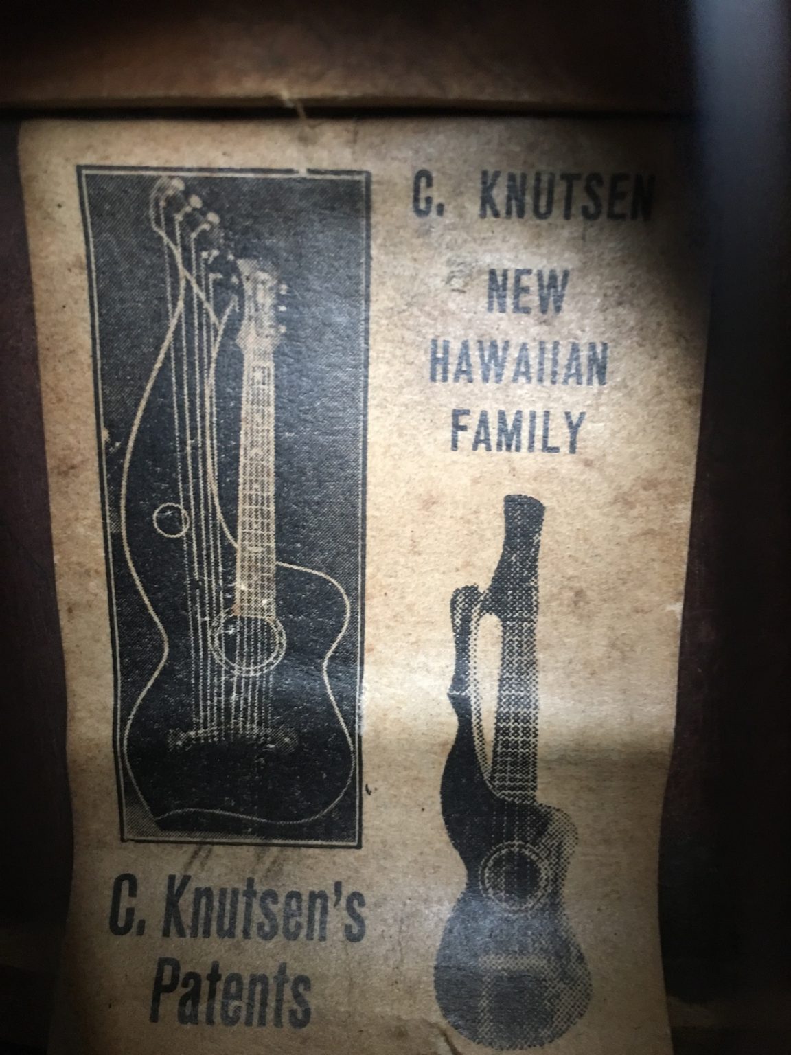 Ukulélé harpe fabriqué au début du XXe par Chris Knutsen, luthier américain d’origine norvégienne connu pour l’originalité de ses designs