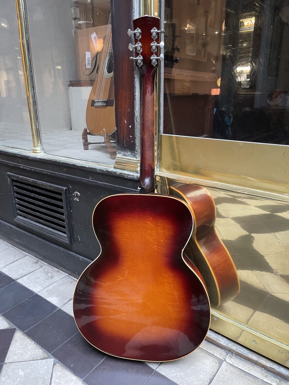Avec les années 30 et l’explosion du jazz, la compagnie se tourne vers la manufacture de guitares archtop, emboîtant le pas à de nombreux autres fabricants. Ainsi, le présent modèle n’est pas sans rappeler les instruments produits par Gibson dans la même période, avec un corps de 16,5 pouces le situant entre les proportions d’une L-4 et d’une L-5, une table massive en épicéa, son fond et ses éclisses en érable ondé.