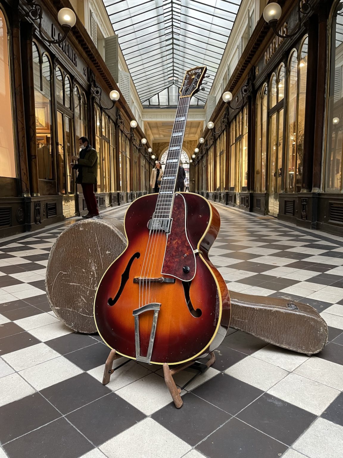 Then came the 1930s and the explosion of jazz, which pushed numerous instrument manufacturers to turn towards the production of archtop guitars marketed towards this style, a trend to which Vega followed suit. Thus, the present model is not unlike instruments built by its competitor Gibson, which its 16 1/2 inch body placing it between the L-4 and the L-5 in terms of proportions, its carved spruce top and flamed maple sides and back.