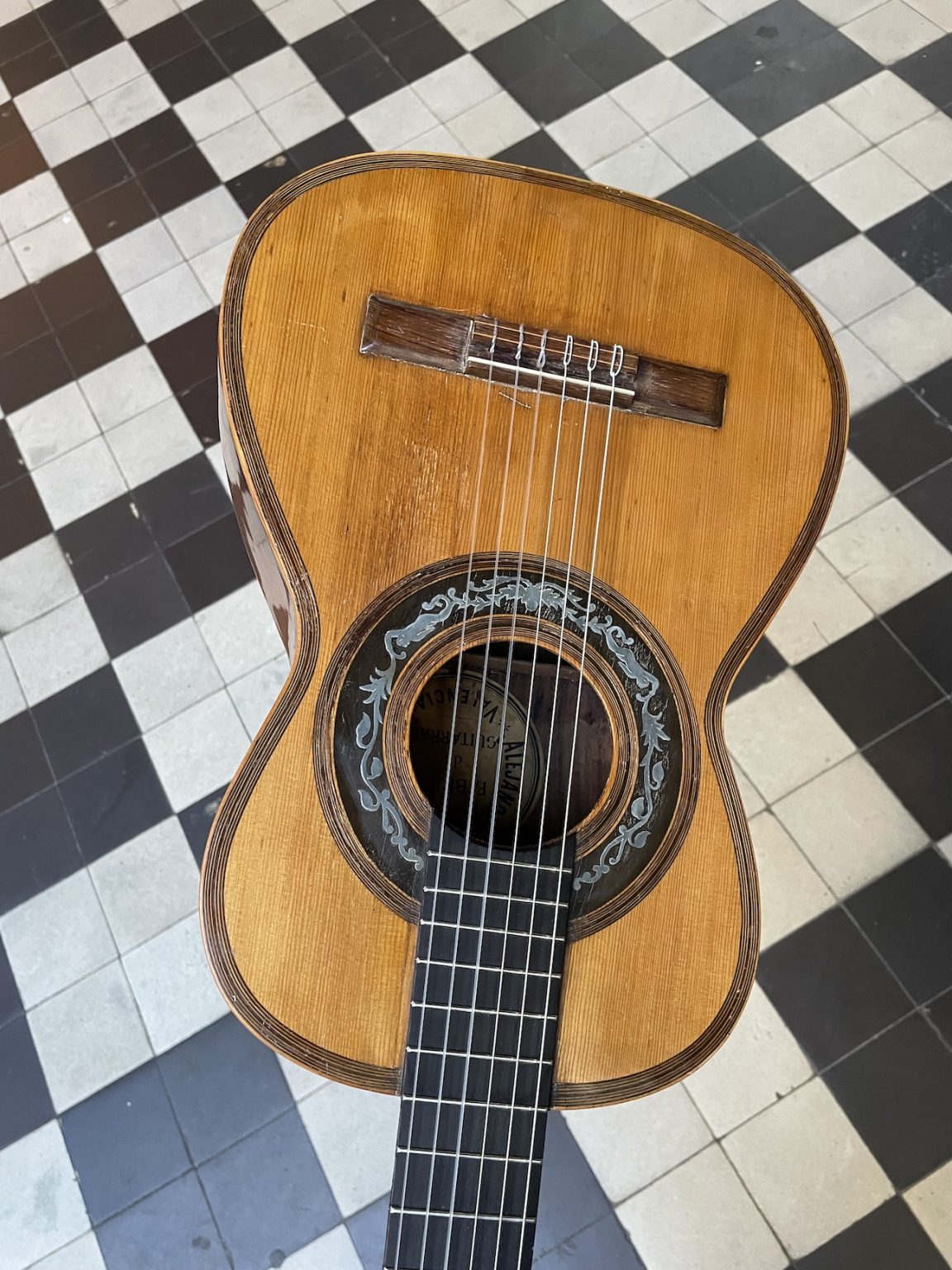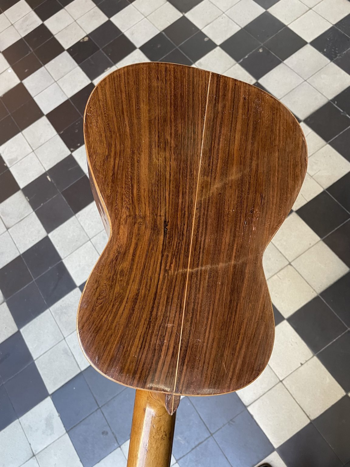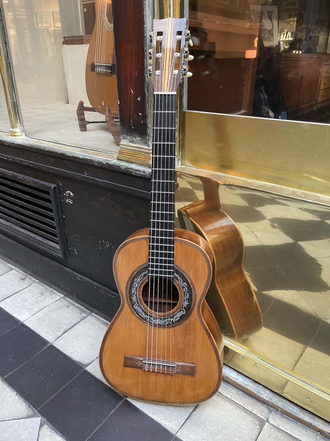 Malgré sa petite taille, cet instrument offre une belle projection sonore qui, alliée au diapason court de 600 millimètres, en rend le jeu particulièrement plaisant. Une guitare de belle facture, avec la table en épicéa et le fond et les éclisses en palissandre. Elle présente une finition plutôt élaborée avec un binding à plusieurs bandes autour de la table, ainsi qu’une rosace décorée de cercles concentriques et d’un motif d’ébène et de métal marquetés.
