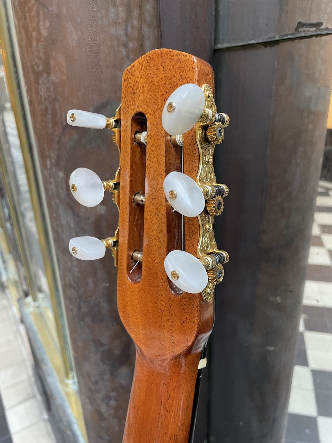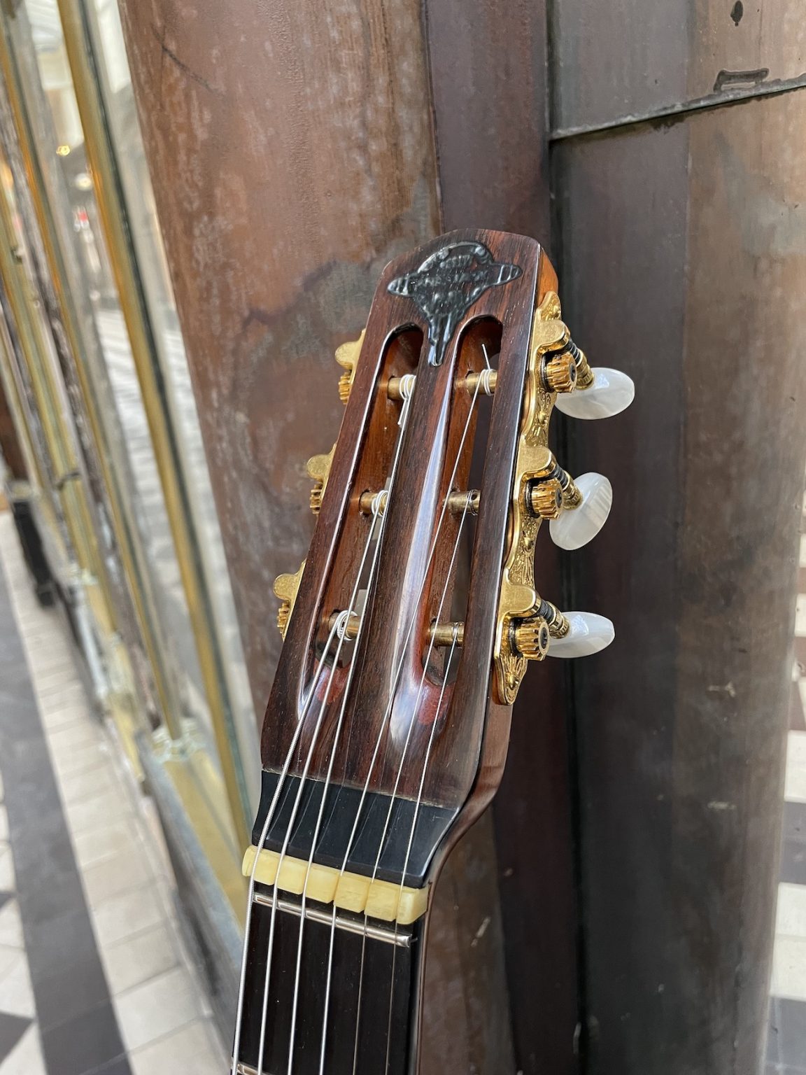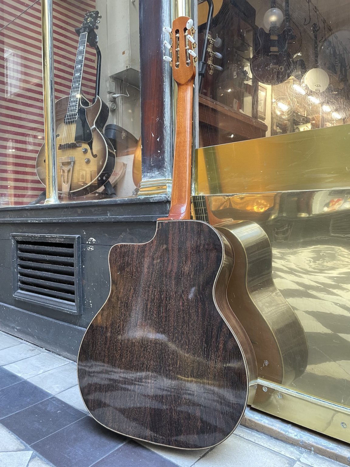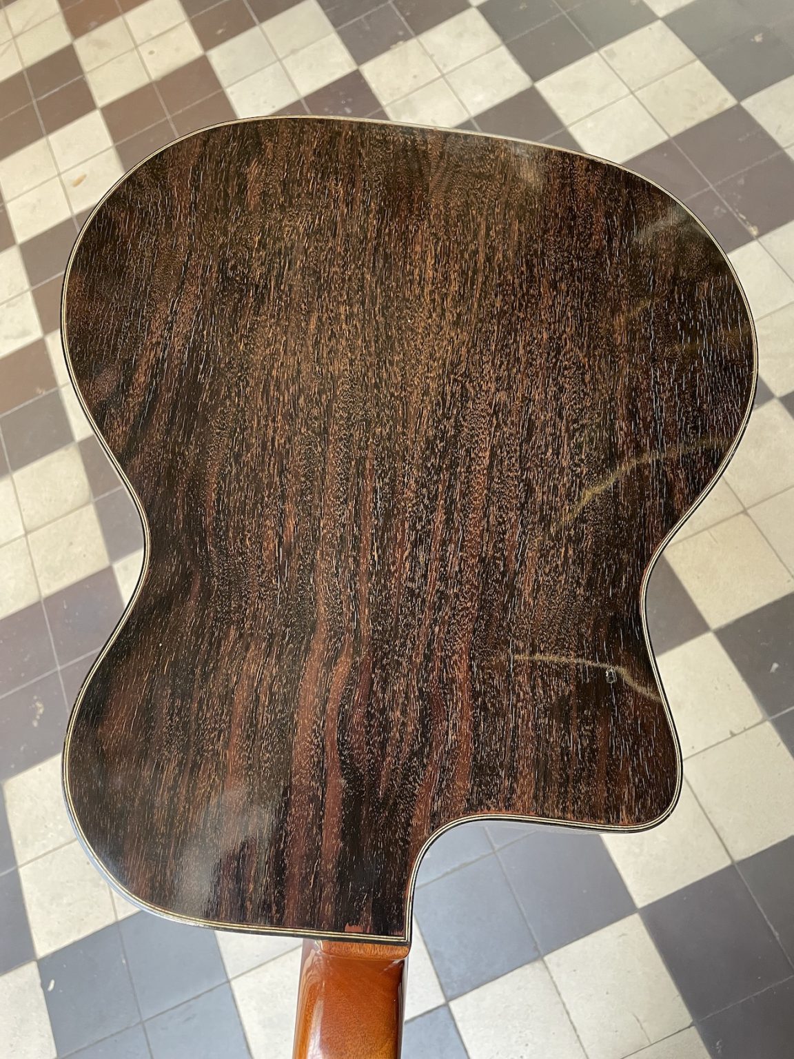 Table en épicéa, fond et éclisses dans un beau palissandre, manche XIV cases. Instrument parfaitement réglé et en état de jeu.