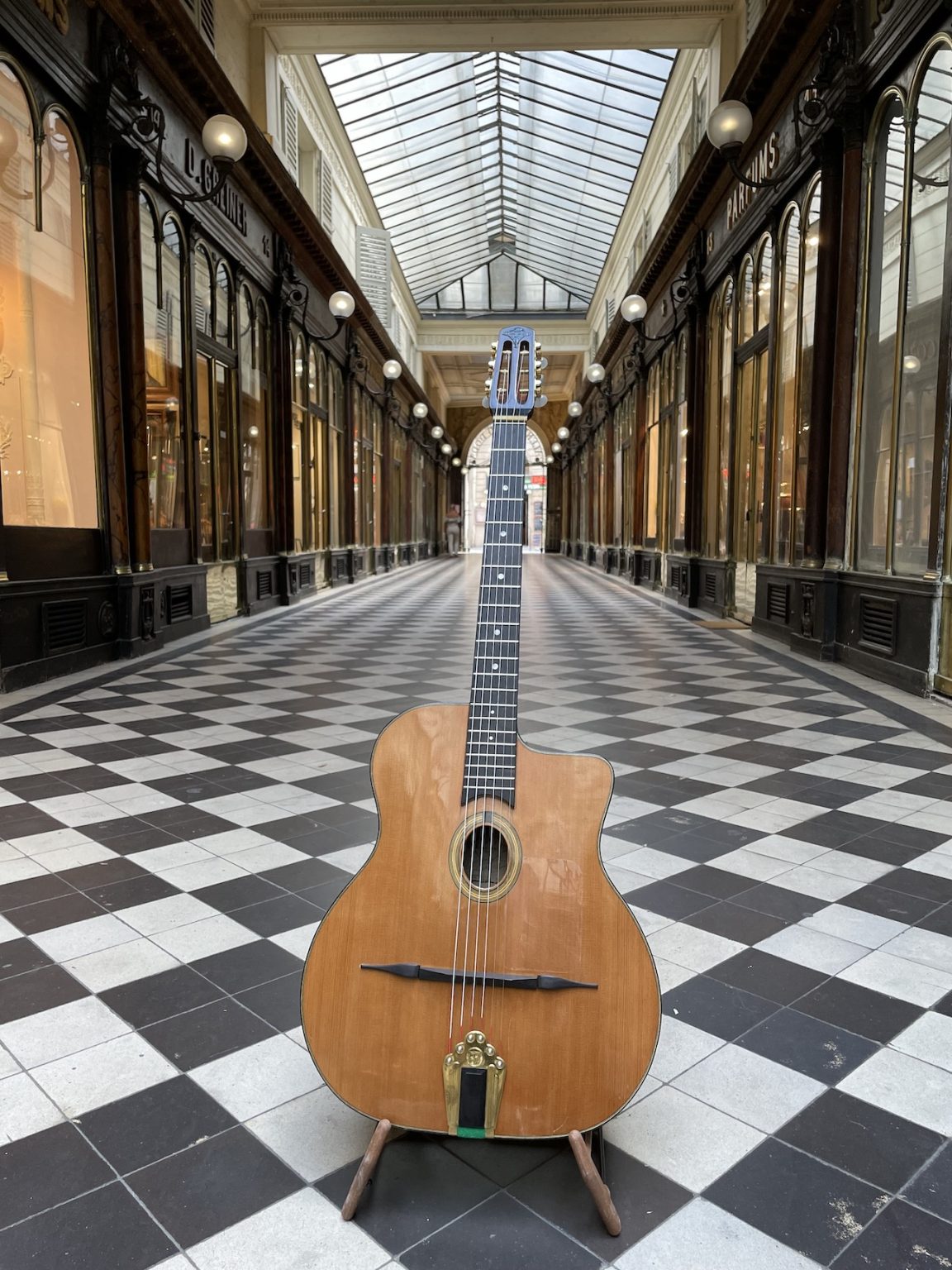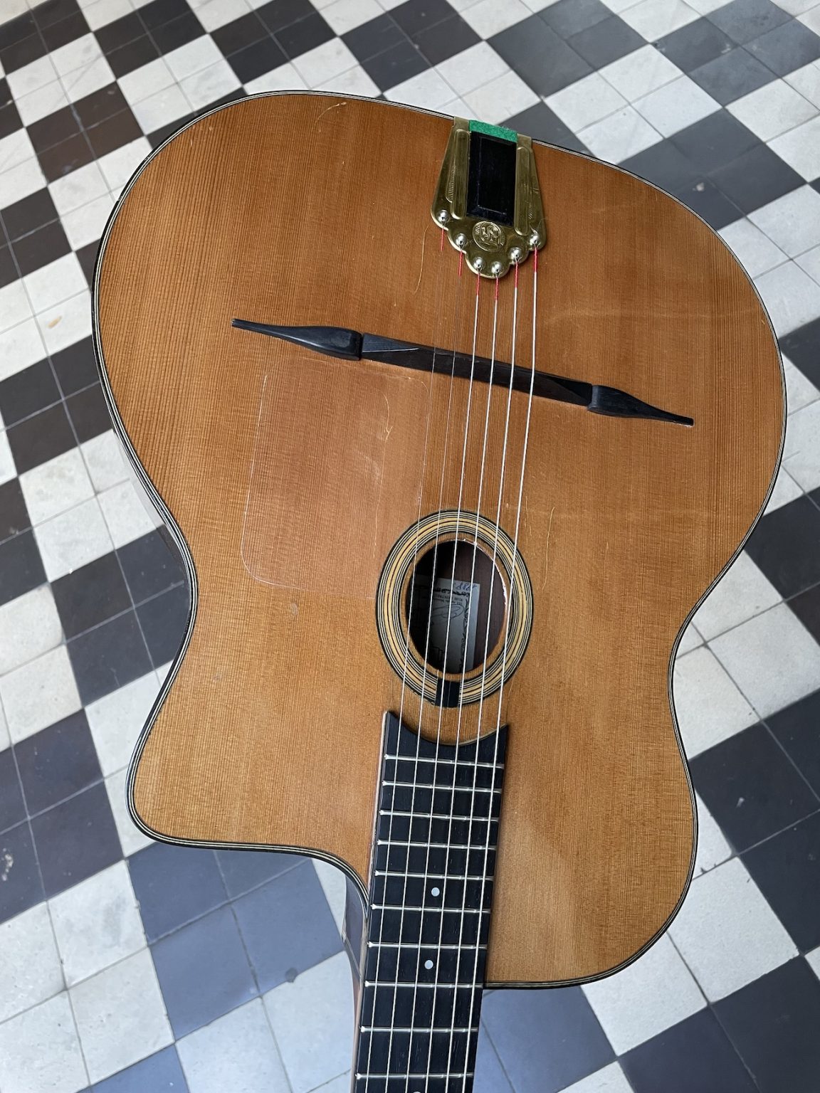 Guitare jazz manouche modèle Petite Bouche de Pierre Anastasio réalisée en 1988, en très bon état.