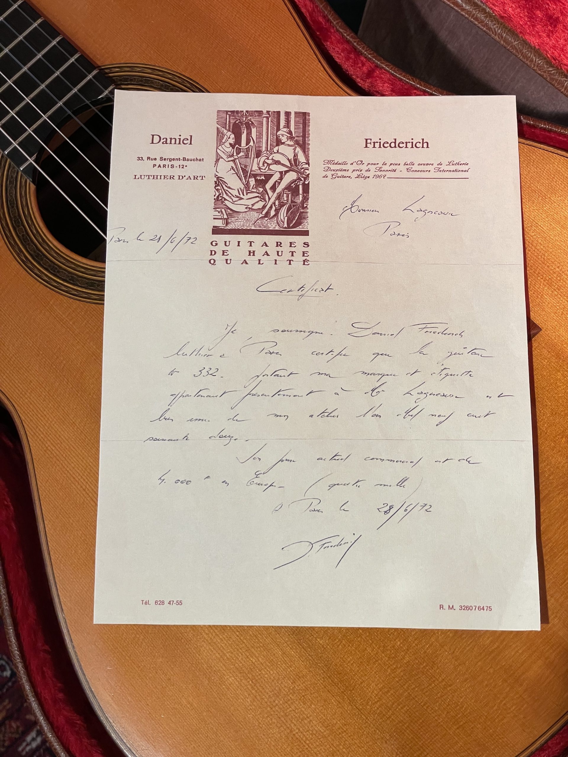 Circonstance assez rare pour le mentionner, cette guitare nous provient directement de son premier et unique propriétaire qui l’a acquise en 1972 directement auprès de Daniel Friederich – elle est donc accompagné d’une copie du certificat original établi par le luthier, attestant de sa provenance. L’instrument a été superbement entretenu au fil des cinquante années passées, présentant à ce jour une légère patine liée à son usage et autrement globalement exempte de défaut. Nous relevons un légère gerçure sur la portion centrale de la table d’harmonie due à la rétractation du bois au niveau du brin central du barrage, chose attestant plus qu’autre chose de la finesse de la construction de la guitare – la zone a été stabilisée par infiltration de colle et demeure stable et discrète sans altération au vernis. La guitare a été récemment restaurée pour le jeu dans notre atelier avec un refrettage complet, confection d’un jeu de sillets en os en copie de l’original, réglage complet d’action et d’intonation – le travail nécessaire pour retrouver une base de jeu parfaitement ajustée.