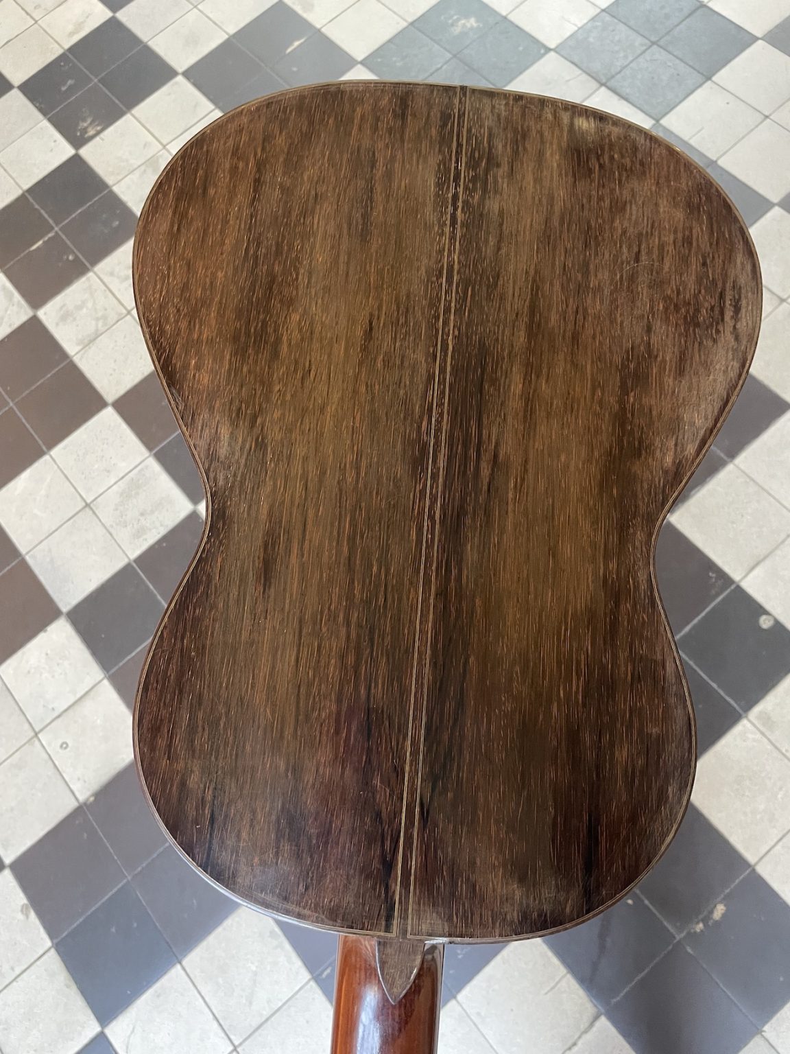 Le présent instrument compte parmi les modèles Concert de la première période, et témoigne effectivement d’une facture de haut vol. Tant la fourniture de bois – sapin de Roumanie pour la table d’harmonie, palissandre de Rio pour le fond et les éclisses – que la marqueterie de la rosace et du chevalet, que les mécaniques spécialement dessinées et conçues pour le modèle, font de cette guitare un véritable bijou de lutherie. Toutes les parties d’origine sont présentes, y compris les vernis. Cet instrument a un timbre chaleureux avec un excellent équilibre entre les graves et les aigus, et une belle durée de son. Réglé et préparé par nos soins pour un parfait confort de jeu.