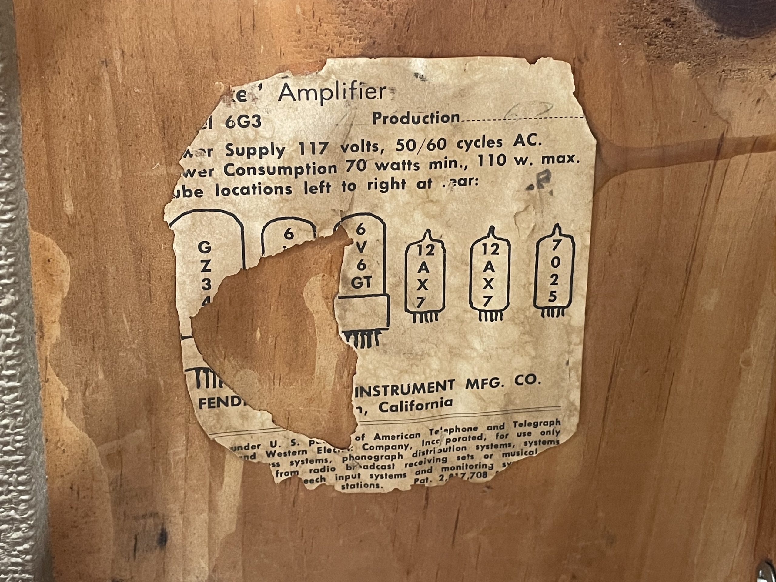 La version 6G3 introduite en 1961 prend la suite des concepts généraux portés par la version 5E3 (1955-1960) en tweed, équipé d’un haut-parleur de 12 pouces drivé par une paire de lampes 6V6. Pour autant, le nouveau circuit s’éloigne sensiblement de celui des années 50. Il dispose notamment de deux canaux (Normal et Bright) avec des contrôles de volume et de tonalité entièrement indépendants ; on observe pour la première fois sur le Deluxe un circuit de tremolo, constitué d’un oscillateur rudimentaire autour d’une moitié de 12AX7 (la seconde triode de cette lampe sert de mélangeur pour les deux canaux et d’étage de préamplification supplémentaire) affectant le bias des lampes de puissances – cette disposition offre un effet particulièrement prononcé et musical, que l’on perdra quelques années plus tard lorsque le circuit sera revu en faveur du tremolo à photo-cellule. La nouvelle configuration de la section de puissance à bias fixe repose sur une redresseuse GZ34, offrant un supplément de courant disponible par rapport à la 5Y3 employée auparavant, donc un niveau de headroom (volume non-saturé) accru. Le préamplificateur permet quant à lui un gain plus important et davantage de saturation et de compression lorsqu’il est poussé à fond – c’est notamment l’usage qu’en a fait Billy Gibbons sur les premiers albums de ZZ Top, employant un Deluxe de 1963 poussé à ses limites pour une distortion massive et riche en harmoniques. Le 6G3 déploie environ 15 à 18 W, ce qui en fait un appareil idéal pour une diversité de contextes de jeu – pour jouer chez soi dans un (grand) salon, pour remplir un club, ou dans un studio pour retrouver cette patte sonore très spécifique au début des 60s.