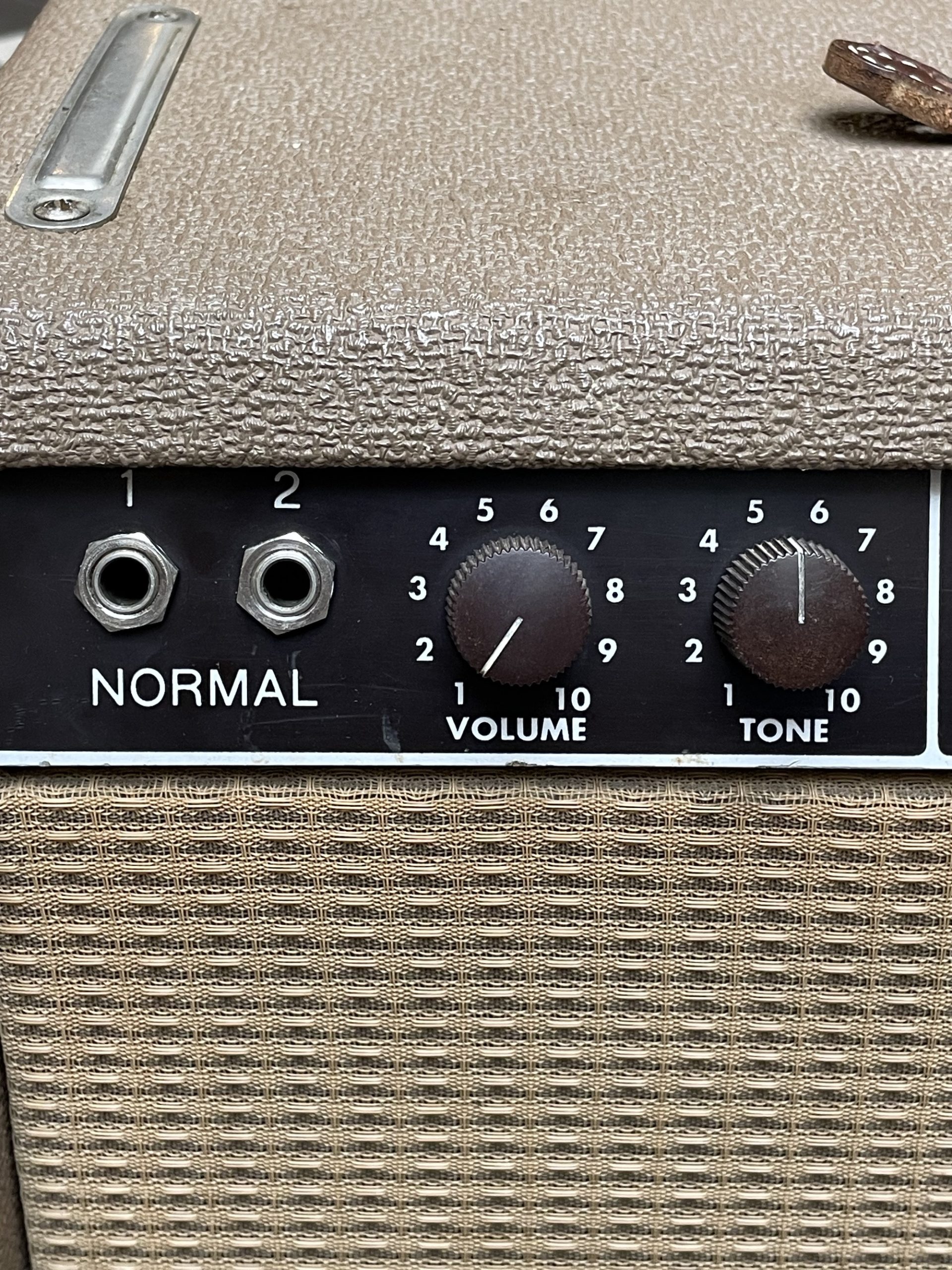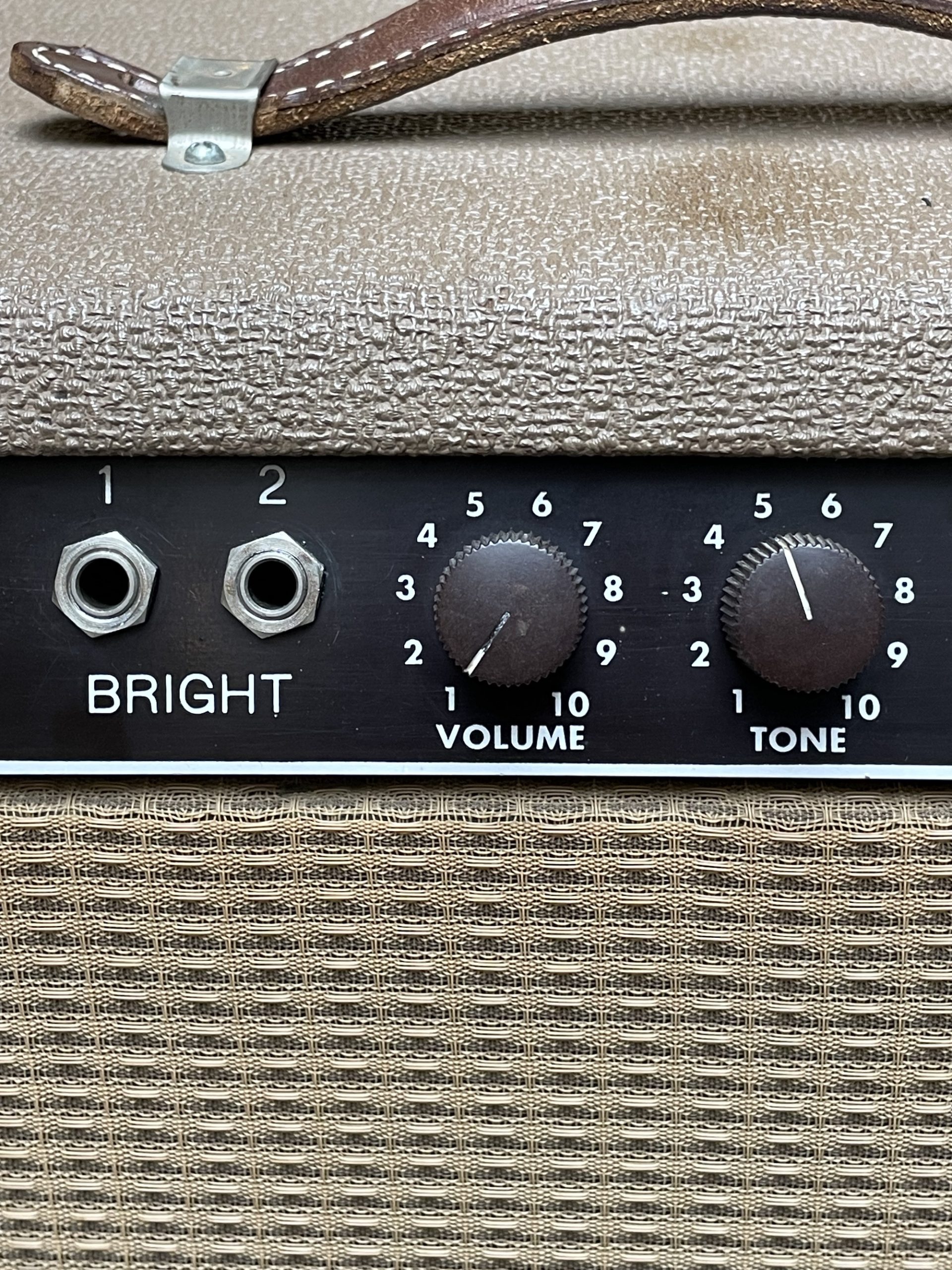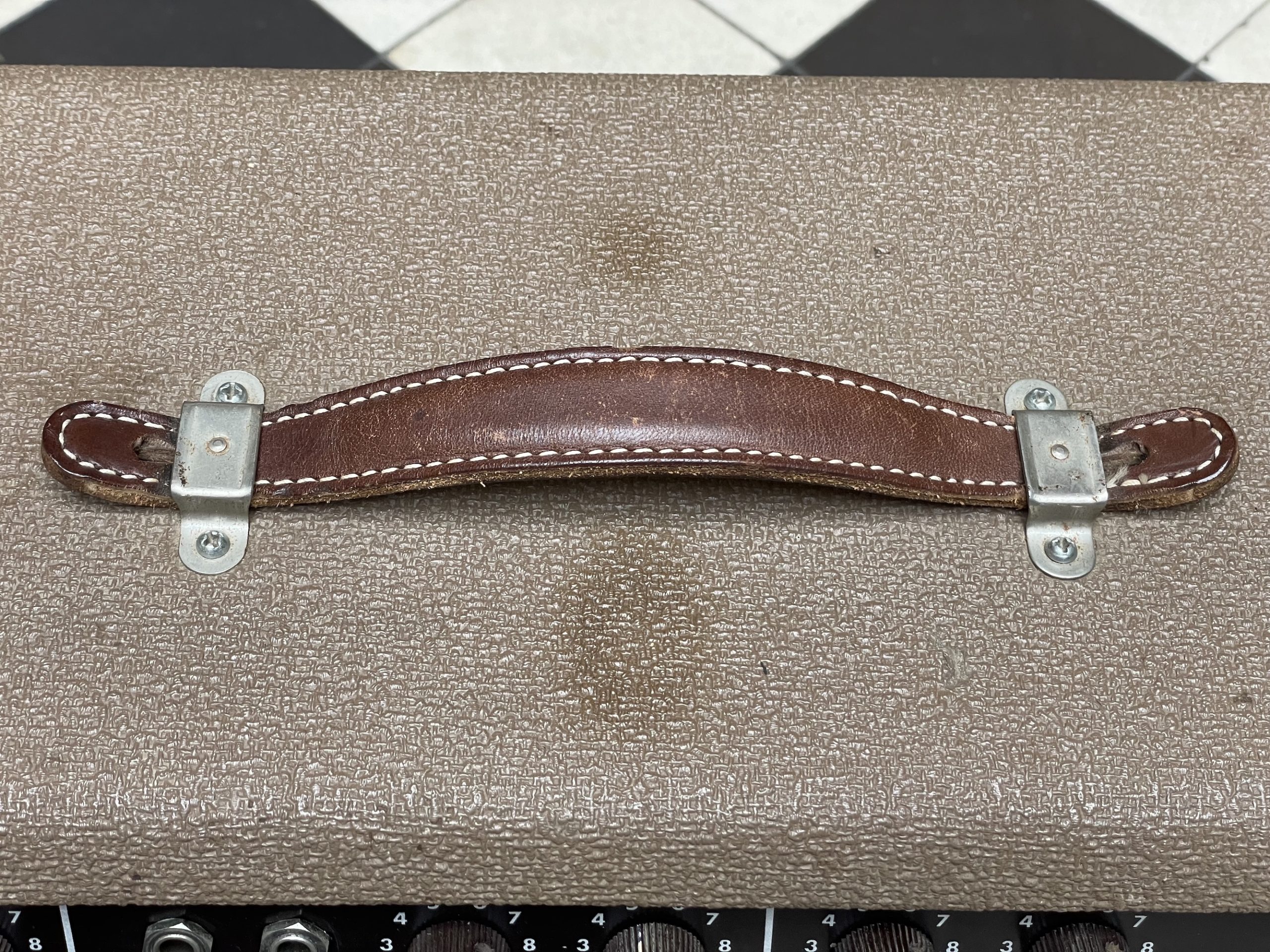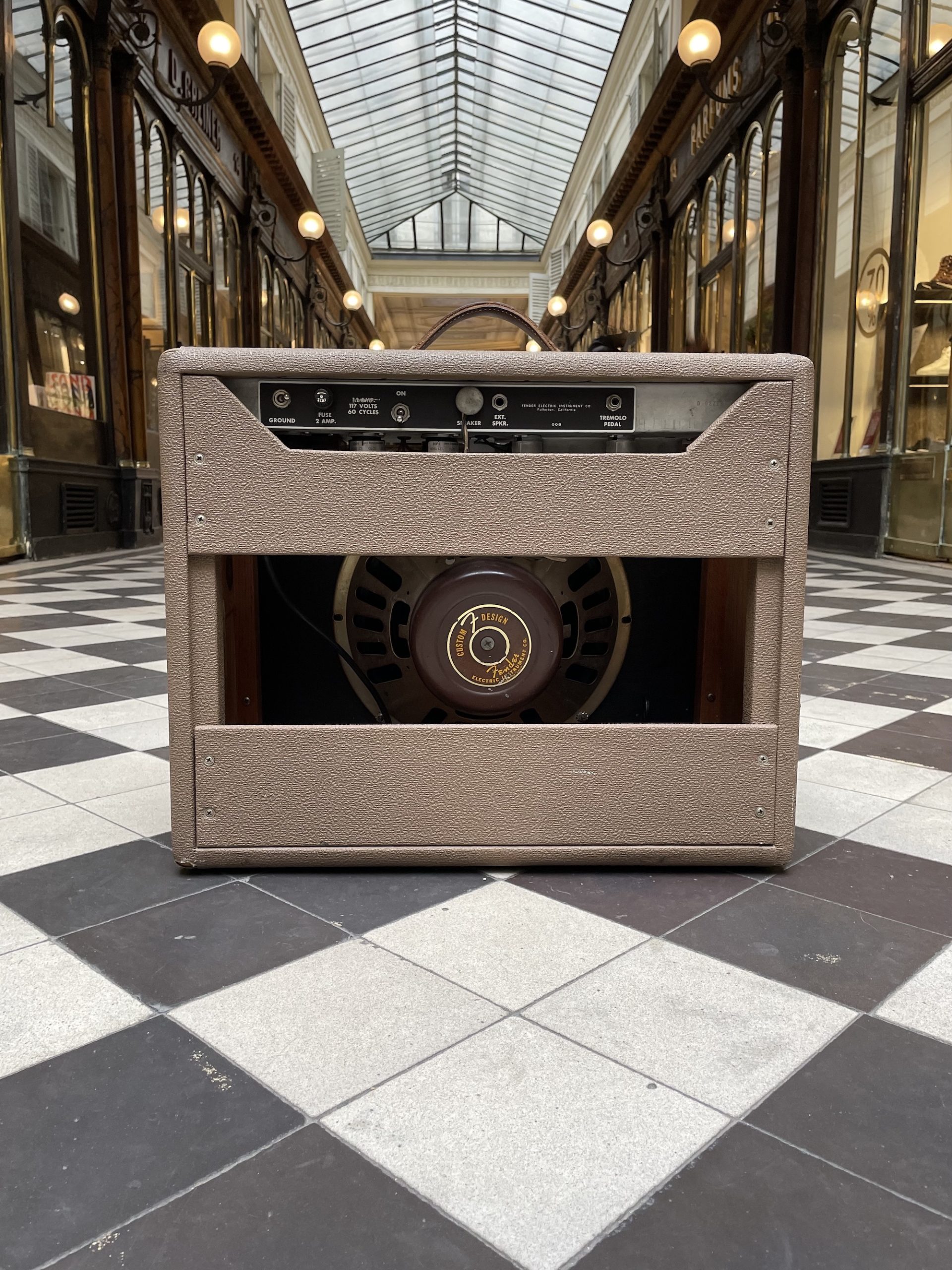 L’exemplaire présenté ici demeure en très bel état, avec l’ensemble de ses parties principales d’origine : on retrouve son haut-parleur Oxford et le jeu complet de transformateurs Schumacher tous datés du début 1962 ; le set de lampes est constitué d’une GZ34 d’époque de marque Amperex “Bugle Boy”, un duo appairé de 6V6GT modernes de marque JJ, et trois 12AX7 dont deux d’époque de marque General Electrics et une moderne de marque Sovtek – toutes ont été contrôlées au lampemètre et présentent les caractéristiques d’émission souhaitables ; l’ensemble des condensateurs chimiques ont été remplacés afin d’assurer le parfait fonctionnement des circuits d’alimentation en haute-tension et de polarisation des 12AX7 ; le cordon d’alimentation na été remplacé par une pièce moderne permettant la mise à la terre du chassis ; nous nous sommes appliqués au nettoyage de tous les connecteurs, supports de lampes, sélecteurs, potentiomètres et avons procédé à l’ajustement du bias des lampes de puissance jusqu’au point optimal – ce Deluxe fonctionne et sonne comme il devrait, en toute sécurité ! Enfin, notons l’état cosmétique remarquable – le tolex marron est intact, de même que les panneaux – même la poignée originale est présente et en bonne forme.