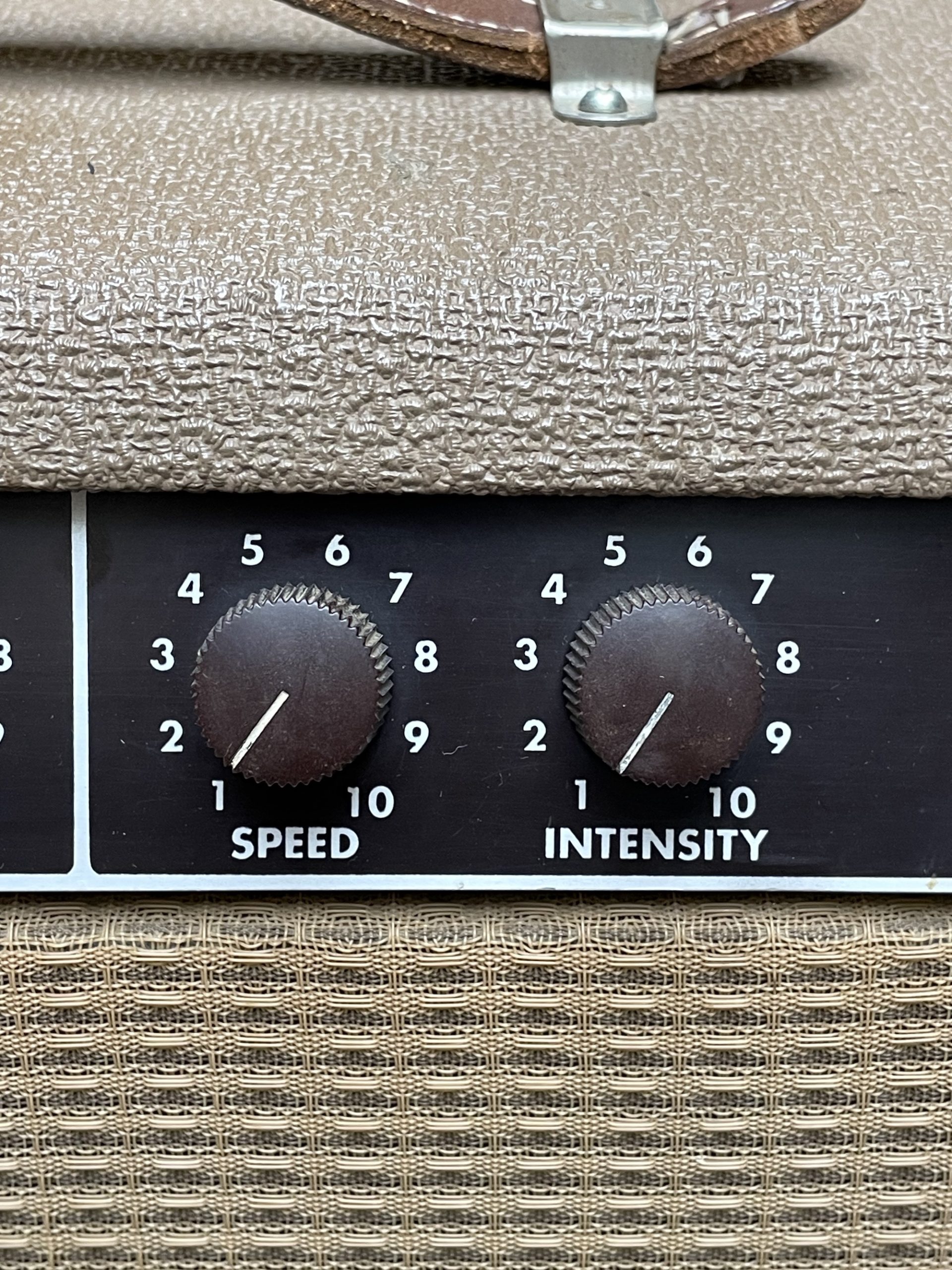 Modèle 110V, vendu avec un transformateur de tension externe ainsi qu’une housse de protection. Footswitch non-original inclus pour commuter le tremolo.