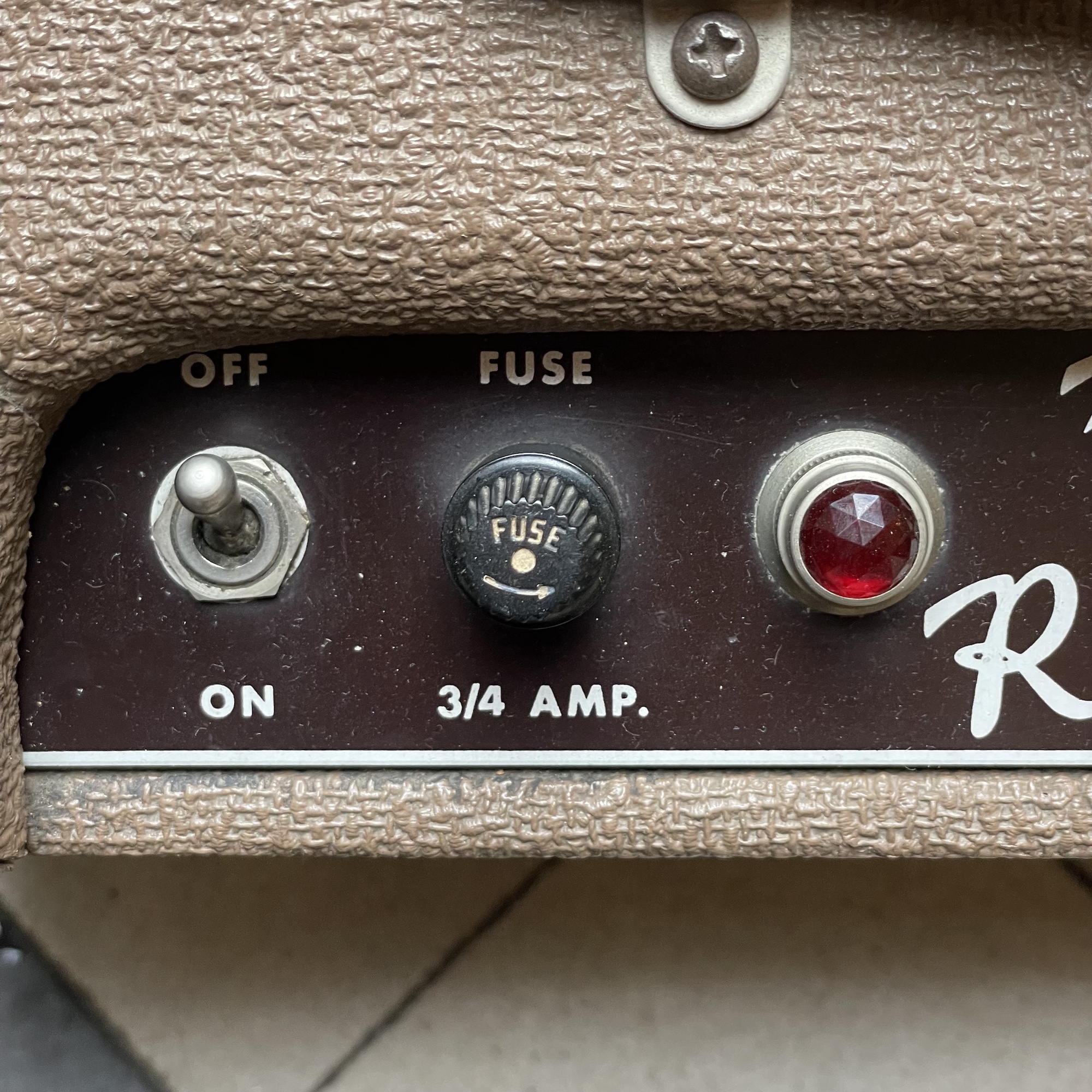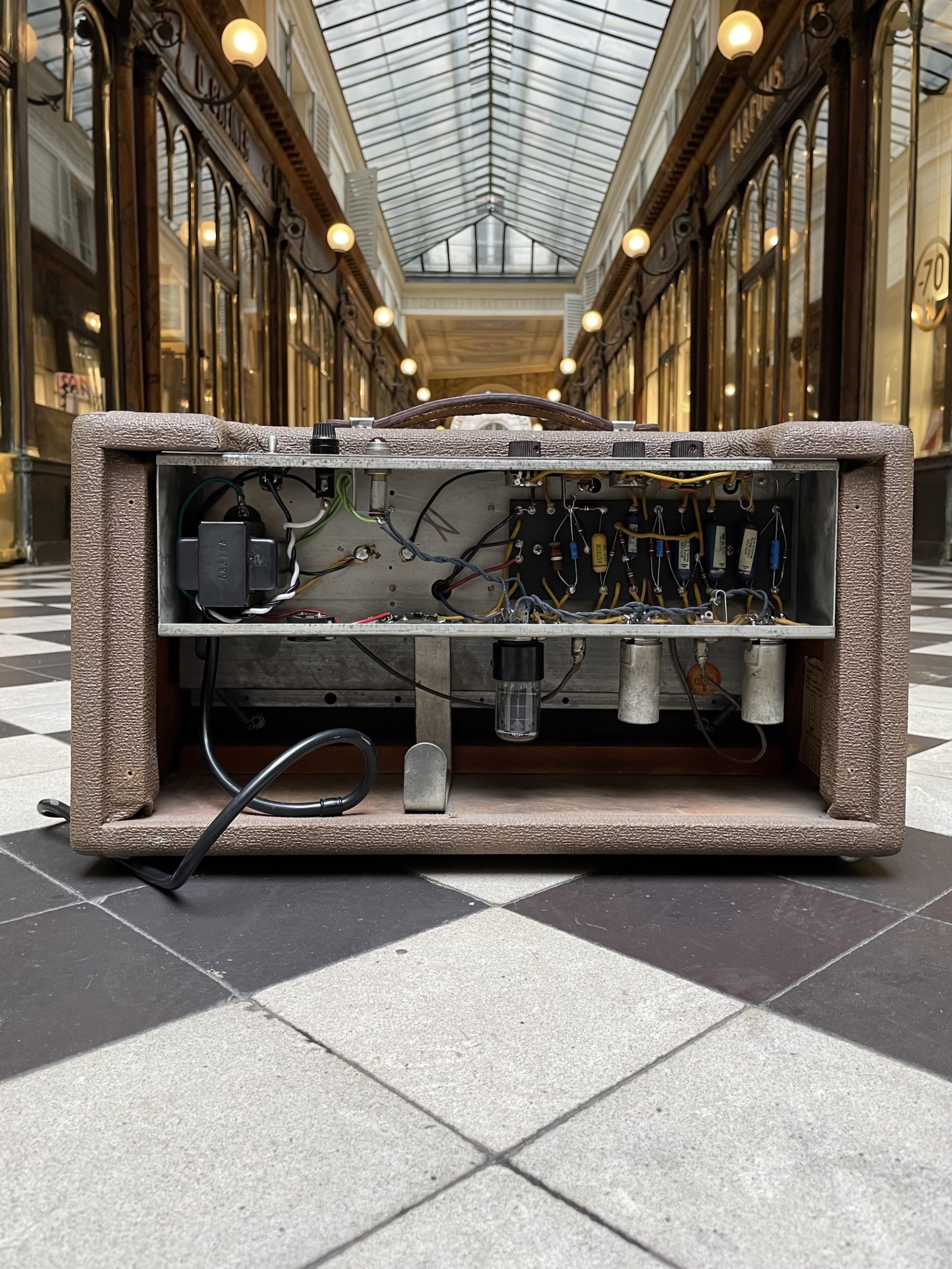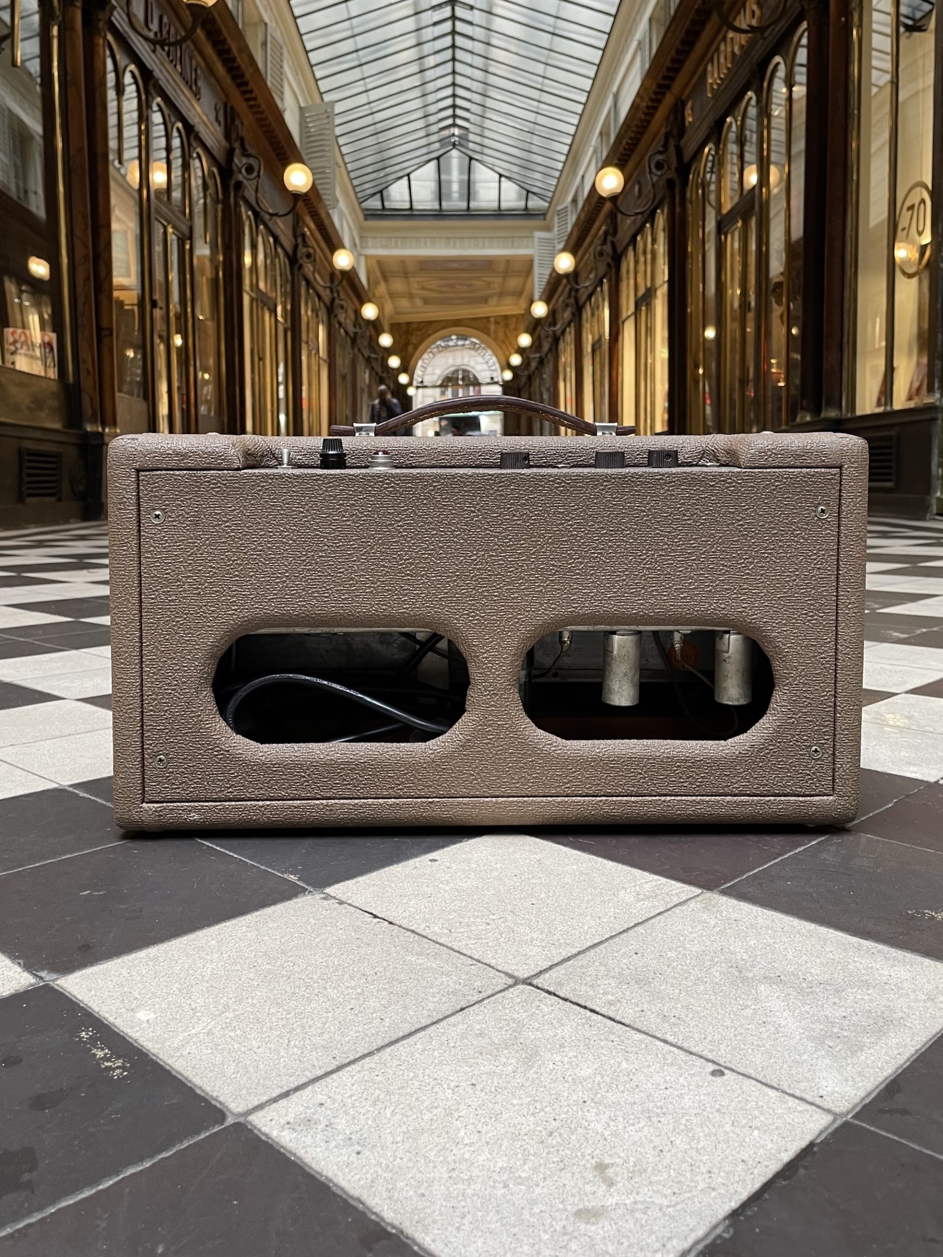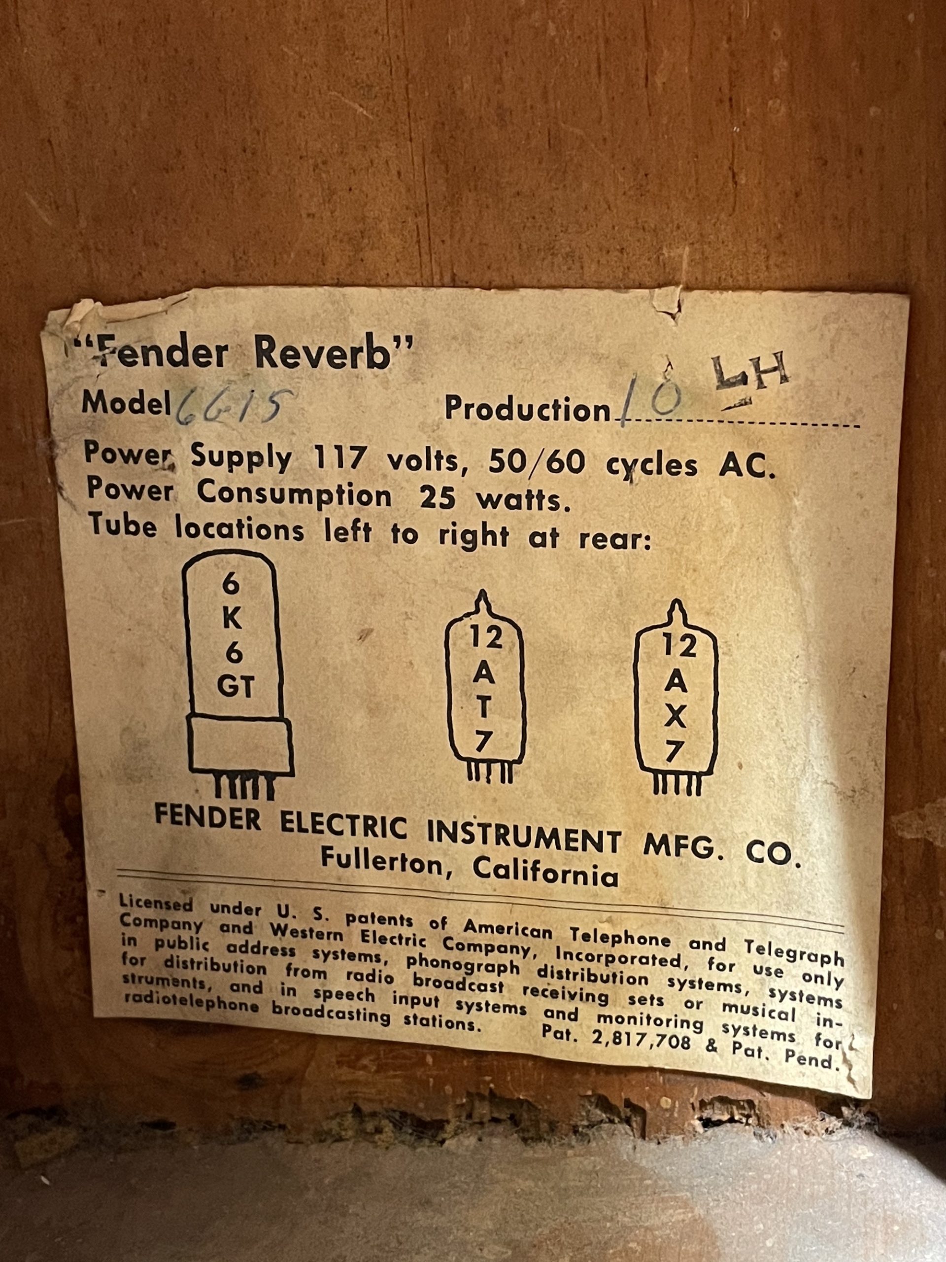 L’exemplaire présenté ici est issu de la seconde année de production, estampillé au mois d’août 1962. On relève les caractéristiques esthétiques typique de l’ère brownface de Fender, avec le logo plat vissé sur la face avant, un boîtier recouvert en Tolex marron et le panneau avant comportant un textile couleur blé (wheat, suivant la nomenclature de Teagle & Sprung). Il est exceptionnellement bien préservé dans son état d’origine, comprenant ses transformateurs, potentiomètres, spring tank, accastillage et visserie originaux exactement comme le jour où il a quitté la chaîne d’assemblage – même l’équerre servant à bloquer le spring tank durant le transport est encore présente ! Seule la poignée a été remplacée par une pièce en copie, avec un revêtement renforçant pour une plus grande durabilité. Nous nous sommes grandement appliqués dans le travail de restauration de cette reverb, effectuant le remplacement nécessaire du cordon d’alimentation original par un cordon moderne avec mise à la terre du chassis et des condensateurs chimiques périmés ; toutes les lampes ont été contrôlées au lampemètre et présentent les caractéristiques d’émission souhaitables ; le reste des composants passifs (condensateurs de signal et résistances) a été soigneusement mesuré afin de vérifier que tous permettent à l’appareil de fonctionner selon les caractéristiques souhaitées ; nettoyage complet de tous les connecteurs, supports de lampes, sélecteurs, potentiomètres – ces opérations, nécessaires à la sécurisation de l’appareil et à son fonctionnement optimal, ont été effectuées avec le souci de préserver au maximum de son aspect original. Après son passage dans notre atelier, cette Reverb 6G15 est prête à repartir pour encore des décennies de musique.