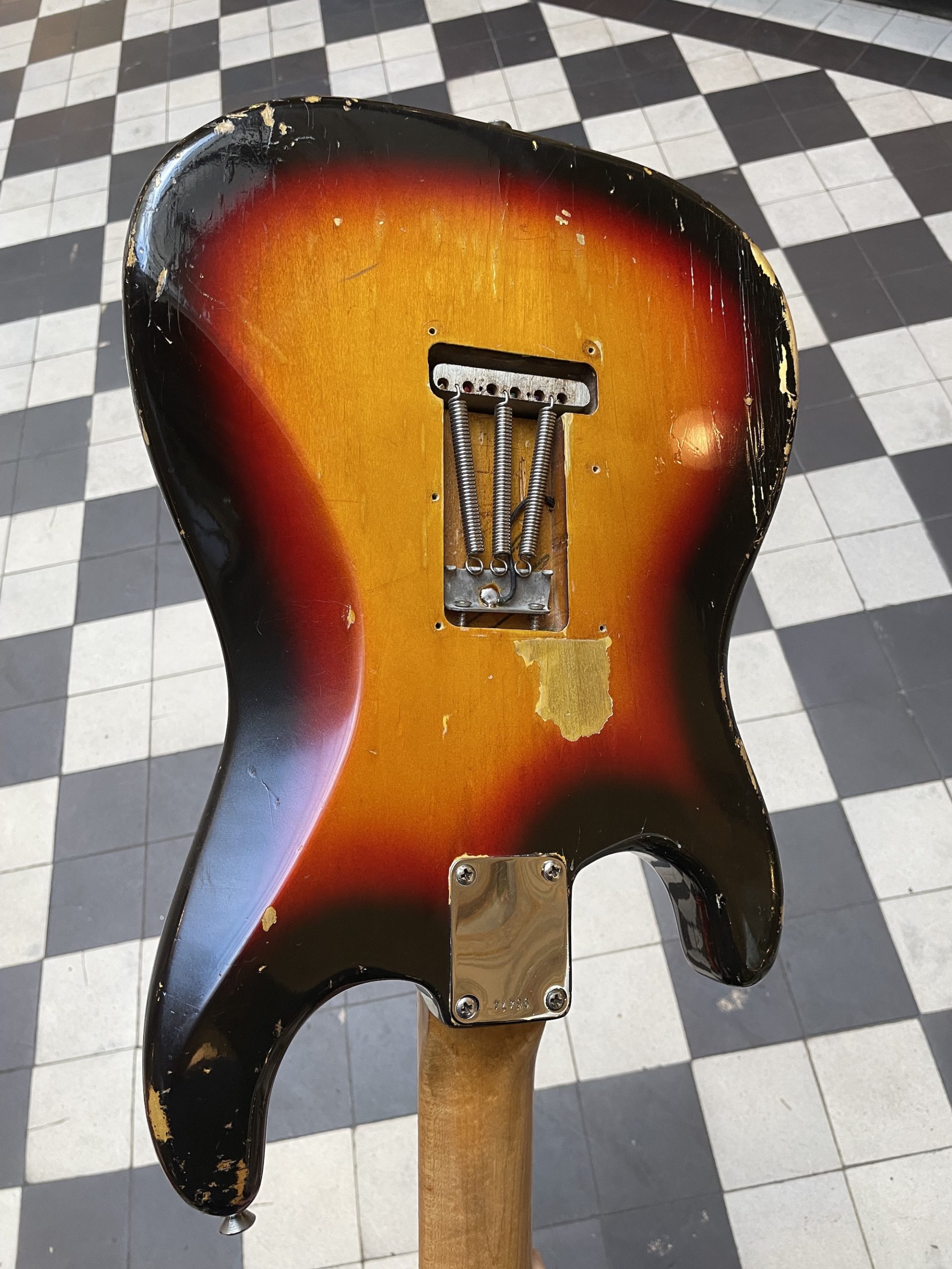 L’instrument présenté ici voit le jour au coeur de l’âge d’or de la surf music et alors que l’ère Fender pre-CBS atteignait son paroxysme. Les Strats pre-CBS sont essentiellement caractérisées par deux éléments : leur finition Sunburst 3-tons déclinant du noir au jaune en passant par le rouge, et le manche en érable surmonté d’une touche en palissandre – sur ce modèle de 1963, l’épaisseur de palissandre est fine et plaquée sur le manche en érable qui est doté d’un radius. Cette construction est dénotée veneer board, par opposition à la construction précédente dite slab board où Fender employait une épaisse conséquente de palissandre collée à plat sur le manche. La raison avancée pour ce changement est la différence de retrait des deux essences de bois sous l’effet des variations hygrométriques, plus difficiles à corriger sur une slab board qu’une veneer board – bien que des motifs économiques semblent aussi tout à fait plausibles ! On retrouve par ailleurs le logo spaghetti – un héritage de la décennie précédente, présent sur les Stratocasters pendant encore quelques temps après la production de cette guitare avant d’être remplacé par un logo plus large dit de transition, à l’identique de celui déjà présent sur les Jaguar et Jazz Bass ; les incrustations de touche dites clay dots ; un pickguard en acétate de cellulose dont la couleur a tourné au vert comme c’était fréquemment le cas avant que Fender ne les remplacent par une plaque en ABS ; un jeu de six mécaniques individuelles Kluson Deluxe. Tous ces éléments, ainsi que les trois micros simple bobinage grey bottom, le câblage en fil tissu ainsi que les potentiomètres datés à la bonne année et le condensateur de tonalité sont d’origine. Voici donc un exemplaire pur d’une guitare mythique, préparée et réglée pour le jeu, prête à repartir pour encore des décennies de jeu.