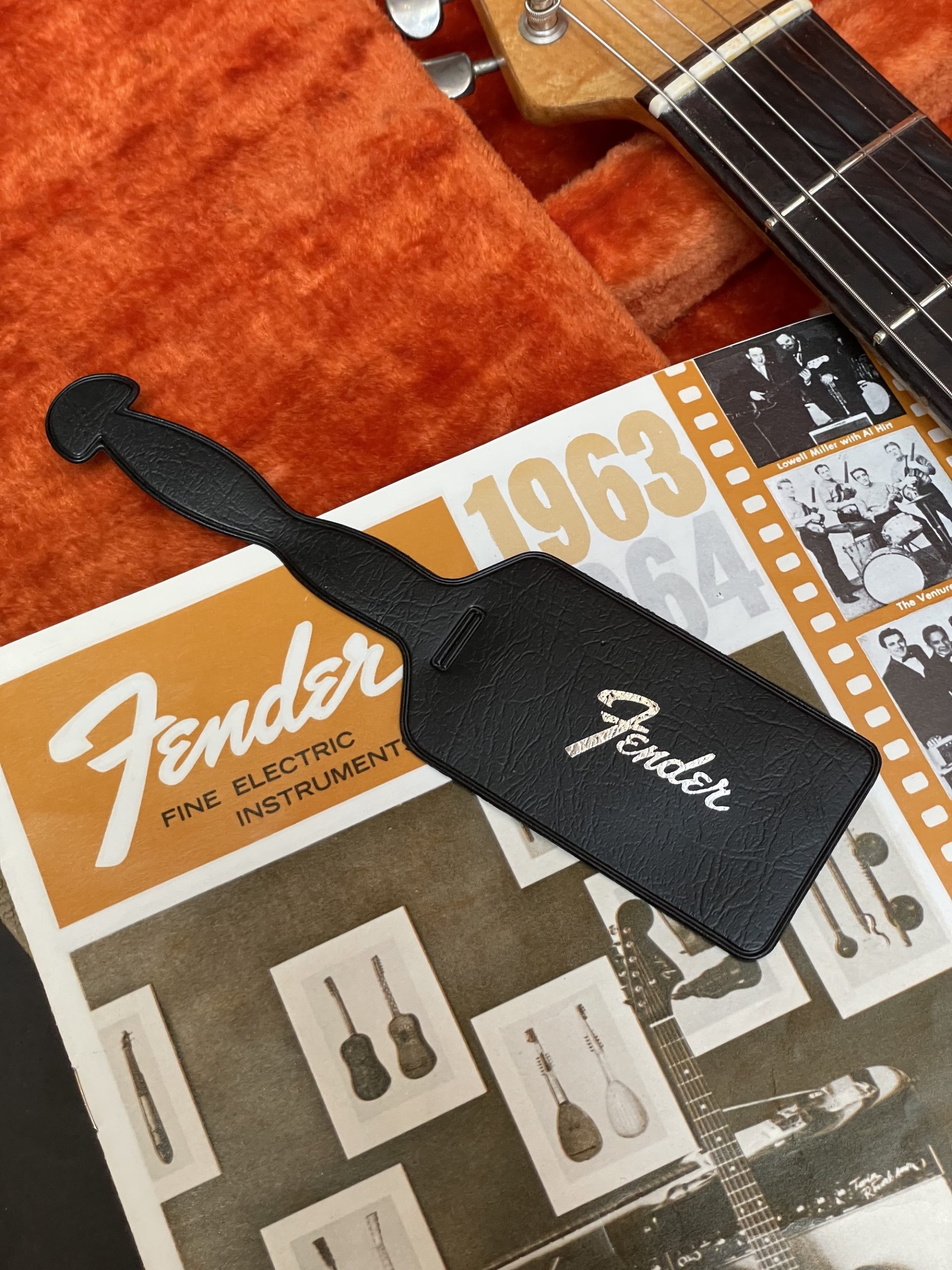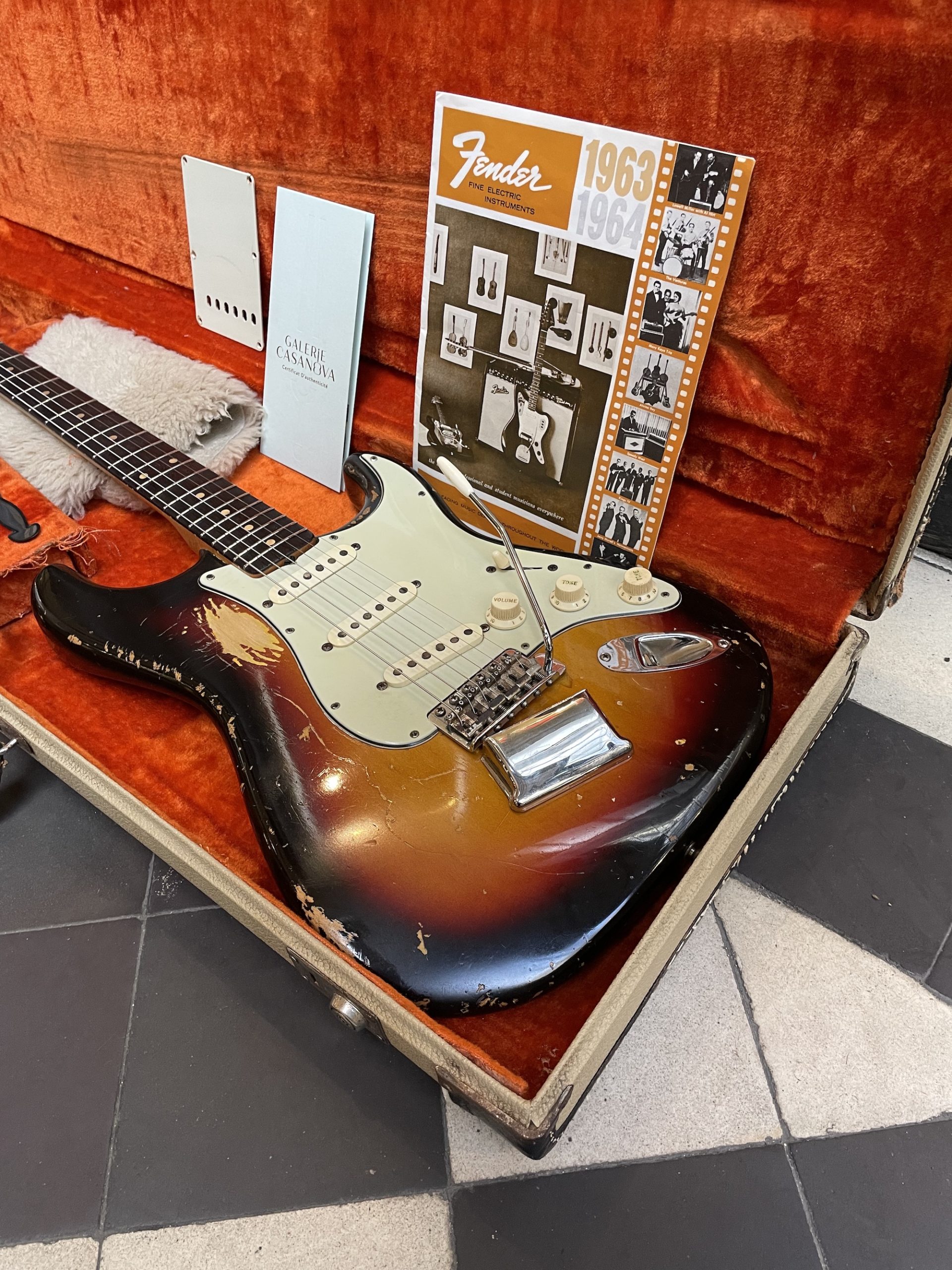 Vendue dans son étui Fender white tolex d’origine, avec un superbe ensemble d’accessoires originaux : tige de vibrato, câble jack, sangle, étiquette pour l’étui, cache-chevalet ashtray. Ce lot est complété par une reproduction du catalogue Fender 1963-1964. La guitare est vendue accompagnée de son certificat d’authenticité réalisé par Jérôme Casanova.
