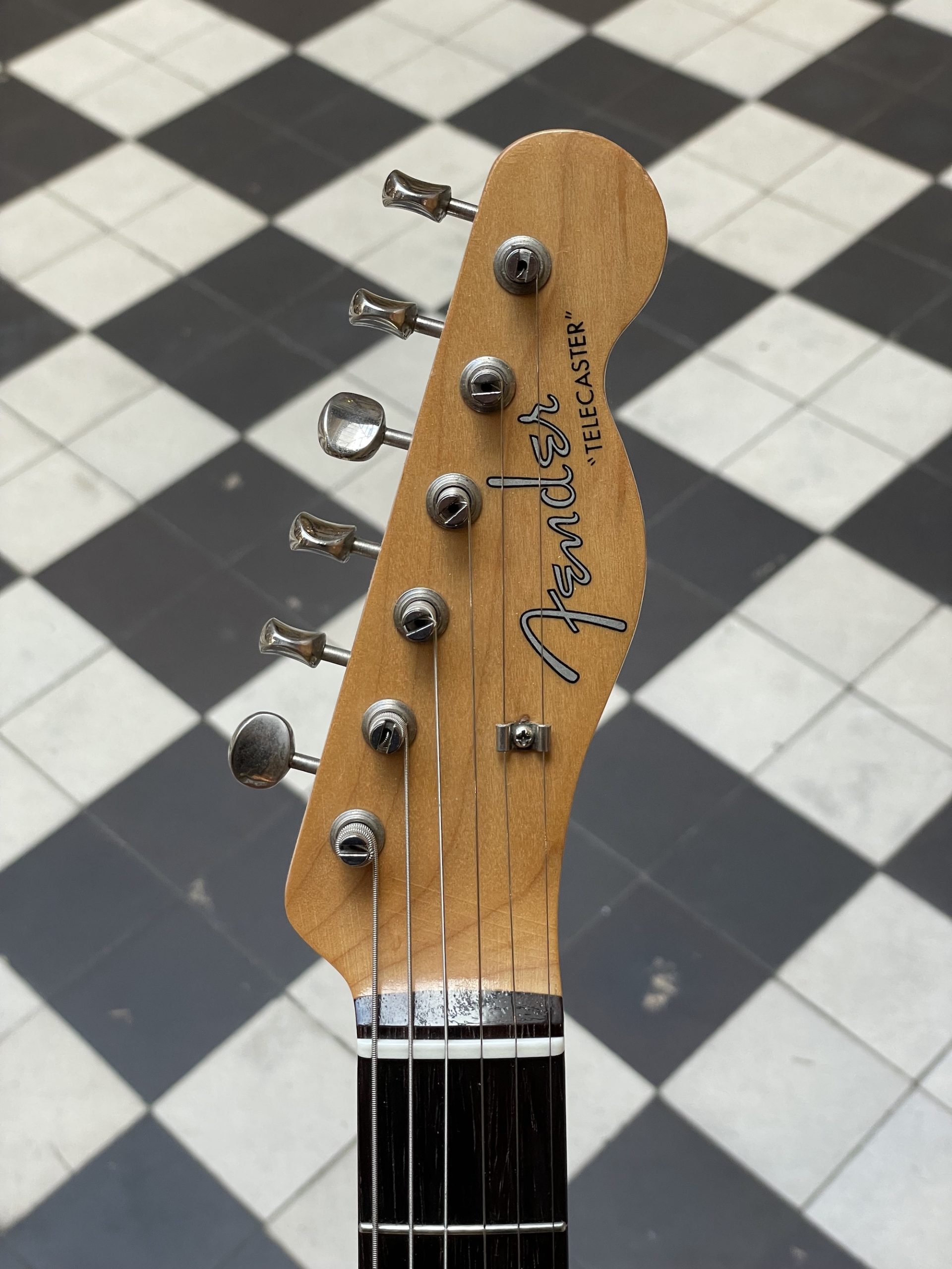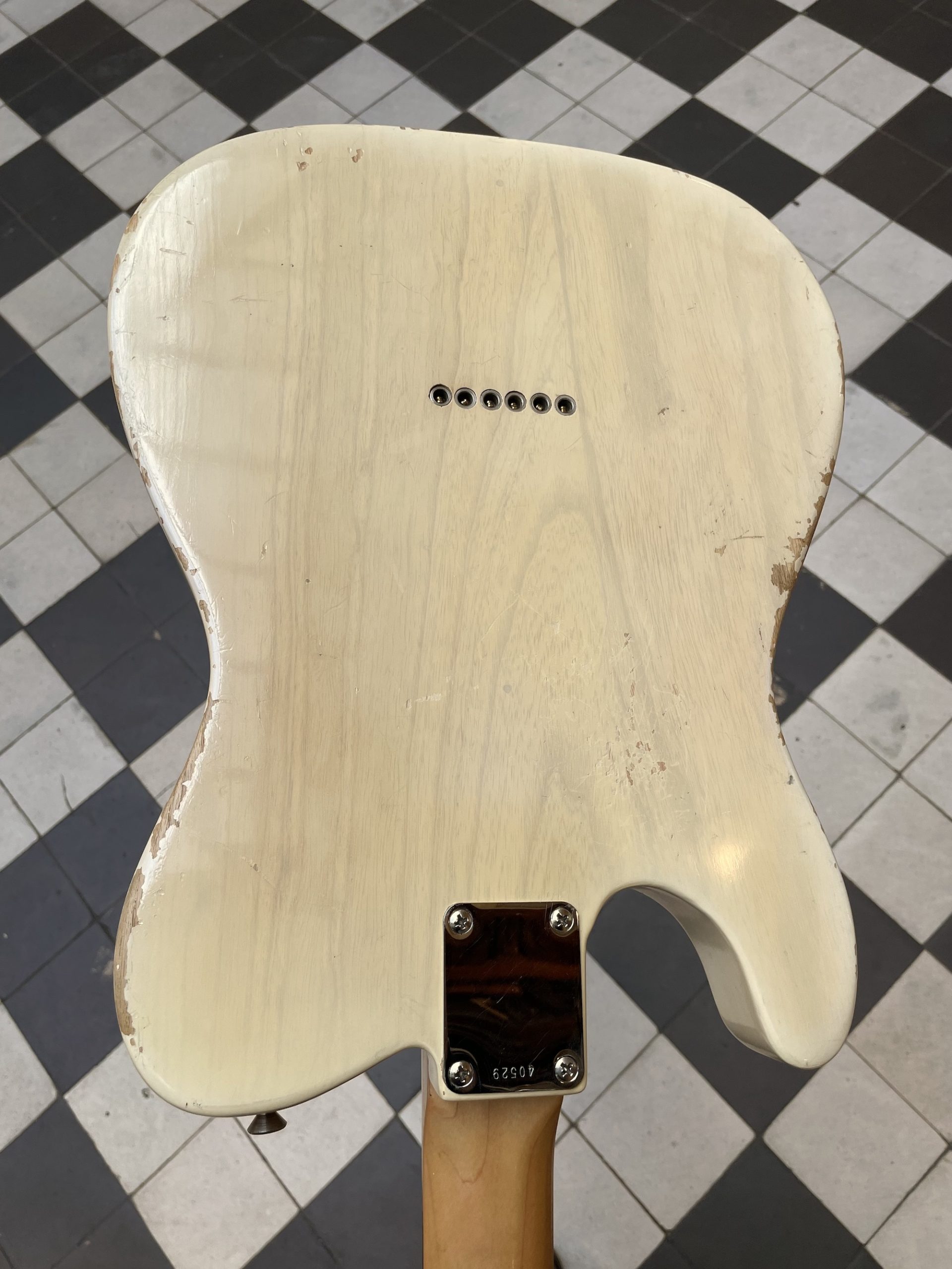 Attardons nous sur une caractéristique particulièrement intéressante : bien que le design de la Telecaster ait été essentiellement figé depuis plusieurs années, Fender entreprend une modification vers la fin 1958 de la configuration du chevalet. Au lieu de la construction dite through-body où les cordes sont montées via des perçages à l’arrière du corps, un nouveau système dit top-loader est introduit, permettant de monter les cordes à travers des perçages directement sur la partie inférieure de la base du chevalet. La raison de cette modification n’est pas établie avec certitude : certains spéculent que la visée était de reproduire l’introduction fructueuse du chevalet top-loader sur la Precision Bass peu auparavant, cependant l’hypothèse la plus probable est simplement une réduction du temps nécessaire donc du coût de la conception des corps (pour qui ne s’y est pas exercé, on soupçonne mal la difficulté d’aligner précisément et uniformément six perçages dans un bloc de bois de plusieurs centimètres d’épaisseur !). Le chevalet top-loader est loin de faire l’unanimité, puisqu’il modifie assez radicalement le mode vibratoire de la Telecaster et la sonorité qui en résulte. Sans surprise, il est rapidement abandonné et Fender revient au design through-body initial. Le présent exemplaire témoigne de ce bref épisode : construit à la fin 1959, il est doté de la construction traditionnelle avec les cordes traversant le corps, cependant la base du chevalet originale est garnie à la fois d’une rangée de perçages pour le montage through-body et d’une rangée secondaire pour le montage top-loading, rendant les deux options possibles pour ceux désireux de se forger leur propre avis sur la question. Pour clore cette anecdote, notons que bien que la configuration top-loader n’ait pas conquis suffisamment de joueurs de Telecaster à la fin des années 50 pour rester, au moins deux artistes en ont fait un emploi notoire dans les années 60 : Jeff Beck acquiert un modèle slab board / top-loader de 1959 à l’occasion de son entrée dans le groupe The Yardbirds en 1965 comme guitare spare en cas de défaut sur son iconique Esquire, avant d’en faire cadeau à Jimmy Page en remerciement de l’avoir introduit auprès des autres membre du groupe. Page en fera sa guitare principale durant son temps avec les Yardbirds jusqu’à son passage à Led Zeppelin et l’enregistrement de leur premier album en 1969 (à cette époque, la Telecaster est ornée d’une finition customisée représentant un dragon psychédélique valant à l’instrument le surnom de Dragon). Pour les cinéphiles parmi nos lecteurs, c’est cette même guitare qu’on aperçoit fugacement jouée par Page avec les Yardbirds dans le passage mythique du Blow-Up d’Antonioni (1967) – quelques instants avant que l’audience initialement impassible ne se rue sauvagement sur les morceaux d’une guitare fracassée sur scène par un Jeff Beck enragé. Ainsi, si l’on voulait reproduire à l’exacte la configuration de cette guitare légendaire tout en se réservant la possibilité du montage traditionnel, on ne pourrait pas mieux trouver que la Telecaster présentée ici !