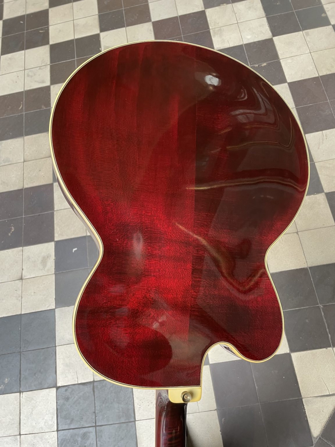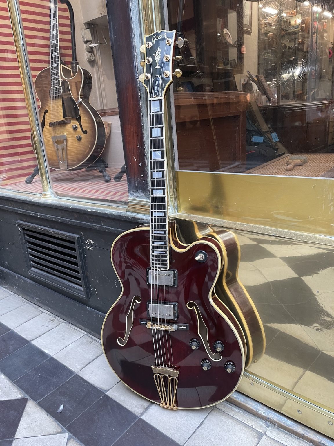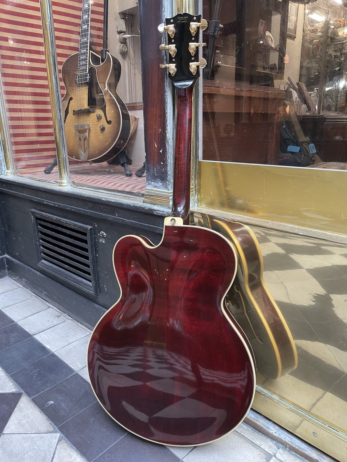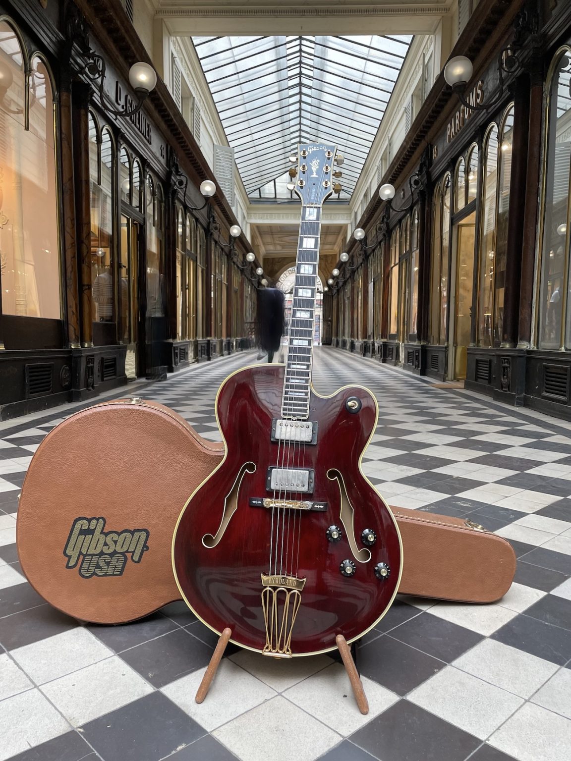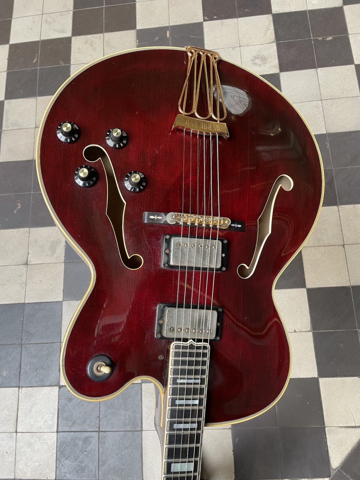 This guitar, first produced in 1955, was Gibson’s top of the line, having been created as a custom order for session guitarists Billy Byrd and Hank Garland – the name “Byrdland” comes from the association of both of their names. Based of the L-5 shape with a reduced scale length, the Byrdland was the first thinline archtop produced by Gibson, and stands out where its ornementation is concerned: an ebony fretboard with pearl block inlays, gold plated hardware including a loop-shaped tailpiece, the recognizable “Flowerpot” pearl inlay on the headstock right under the Gibson logo…