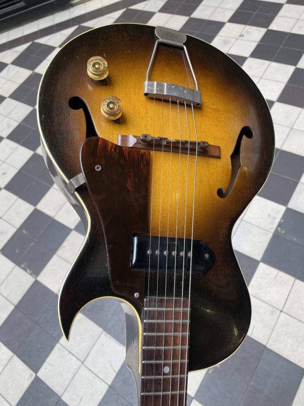 Cette ES-140 produite vers 1953 (l’une de 409 exemplaires expédiées durant cette année de pic de production) demeure à ce jour intègre et complète avec ses éléments principaux d’origine, et en parfait état de jeu après avoir été réglée et préparée dans notre atelier. À noter qu’il s’agit du modèle doté d’une caisse de pleine profondeur – celui-ci se différencie du modèle ES-140T qui dispose, lui, d’une caisse thinline et vient en remplacement de l’ES-140 à partir de 1957.