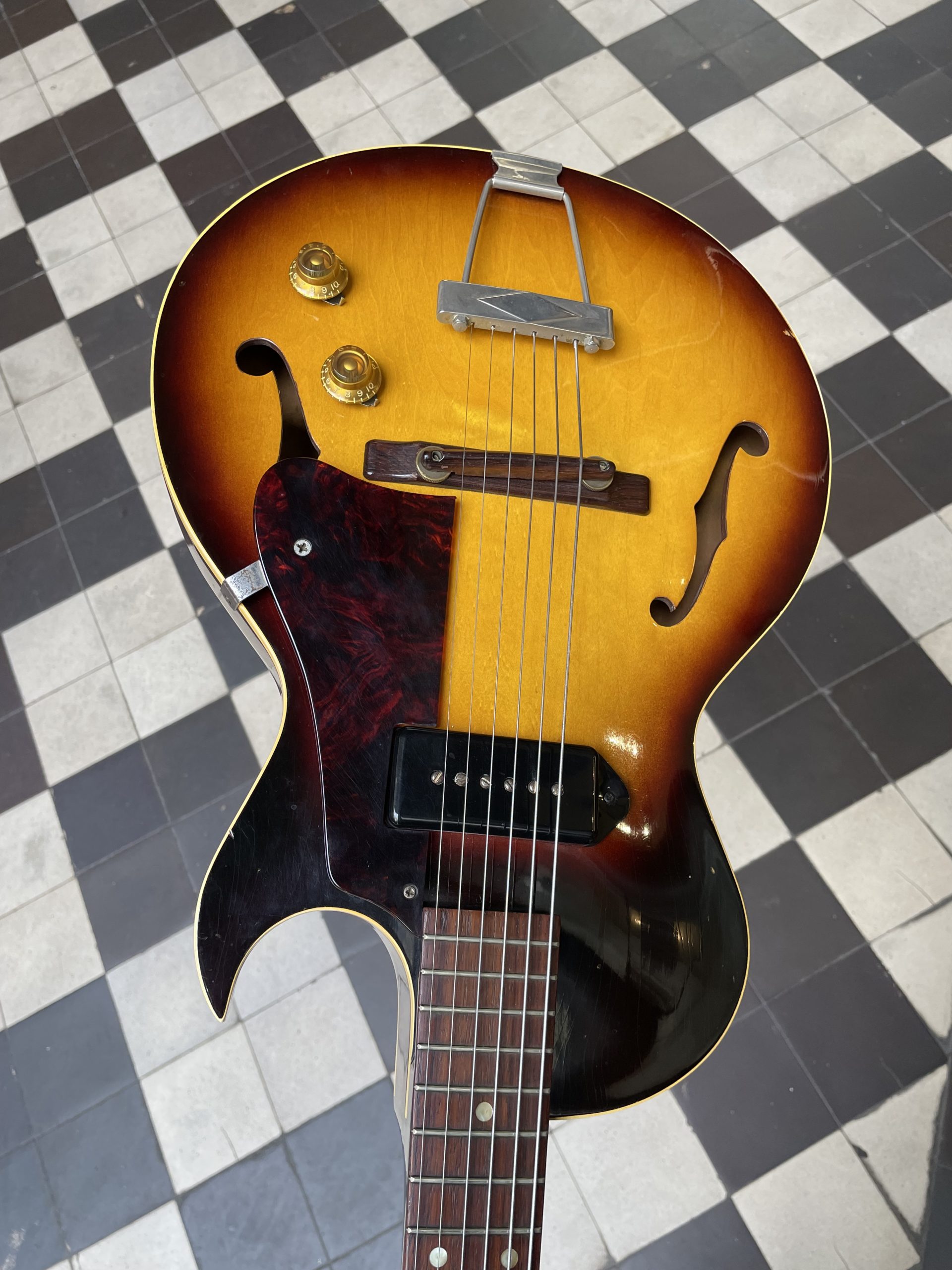 After a first appearance in a non-thinline form in 1950, the ES-140 3/4 T is introduced to the catalog in 1957, the year of manufacture of the present guitar. Gibson boasted an instrument designed for children or adults with small hands (sic.) with all of the qualities of a professional instrument, and a format allowing for great playing comfort in particular thanks to the short scale neck – in short, we are not to trust appearances!