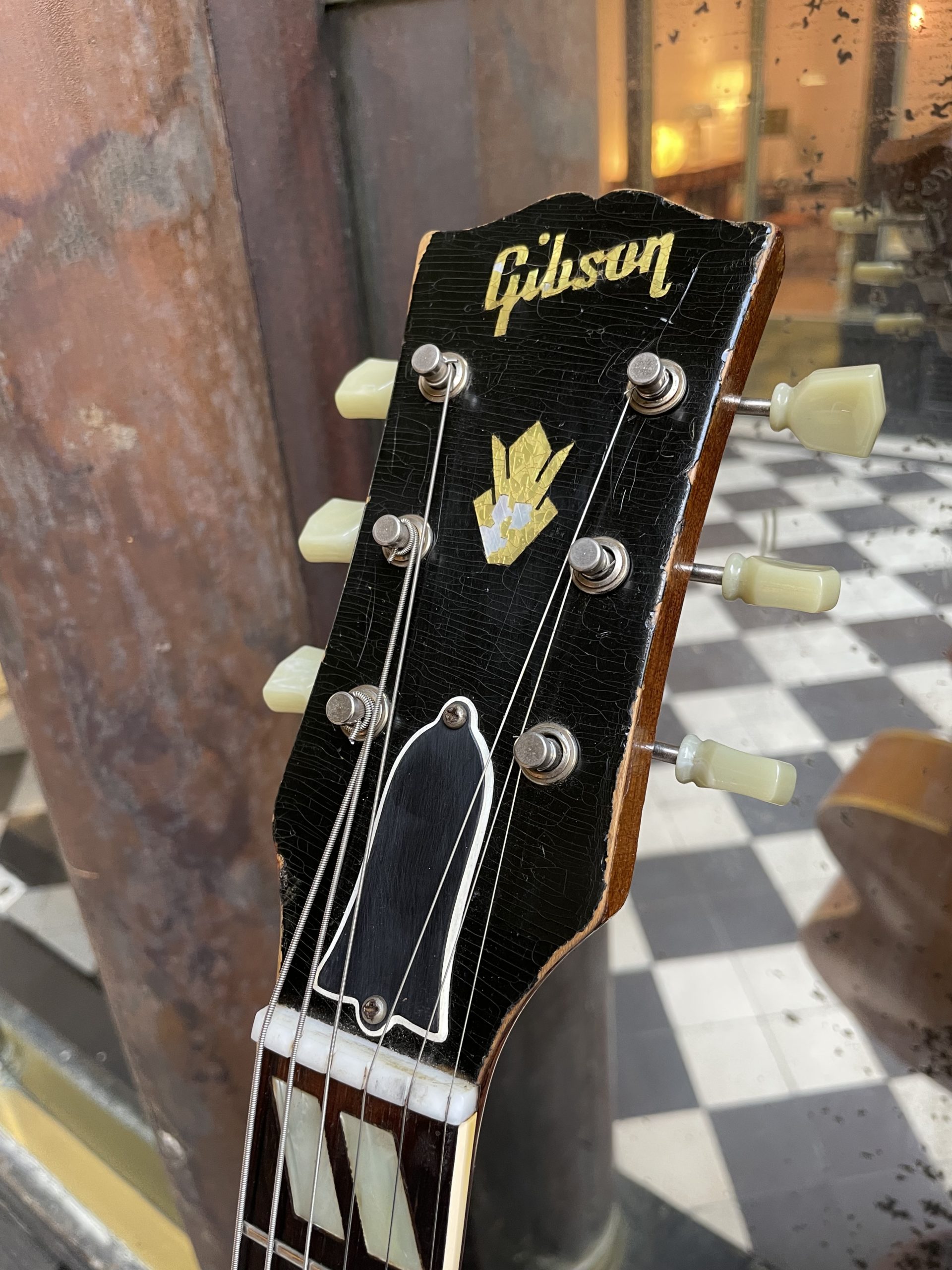 L’ES-175 présente une construction avec une caisse en érable laminé, ici dans une finition Natural qui a superbement faïencé au fil de ses 60 années d’existence. Le manche en acajou est surmonté d’une touche en palissandre comportant les incrustations à double parallélogramme. La tête présente le logo Gibson et l’incrustation en forme de couronne, et porte des mécaniques Kluson en copie, les boutons des mécaniques originales (conservées dans l’étui) s’étant dégradés. On retrouve également le cordier en zig-zag, un important marqueur visuel du modèle qui vient l’équiper à partir de 1956.