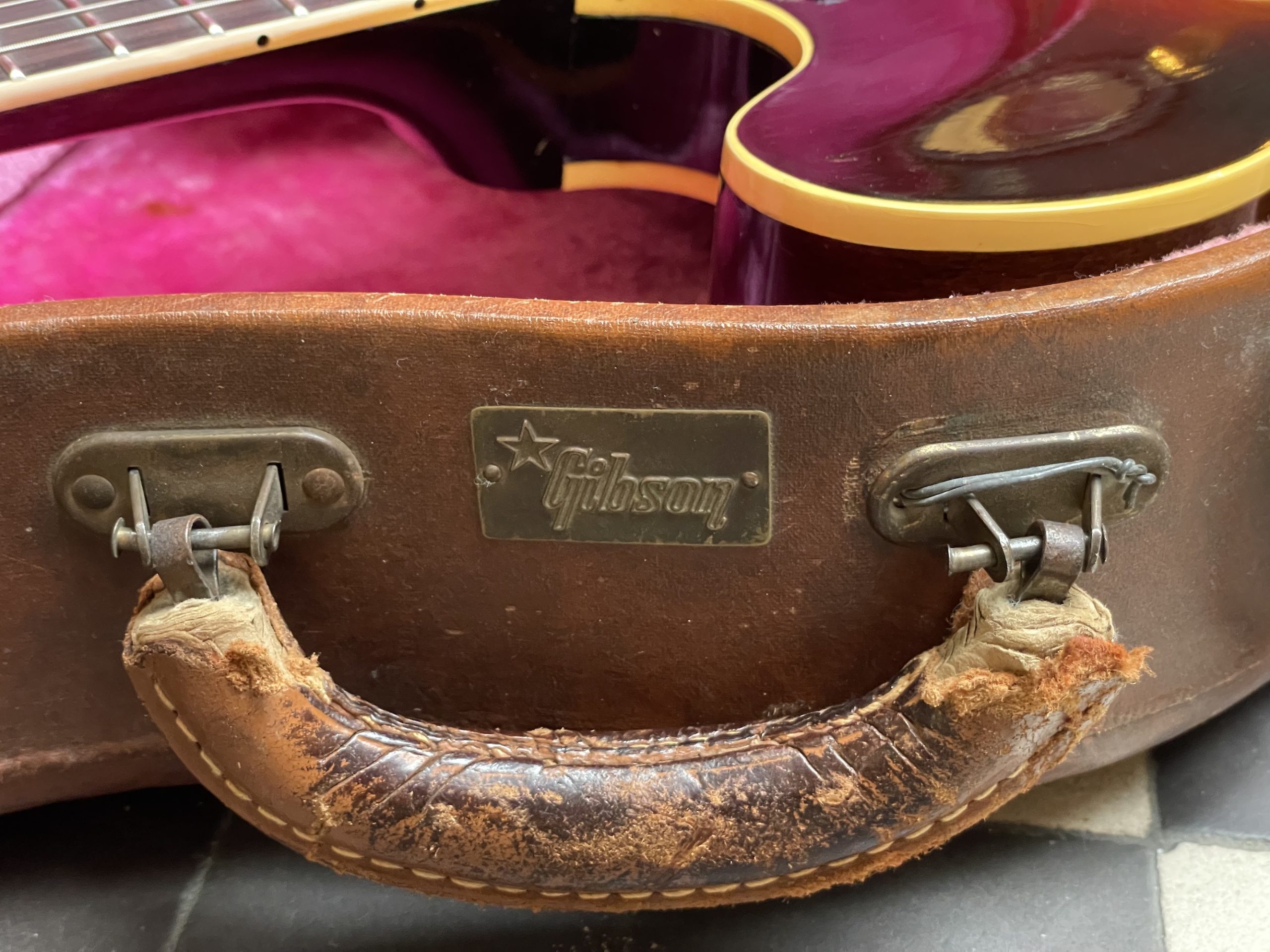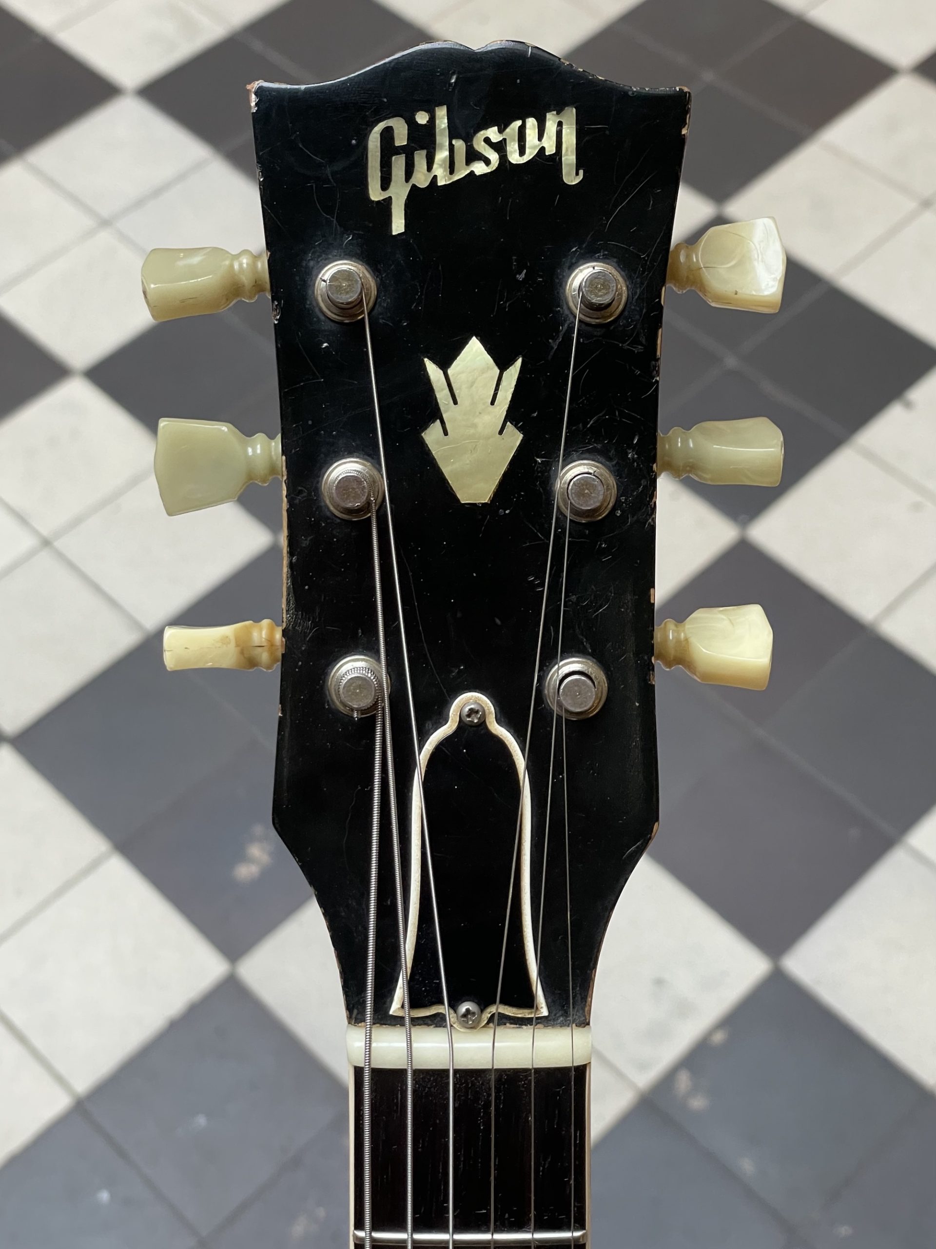 L’instrument présenté ici nous provient de la première génération de 335, et est à bien des égards de grand intérêt : d’une part, elle présente bien sûr sa paire de micros humbucker portant leur étiquette Patent Applied For, les fameux “PAF” qui vont inscrire de façon permanente le son Gibson dans la culture musicale internationale – on ne peut qu’apprécier le grain incroyable de ces micros, encore largement produits de façon semi-artisanale au début des années 60 avant la standardisation des méthodes de fabrication plus tard dans la décennie – en cela, on peut noter des caractéristiques sonores particulière pour chaque paire de PAF, et celle-ci ne déçoit pas. Elle n’a jamais été séparée de l’instrument, et tout le câblage et les composants associés sont à ce jour inaltérés. Il est intéressant de noter que cette ES-335 comporte un numéro de série Artist employé par Gibson de 1947 à 1961 indiquant que la guitare a quitté Kalamazoo en janvier ou février 1961 (pour mémoire, le dernier numéro de série Artist est le A36147, appliqué le 21 février 1961 et précédant le numéro de notre guitare de quelques dizaines d’unités seulement). Le FON (Factory Order Number), numéro tamponné sur la guitare permettant à Gibson de suivre la fabrication de lots d’instruments à l’usine, correspond à la toute fin d’année 1960. Ces deux éléments de serialisation permettent de cerner assez précisément la date de construction et d’expédition de l’exemplaire présenté ici.
