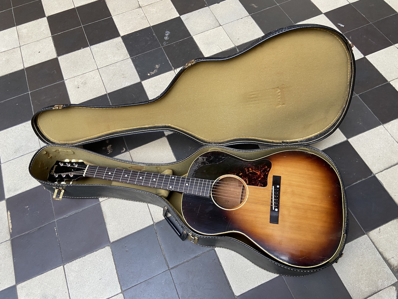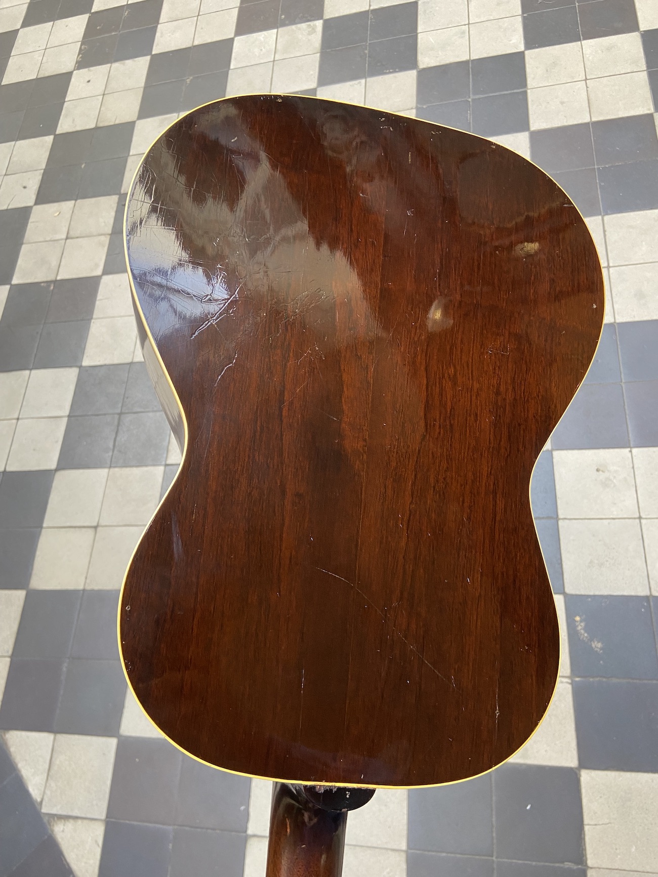 At the time of its introduction in 1947, the LG-1 was the least expensive flat-top guitar offered by Gibson. Originally marketed as an affordable yet well-built study instrument or for guitarists desiring a low priced model, Gibson did however give it the same care in crafting and in wood selection as they did for their more expensive LG-2 model. Both guitars have the same spruce top, mahogany sides and back, one-piece mahogany neck with rosewood fretboard. There is however a major difference between the LG-1 and LG-2 models, which resides on the type of bracing used on either guitar: while the LG-2 has the ubiquitous “X-bracing”, the LG-1 has a straight-across ladder bracing composed of parallel braces under the top. This results in a dryer and more snappy sound on the LG-1 compared to its X-braced counterpart, which makes it well adapted for blues.