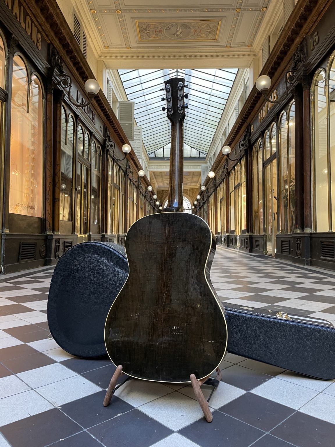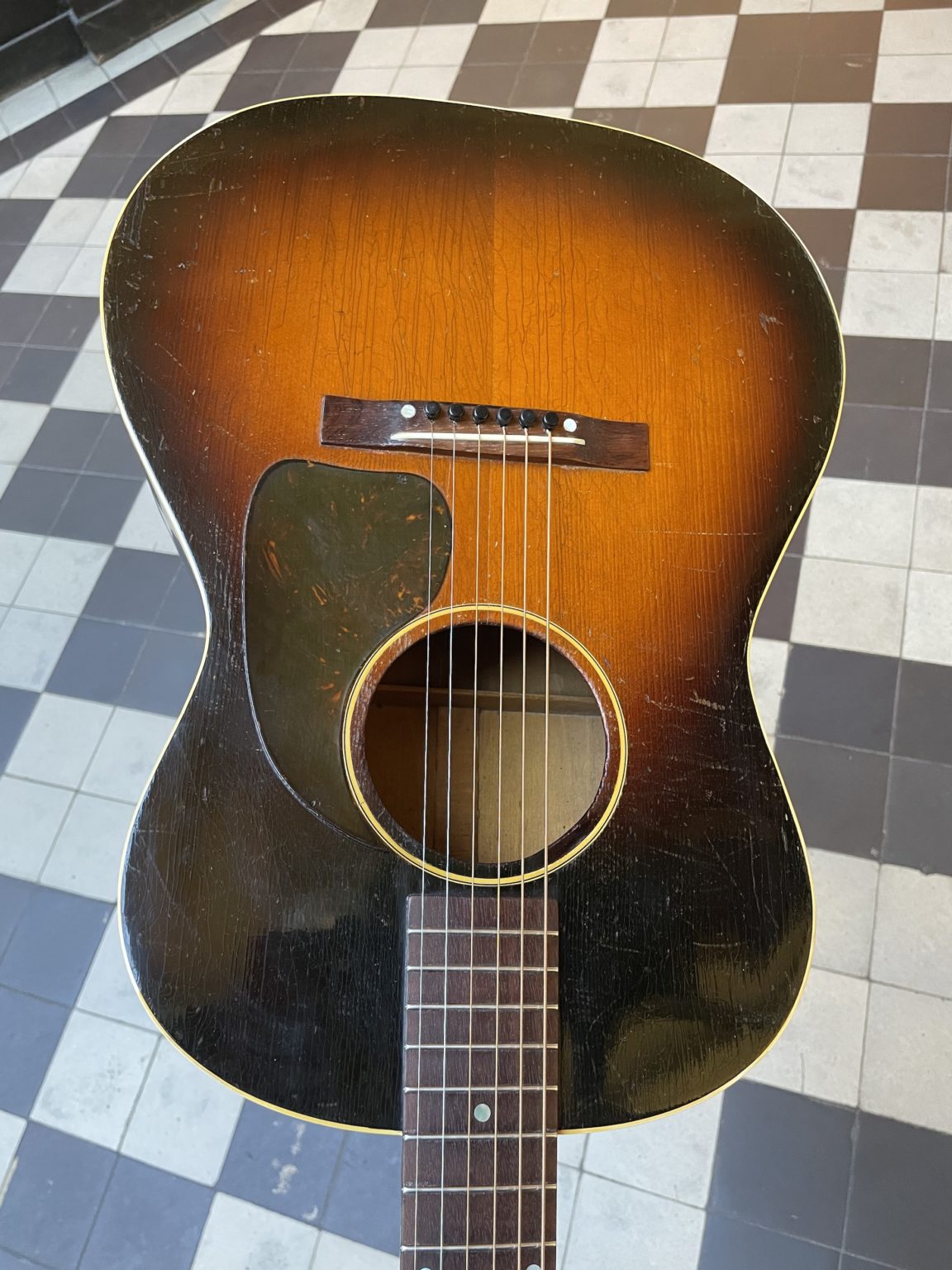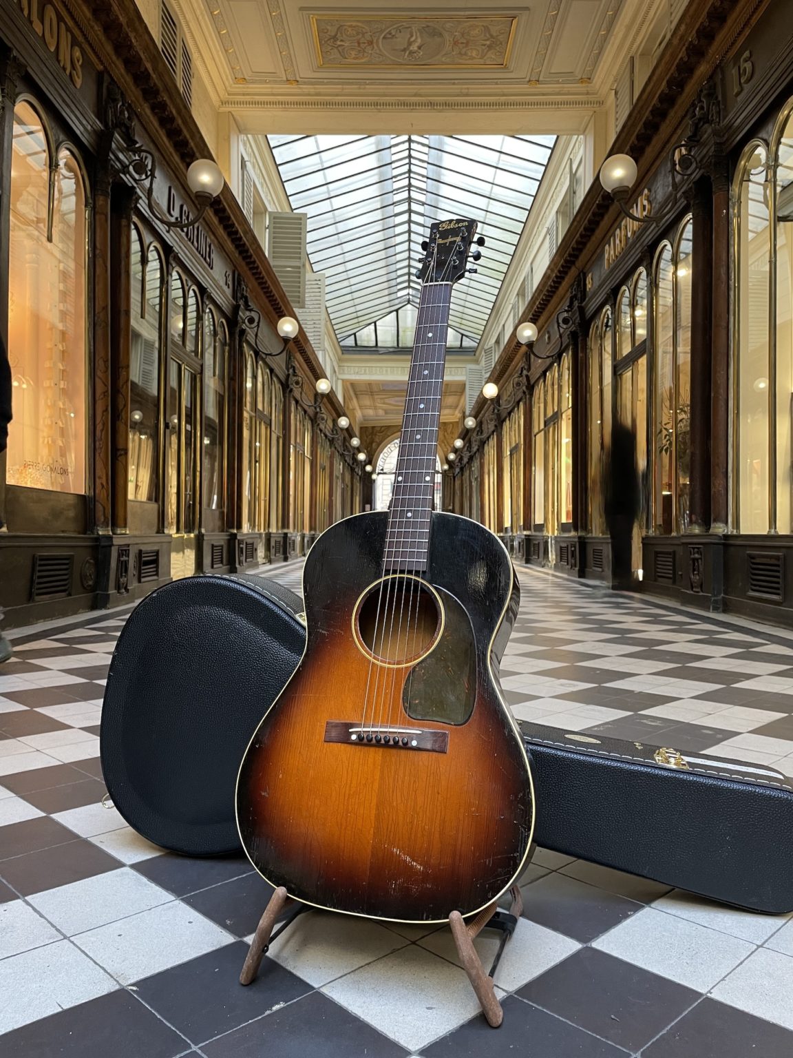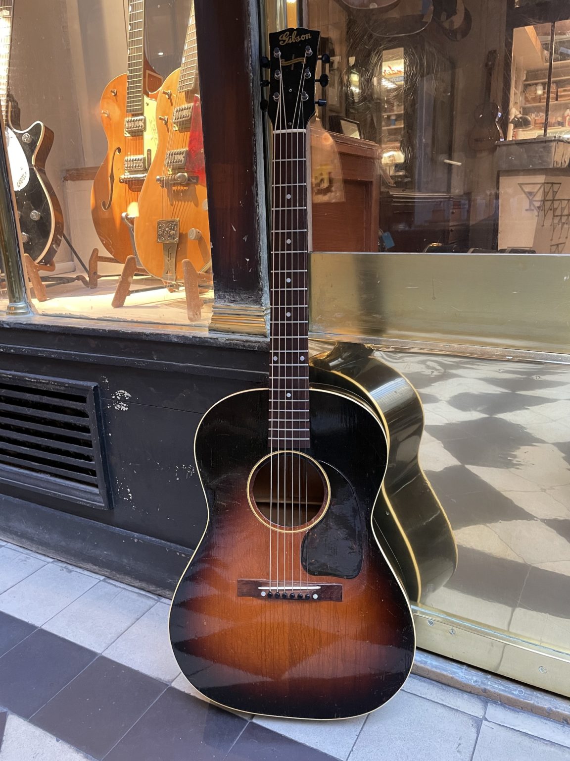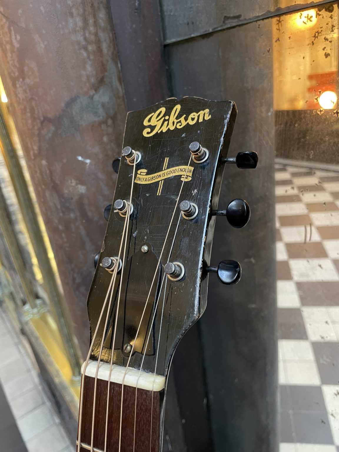 Voici un exemplaire particulièrement bien préservé des fameuses guitares “Banner”, construites pendant la Seconde Guerre mondiale et ainsi nommées en raison du decal appliqué sur la tête des instruments indiquant “Only A Gibson is Good Enough” – bien loin d’un voeu pieux, ces guitares flat-top ont la réputation d’être les meilleures jamais produits par Gibson (ce que l’on concède volontiers au vu du présent modèle) et ont après tout été fabriquées par les “Kalamazoo Gals”, la main-d’œuvre majoritairement féminine de Gibson alors que les hommes étaient appelés sous les drapeaux.