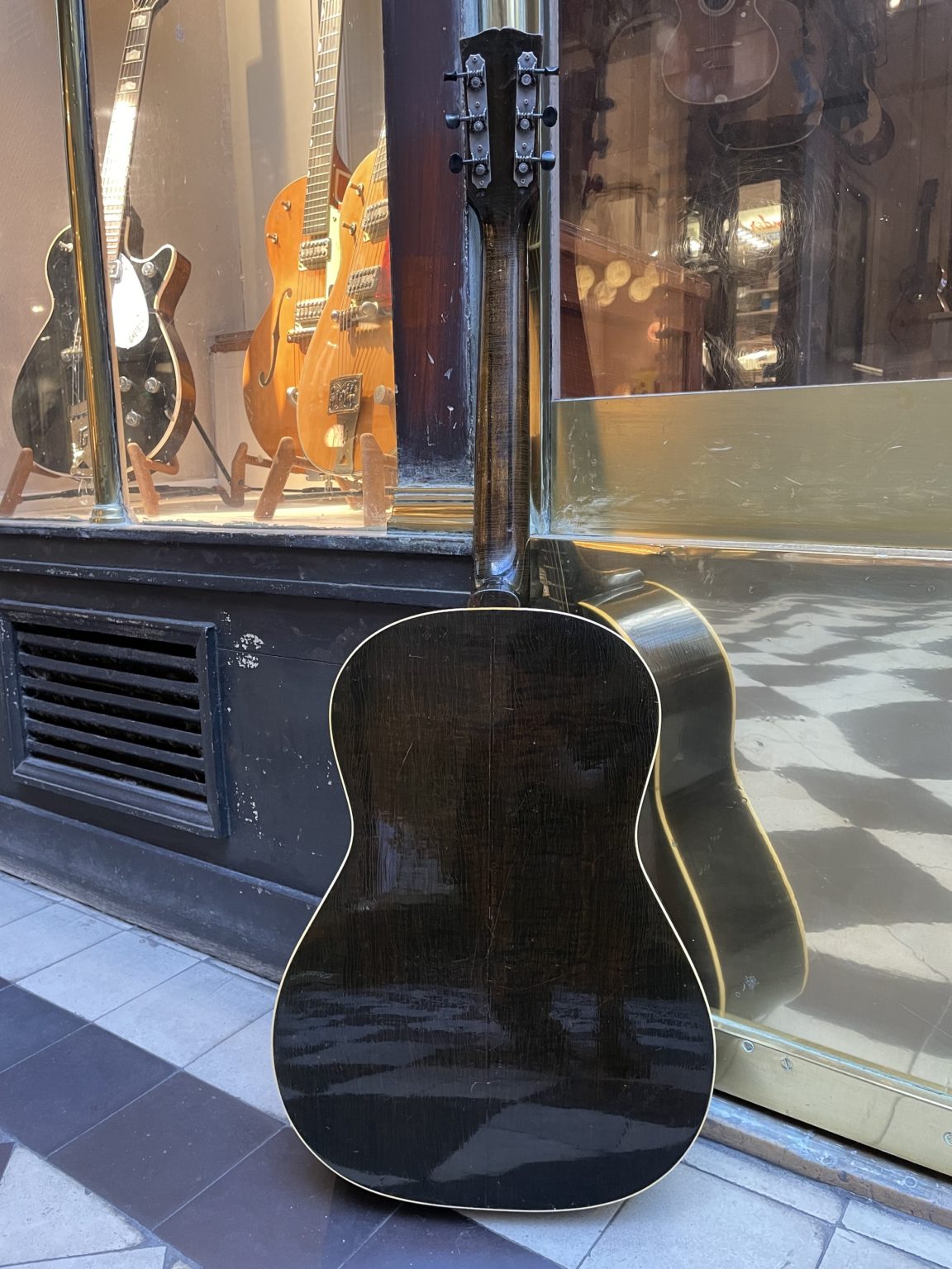 L’état de cet instrument est absolument irréprochable : aucune cassure ou réparation à noter, la finition Sunburst originale, très faïencée, a gardé tout son éclat, le pickguard original est également présent. La guitare a été refrettée dans notre atelier avec tout le soin nécessaire pour préserver la patine originale de la touche, les frettes correspondent également au type employé à l’origine. Tous les éléments de réglage ont été optimisés, les frettes planifiées et polies, les sillets ajustés de sorte à obtenir une action basse et une intonation parfaite. De fait, cette “Banner” pourtant réputée difficile à jouer en raison de son manche rond et épais est extrêmement plaisante et l’on peut aisément passer des heures à apprécier sa sonorité riche en tout confort.