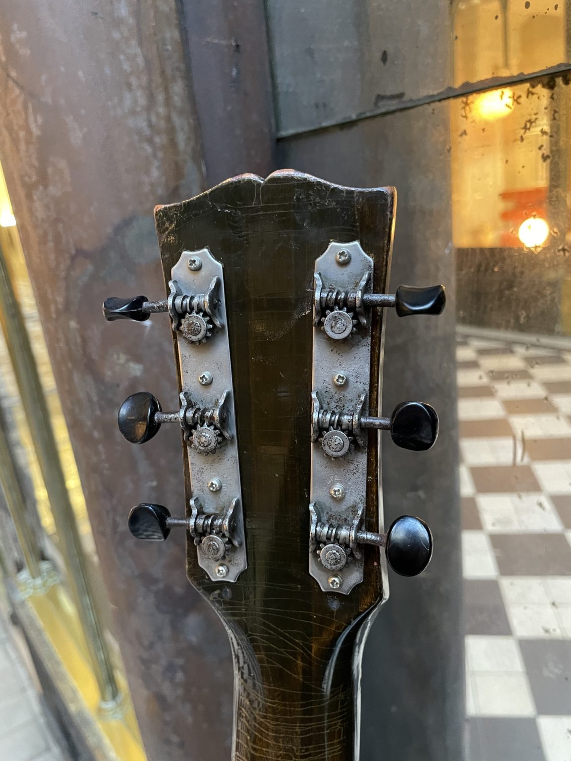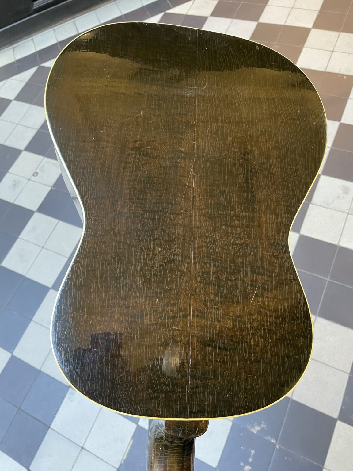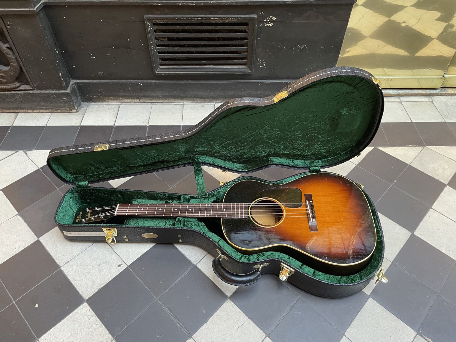 La guitare présentée ici est superbement légère et sonore et incorpore une combinaison de caractéristiques particulièrement intéressantes : on trouve une table en épicéa avec une belle finition Sunburst, là où nombre d’instruments de la période ont été construits entièrement en acajou. La table comprend un barrage en X placé relativement haut sur la table et allégé (c’est le fameux scalloped bracing), associé à un chevalet et une bridge plate réduits en taille : cela permet la vibration optimale de la table d’harmonie et est en grande partie à l’origine du son qui fait la réputation des guitares de cette période. Le fond et les éclisses sont en érable, magnifiquement ondé sur le fond. Autre point intéressant, la touche n’est pas en palissandre mais en gum wood, une essence native du sud-est étasunien et substituée au palissandre en ces temps de rationnement. Tous les bois employés sont donc sourcés directement aux États-Unis ! Le manche en érable est constitué de 5 pièces, et, fortuitement, présente un truss-rod : parmi toutes les restrictions imposées par la guerre, celles sur l’acier étaient particulièrement draconiennes et beaucoup de manches de Gibson de la période sont de ce fait renforcés de blocs de bois à la durabilité questionnable, ce qui n’est pas le cas ici. On note par ailleurs les mécaniques originales Kluson rivetées à une fine plaque de métal, dont la conception a été spécialement révisée en 1943 pour minimiser le métal nécessaire à leur fabrication.