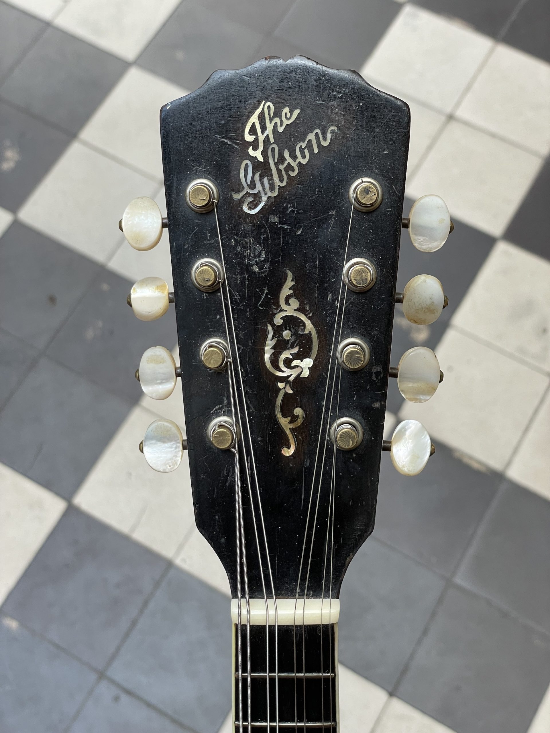 L’instrument est par ailleurs équipé de son chevalet ajustable original en ébène, une grande nouveauté sur les instruments Gibson à l’aune des années 20. Cette pièce, inventée et brevetée par Ted McHugh (le chef d’atelier à l’usine de Kalamazoo de 1915 jusque dans les années 40), vient se substituer au chevalet fixe précédemment employé pour résoudre une problématique inhérente à la construction de mandolines à table sculptée : lorsque les instruments neufs quittaient l’usine, il arrivait fréquemment au cours de leurs premières années de jeu que sous la tension des cordes la table s’affaisse légèrement avant de se stabiliser dans sa forme finale. Or, ce mouvement du bois de la table nécessitait un retour à l’usine ou chez un artisan afin de placer une semelle sous la base du chevalet fixe afin de retrouver la hauteur souhaitée. Le chevalet ajustable répond parfaitement à ce problème, puisqu’il permet de régler la hauteur des cordes librement et à tout moment – ce design est un tel succès qu’on le retrouve encore de nos jours de façon omniprésente sur la grande majorité des guitares archtop ou hollowbody. Notons que Ted McHugh est également à l’origine du truss-rod, invention pour laquelle il obtient un brevet en 1923, cet autre élément étant tout aussi central au développement de la guitare au 20ème siècle et toujours systématiquement employé jusqu’à aujourd’hui. Ainsi, on se rend compte à quel point la mandoline aura été un vecteur d’innovation et de modernité pour les décennies à venir, évidemment pour Gibson mais également pour l’industrie de facture instrumentale dans son ensemble qui s’appropriera et améliorera les concepts établis à Kalamazoo, il y a déjà un siècle !