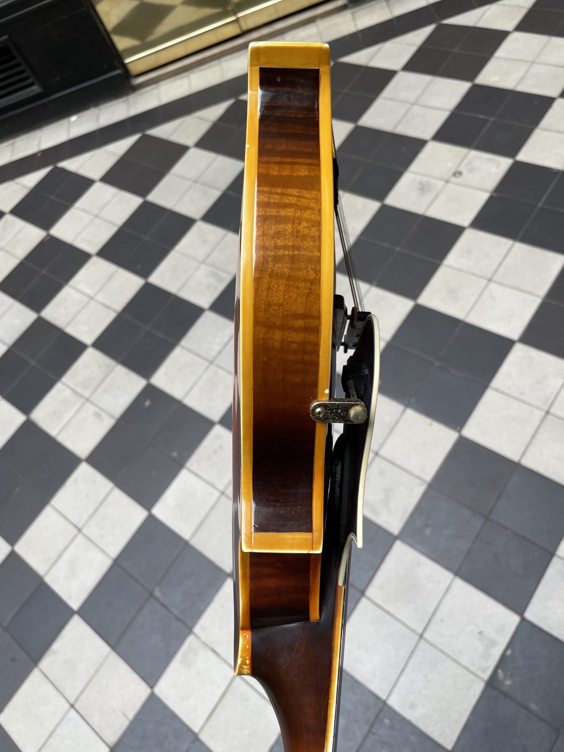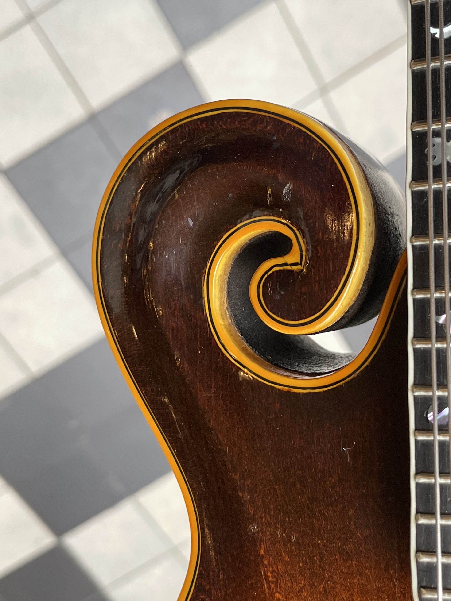Ayant été pensée comme un modèle professionnel, on trouve une touche dotée de 21 frettes avec une extension sous les cordes aiguës allant jusqu’à la 30 frette et permettant de jouer dans une tessiture plus haute encore ; le bout de touche étant surélevé par rapport à la table, l’angle d’appui des cordes sur le chevalet est accru en proportion, augmentant la puissance sonore de l’instrument ; la caisse de l’instrument, constituée entièrement de bois massifs sculptés (épicéa pour la table d’harmonie et érable pour le fond et les éclisses) et dotée d’ouïes en forme de f à la manière d’un violon, est conçue de telle sorte à pouvoir offrir une tonalité riche et égale depuis la note la plus grave jusqu’à la plus aiguë. Les mandolines Gibson des années 70 sont communément décriées, surtout par rapport à leurs équivalents des décennies précédentes, or force est de constater que la facture de cet exemplaire ne laisse rien à désirer aux productions antérieures (si ce n’est un ou deux zéros supplémentaires au prix !) : naturellement, la construction met en oeuvre des matériaux de première qualité ; on observe à travers les ouïes la finesse de la table d’harmonie, révélant la maîtrise de l’artisan ayant sculpté à la main les parties constituant l’instrument ; le son est net et tranchant, équilibré dans toutes les positions de jeu. Un point intéressant à noter sur les F-5 de cette époque est que l’on retrouve pour la première fois depuis la période pre-war certains attributs décoratifs : le logo traditionnel The Gibson incrusté sur la tête au-dessus du motif dit flowerpot ou pot de fleur (initialement la mandoline F-5 était ornée d’un motif plus élaboré dit fern, le flowerpot fait néanmoins partie des principaux marqueurs visuels des modèles Gibson haut-de-gamme puisqu’il est notamment employée sur la guitare L-5), ainsi que les incrustations de touche en abalone aux motifs floraux. Le reste de l’accastillage consiste en un jeu de mécaniques gravées et plaqué or ; un cordier caché et gravé du nom The Gibson (initialement doré, le placage ici s’est estompé suite à l’usure liée au jeu) ; un pickguard en plastique tortoise reprenant la forme de pointe de la table d’harmonie ; un chevalet ajustable en ébène, reprenant le style des pièces employées depuis les années 20.