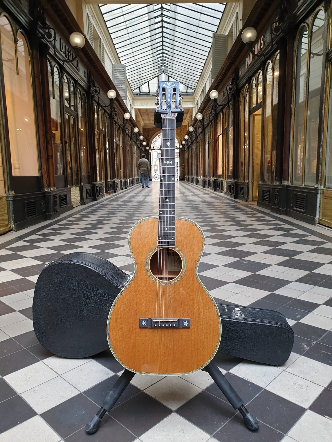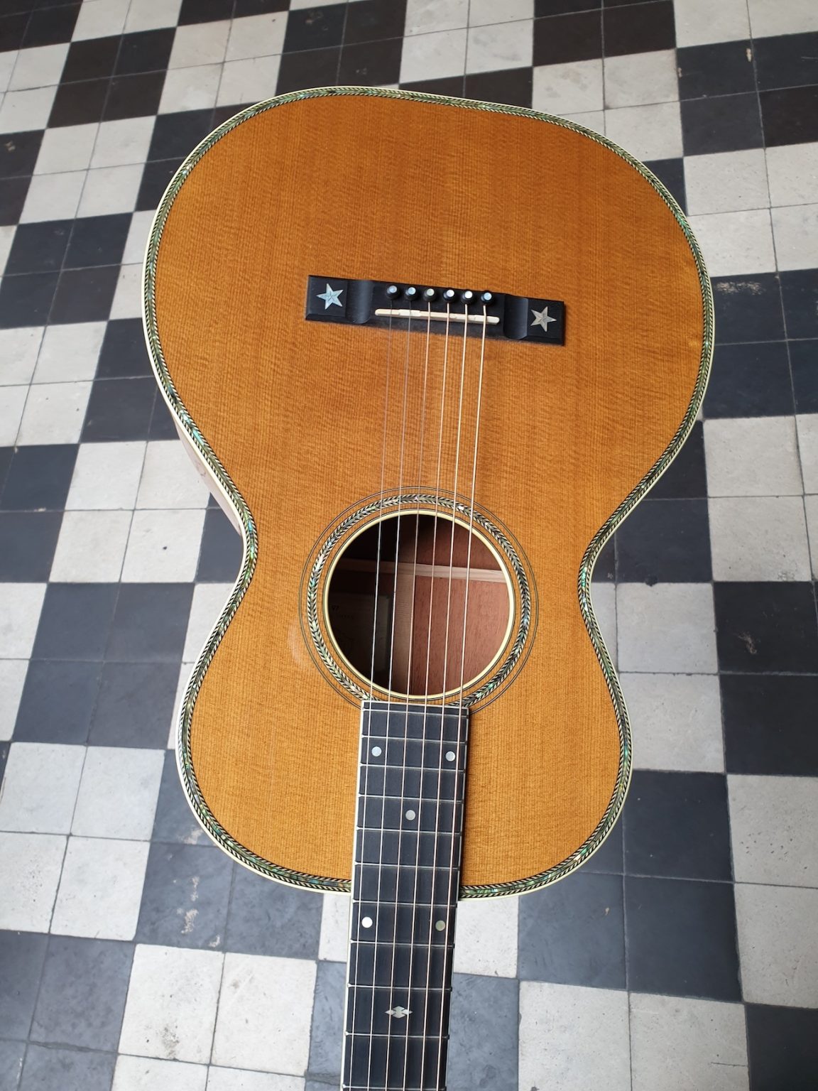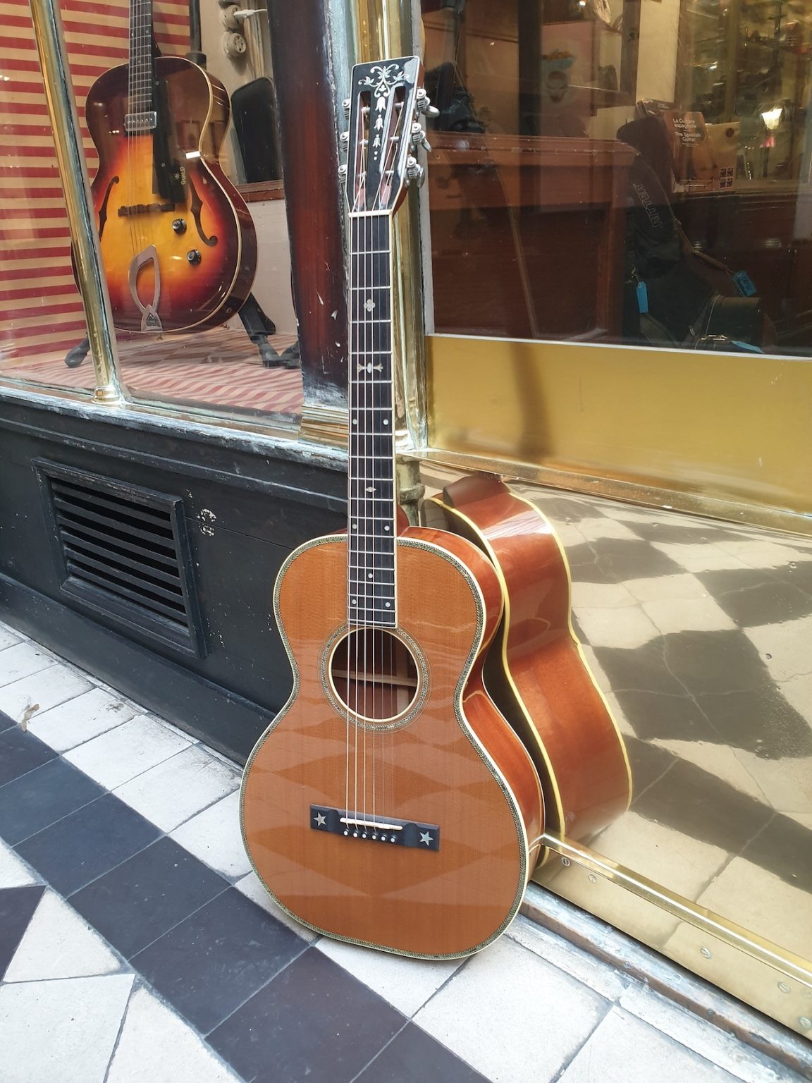 Une petite guitare en reproduction des modèles classiques des Larson Brothers, avec une table en épicéa et fond et éclisses en acajou, une belle fileterie et incrustations en perle.