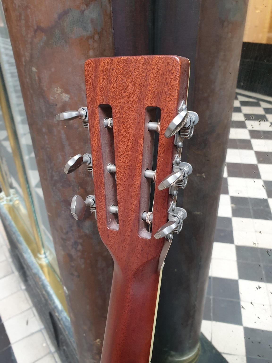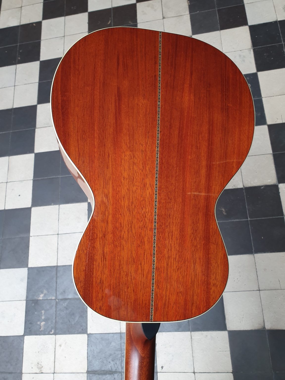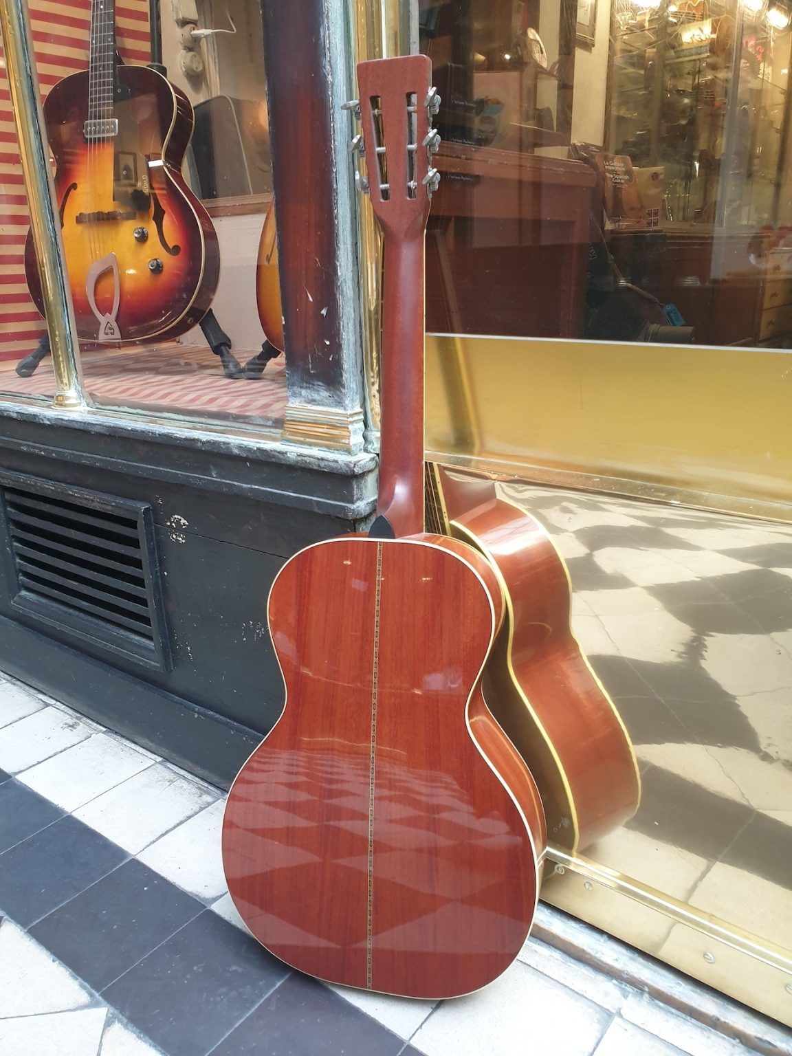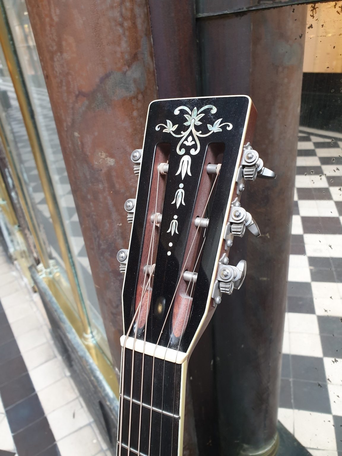 Une petite guitare en reproduction des modèles classiques des Larson Brothers, avec une table en épicéa et fond et éclisses en acajou, une belle fileterie et incrustations en perle.