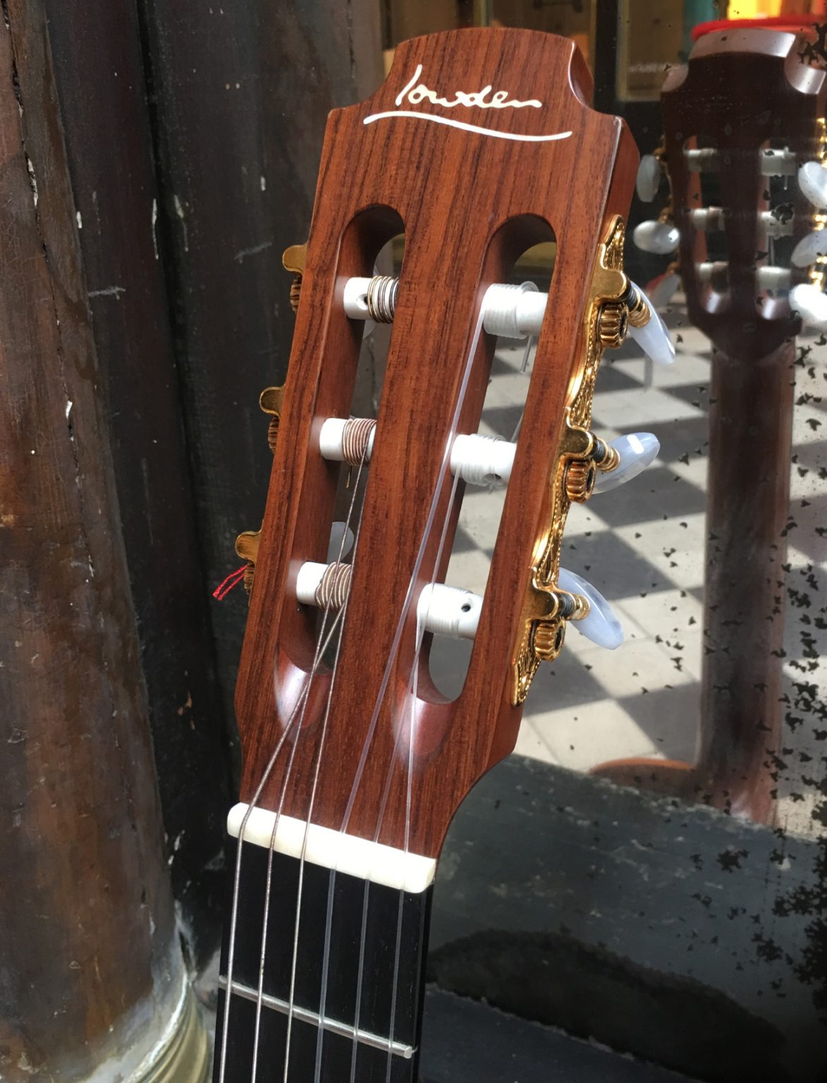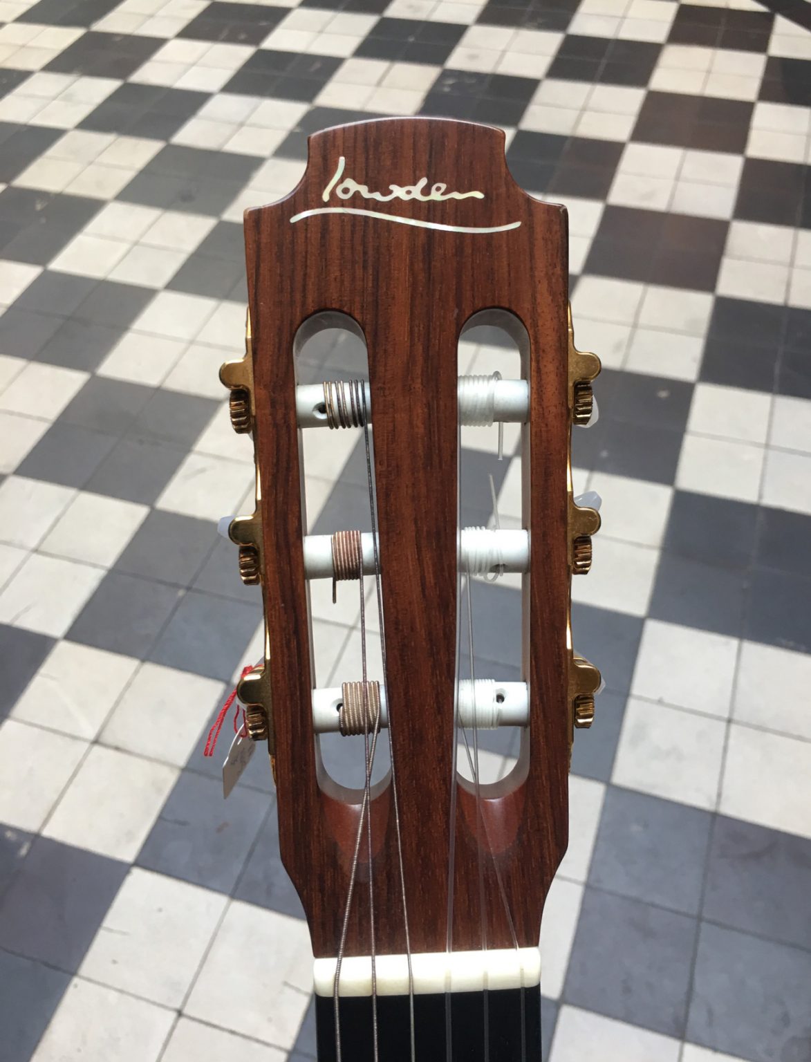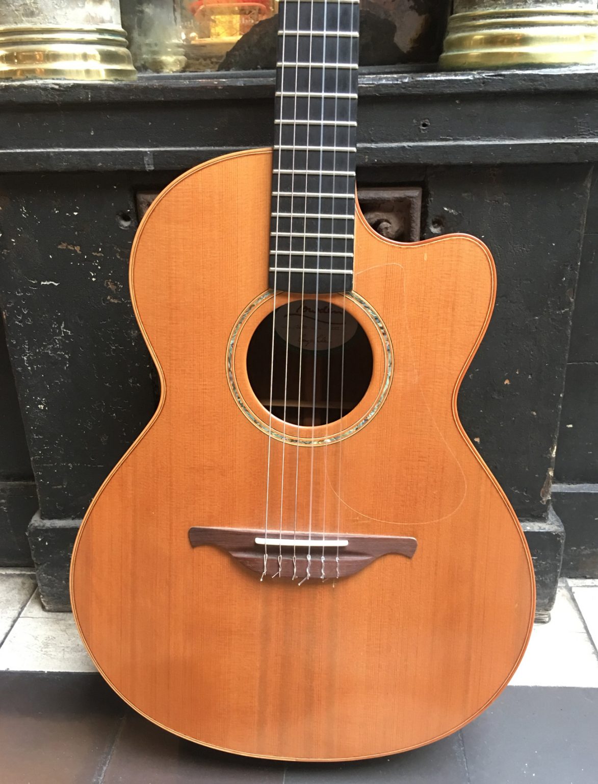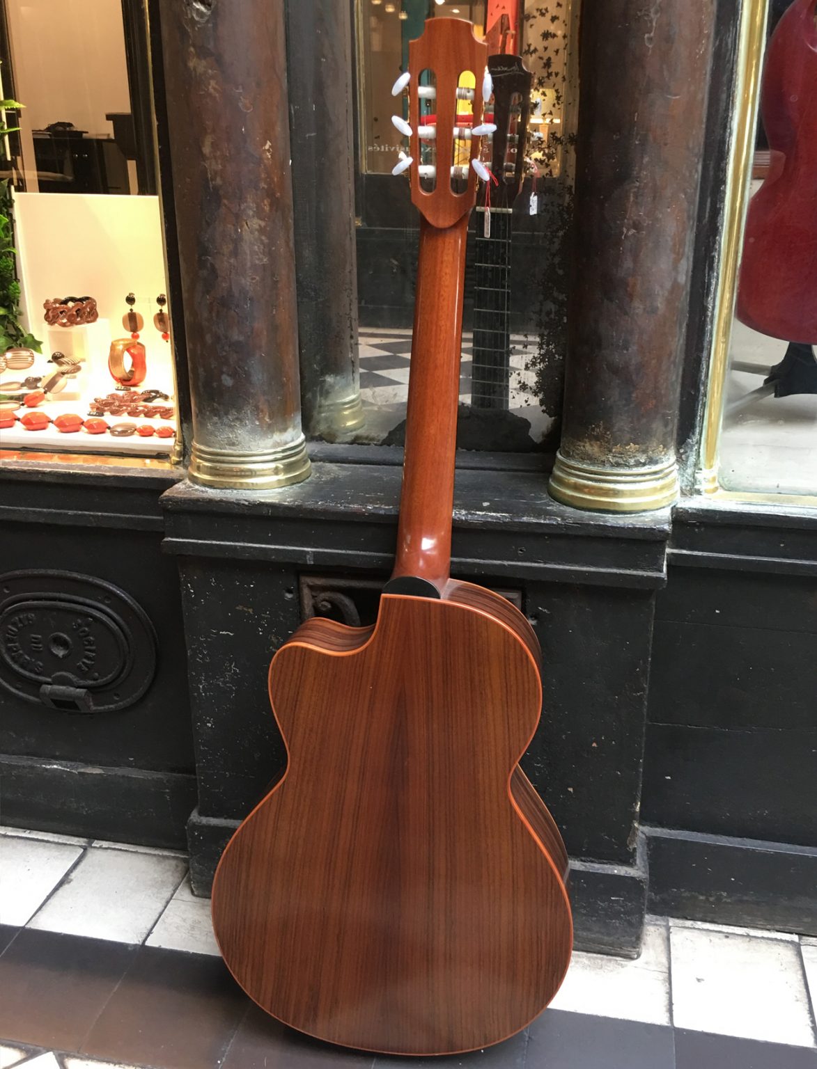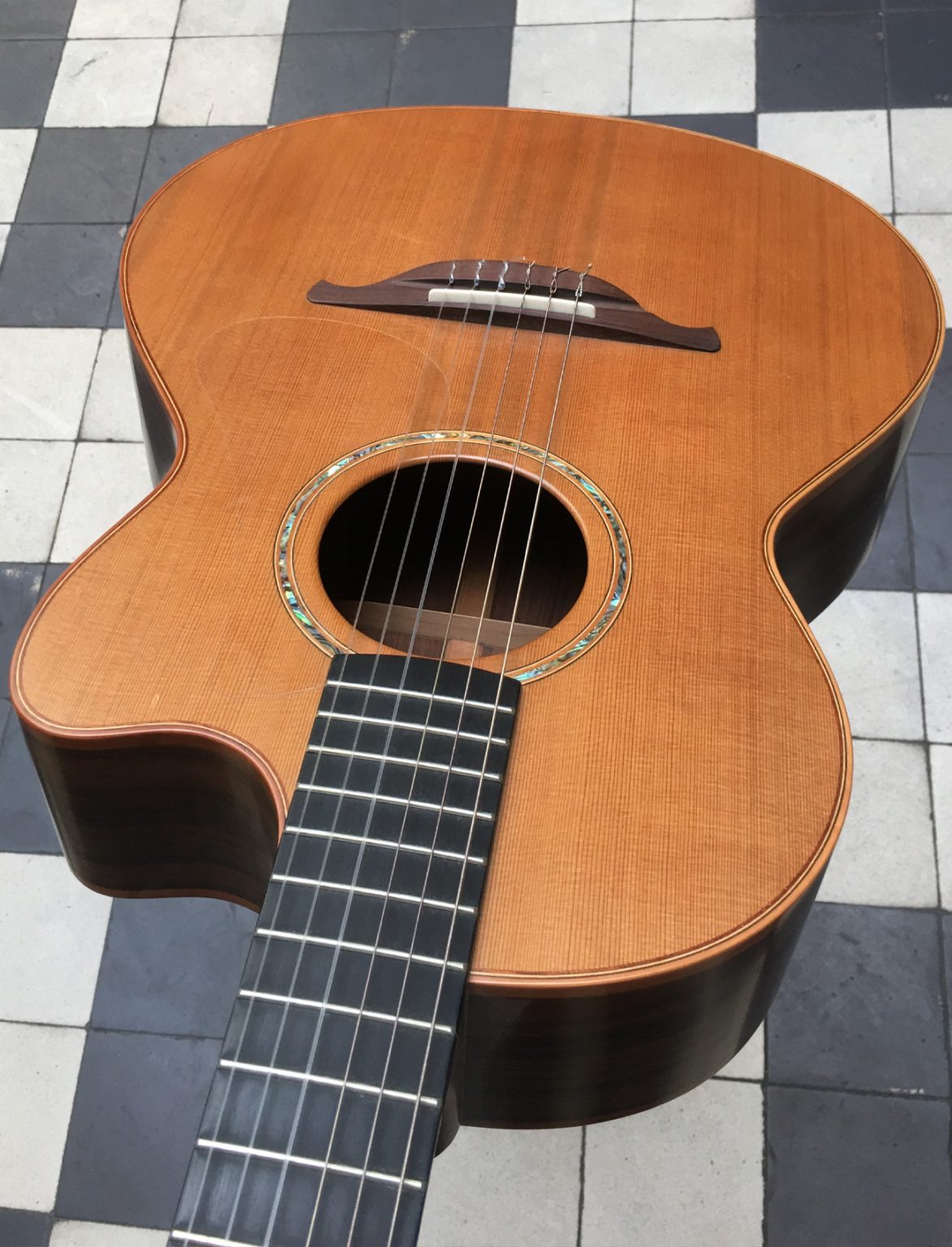 Guitare cordes nylon “crossover” électro-acoustique. Jonction à la 14 ème frette, barrage en X. Table en cèdre, fond et éclisses en palissandre indien, touche ébène.