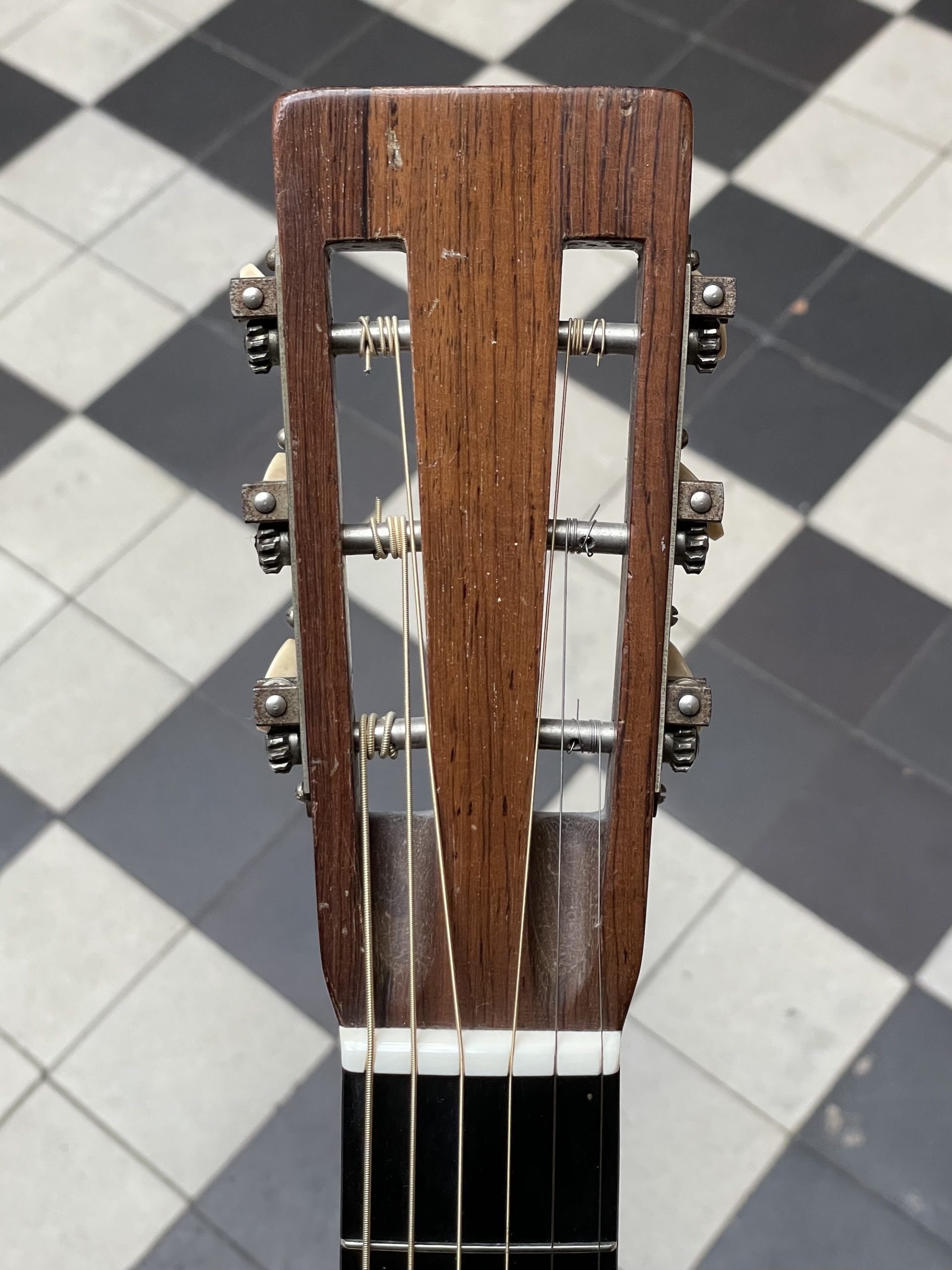 La 0-28K était un modèle plutôt luxueux, placé juste en-dessous du style 00-40H, modèle haut-de-gamme richement ornementé de filets en nacre, avec fond et éclisses en palissandre de Rio. Commercialisé pour la première fois en 1917, elle est officiellement cataloguée en 1923. L’exemplaire présenté ici date de 1927, et fait partie des 175 guitares identiques expédiés cette année-là – il s’agit d’ailleurs du pic de production du modèle, la production totale s’élevant à 641 exemplaires, faisant de cette guitare l’une des plus rares variations des instruments de taille 0 puisque la production sera interrompue à la mi-temps des années 30. À partir du milieu des années 20, Martin commence à livrer leurs modèles hawaïens configurés pour le jeu au slide, sauf demande expresse de l’acheteur pour que l’instrument soit réglé pour le jeu spanish. Ainsi, à sa sortie de l’atelier de Nazareth, cet instrument était doté d’un sillet de tête et d’un chevalet surélevés, ainsi que d’un sillet de chevalet non compensé. Comme c’est le cas sur nombre de ces guitares, les sillets et chevalet ont été ultérieurement retravaillés afin de les réduire en hauteur et abaisser l’action des cordes de sorte à pouvoir jouer dans le style spanish conventionnel. Nous observons par ailleurs que le barrage de l’instrument, bien que scallopé (c’est-à-dire sculpté sur son arête supérieure afin de l’alléger), présente une construction plus robuste comparé à des instruments non-hawaïens de la même époque, pour beaucoup encore conçus pour le jeu en cordes boyau – on voit donc que dès les années 20 Martin avait pensé au renforcement de leurs modèles dotés de cordes acier pour pallier les déformations de la table d’harmonie liées à la tension accrue des cordes.