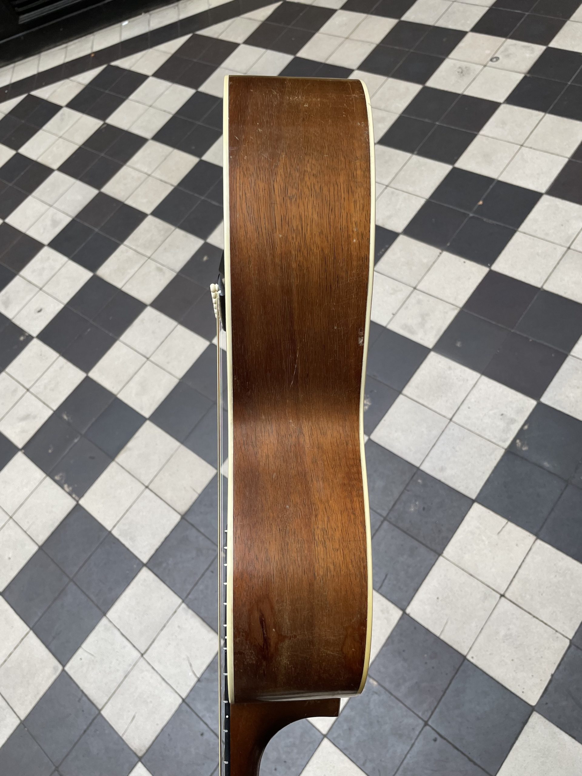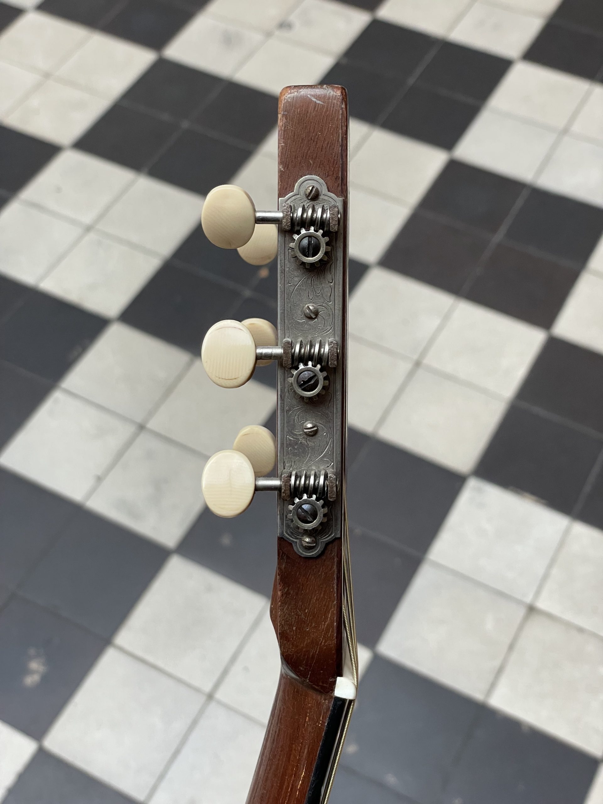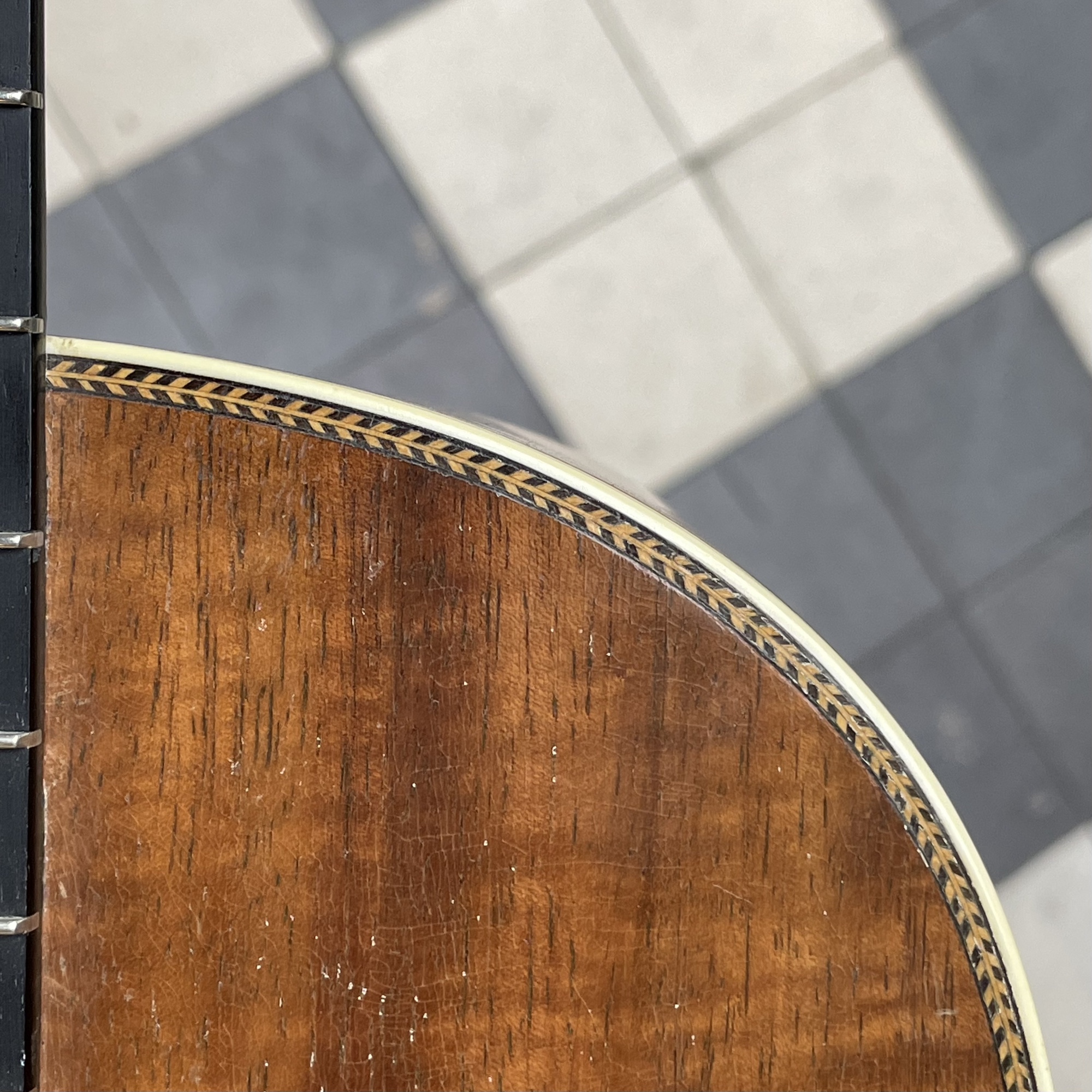 Cette guitare présente en outre les mêmes dimensions et caractéristiques générales qu’une Martin 0-28 standard de 1927, à l’exception de sa caisse constituée en bois de koa au veinage exceptionnel, au lieu de la combinaison traditionnelle épicéa / palissandre de Rio. Les filets de caisse sont plastique ivoroïde, avec le célèbre motif herringbone sur le pourtour de la table d’harmonie, signature classique du Style 28. On relève également des éléments de construction typiques d’une guitare Martin pré-années 30, avec une jonction de la caisse et du manche à la 12ème case, une tête ajourée, et un frettage en frettes barres. Enfin, on retrouve les belles mécaniques Waverley gravées originales ainsi que le chevalet en ébène dans le style dit pyramid bridge. L’instrument demeure à ce jour en superbe état de conservation, avec quelques traces d’usure liées au jeu mais globalement intact malgré ses 98 ans ! Nous nous sommes appliqués à la complète réfection de son état de jeu : planimétrie des frettes avec arrondissement des arêtes saillantes des frettes barres et polissage ; ajustement de l’action et de l’intonation aux sillets ; nettoyage complet de la guitare.